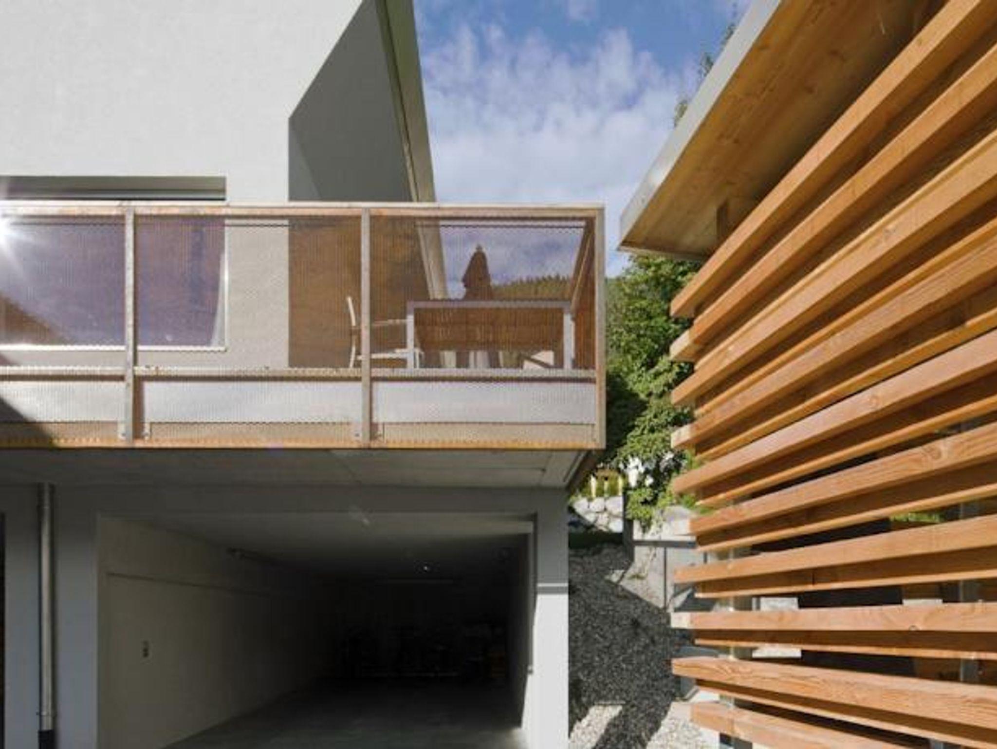 Schräg ist der Giebel, schräg ist die Sauna, von der Sie Ihren Lieben in die Suppe schauen können. Ein langer Balkon zum Frühstücken. Wer mag steigt durch das Beet in den Garten - schräg eben.
