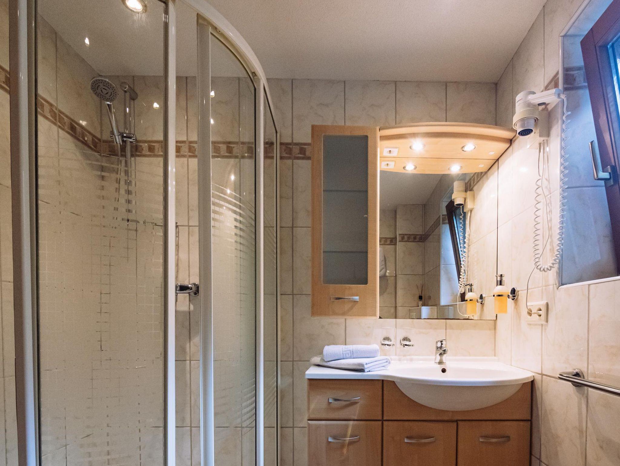 Badezimmer mit Dusche und WC, Fön, Handtücher