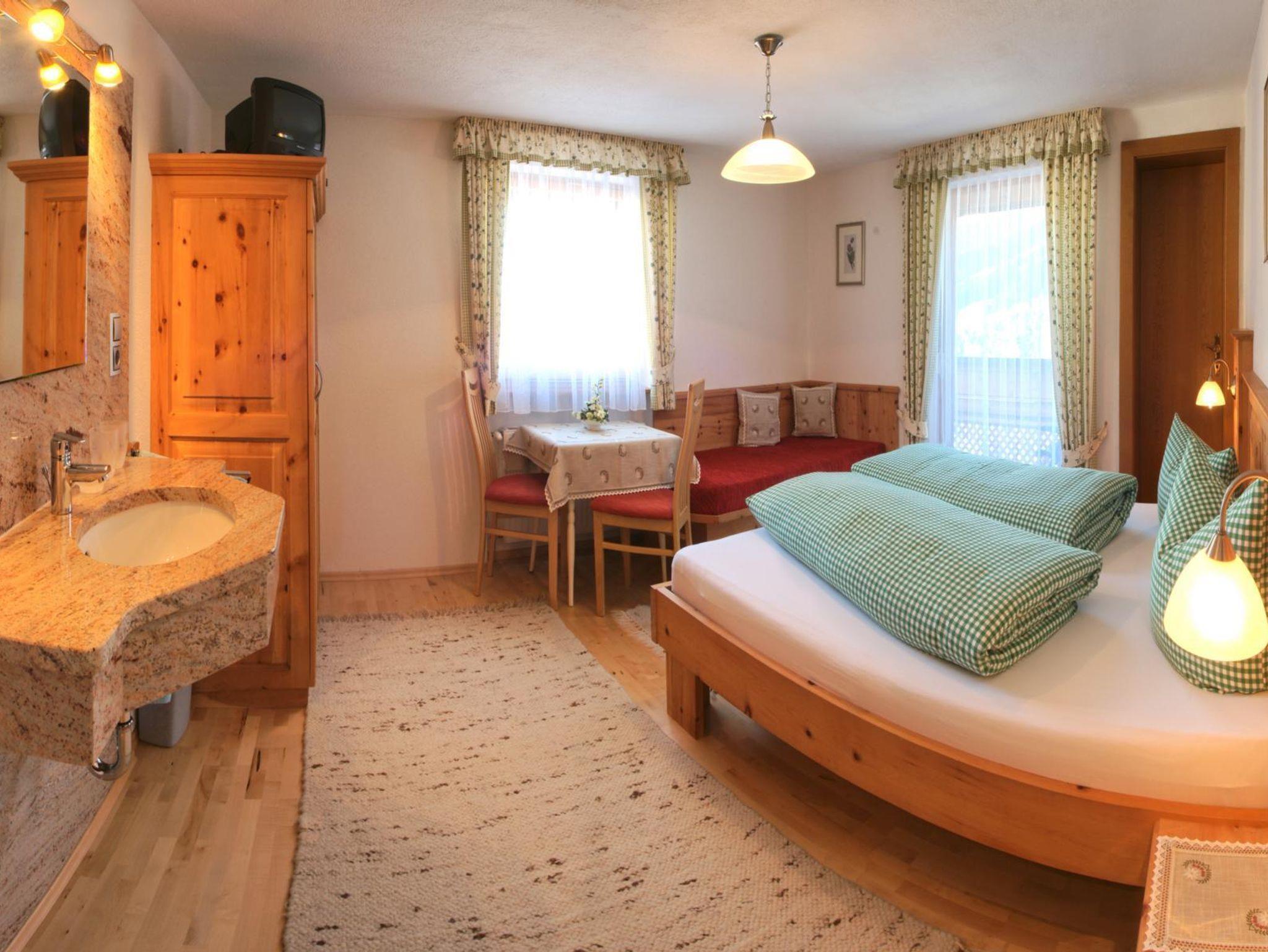 Komfortferienwohnung Panoramablick 75 m2: 1 Dreibettzimmer mit Dusche, WC und Balkon 1 Doppelzimmer mit Dusche und WC natürliche und gesunde Ausstattung mit heimischem Zirbenholz komfortable Wohnküche mit allen Geräten, Radio und SAT-TV Balkon nach Osten, Süden und Westen umfangreiche Baby- und Kleinkinderaustattung Kinderspielzimmer mit vielen Spielsachen im Erdgeschoß Brötchenservice