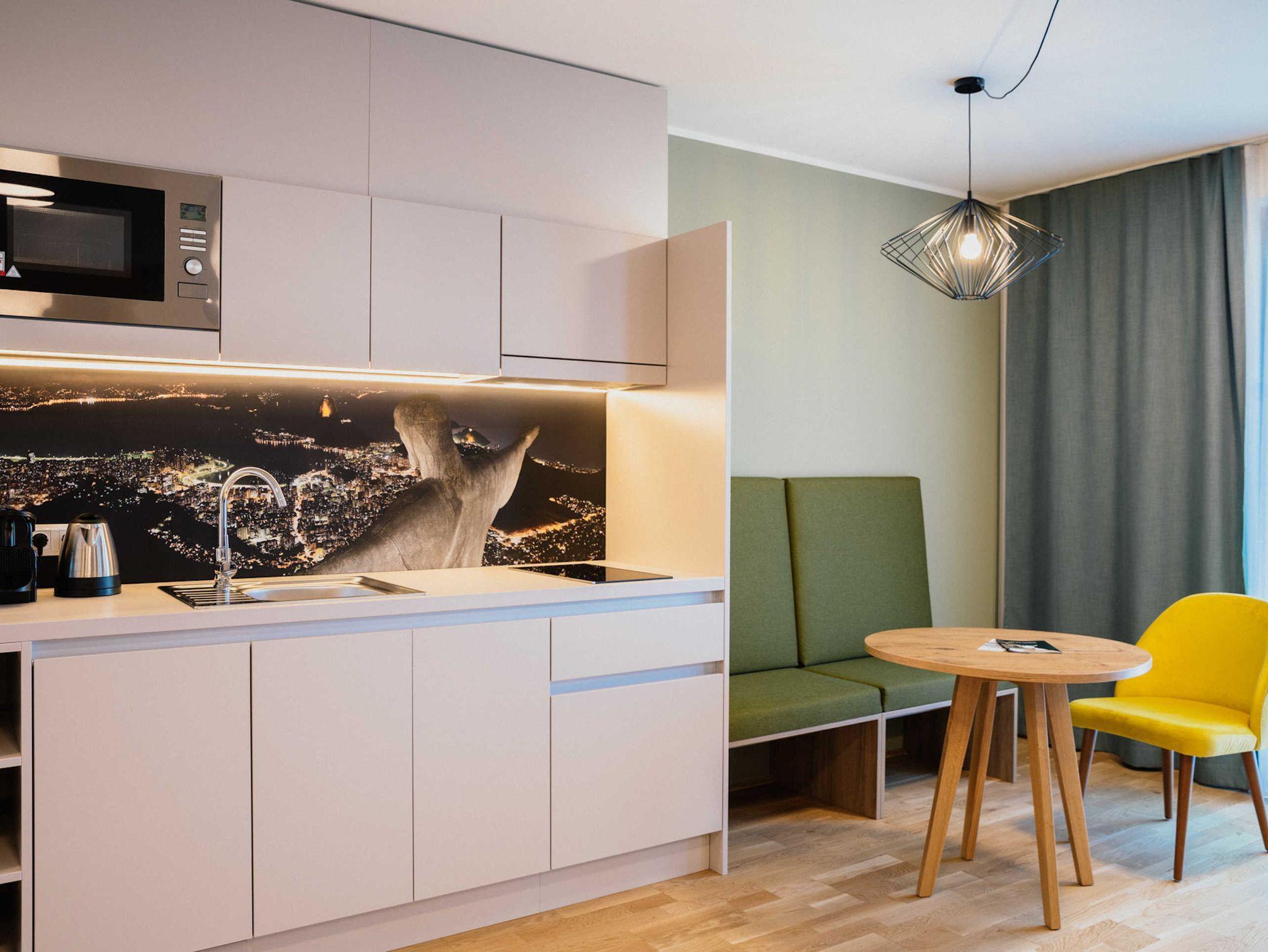 Wer möchte, kann sein Office im gemütlichen Coworking-Space eröffnen, sich zum Dinner in der eigenen Apartmentküche austoben und uns später mit Caipi in der Hand an der Bar »Saúde!« zurufen.