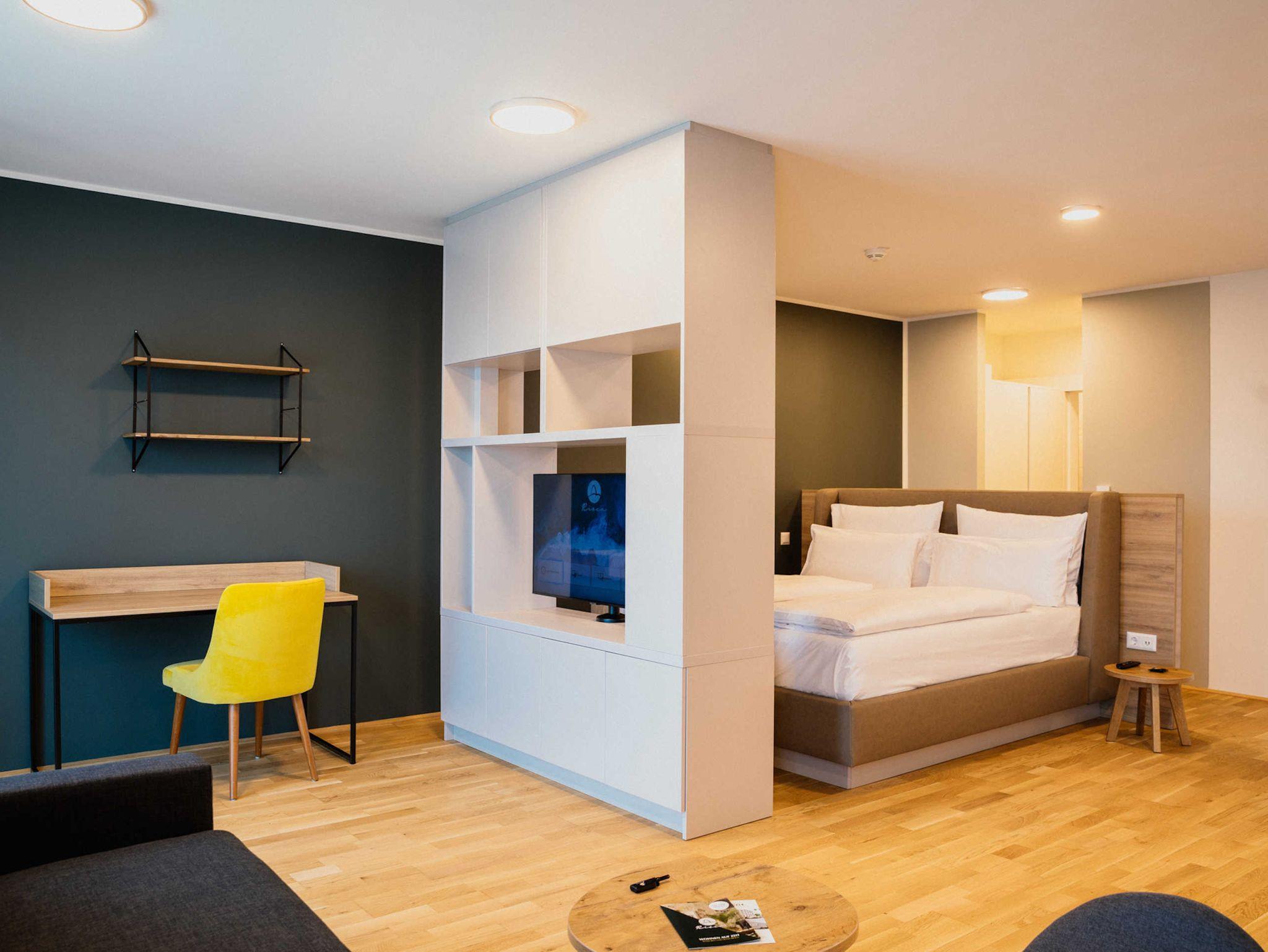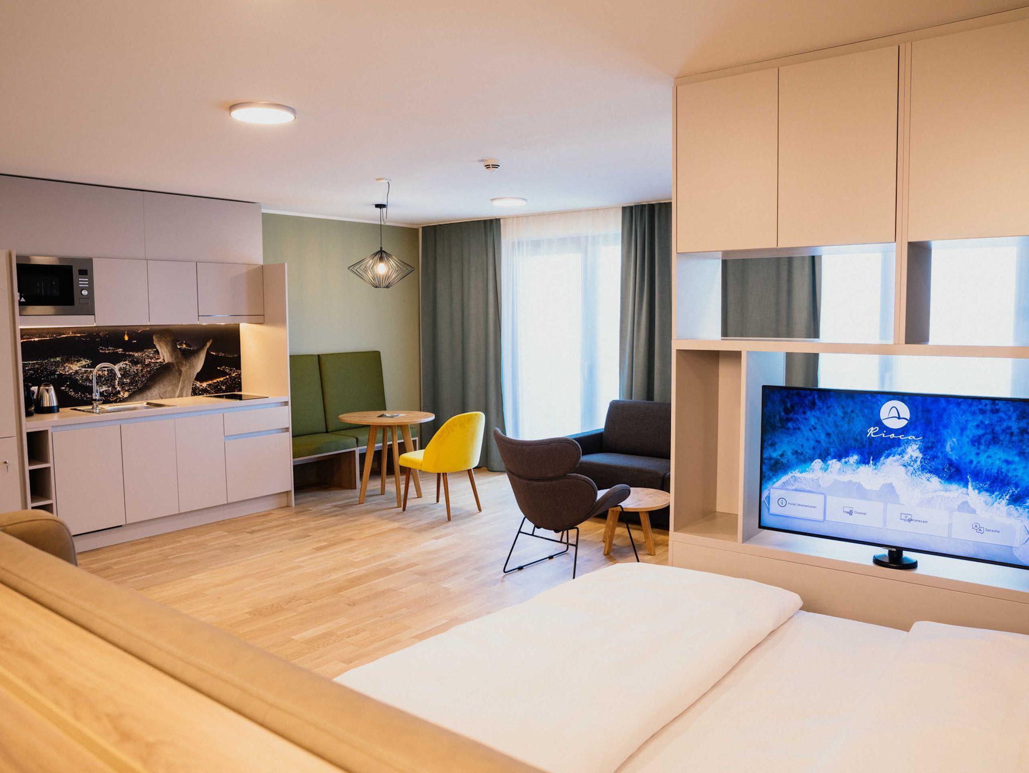 Mach es Dir gemütlich und entdecke Deinen neuen Lieblingsplatz in Deinem eigenen Zuhause auf Zeit. Das ca. 48 m² große Apartment vereint mit einem großzügigen Balkon und einer Apartmentküche all das, was man sich für einen komfortablen und längeren Aufenthalt wünscht. Genieße die entspannende Regendusche und zaubere Dir nach Herzenslust Dein Lieblingsgericht in Deiner eigenen Küche. Danach fällst Du in das große 1,80 m breite Bett oder Deine gemütliche Schlaf-Couch und schaust einen Film auf einem 4K-Smart-TV. Dein Apartment verfügt außerdem über hochwertiges Echtholzparkett und ein modernes Bad mit teils separater Toilette.