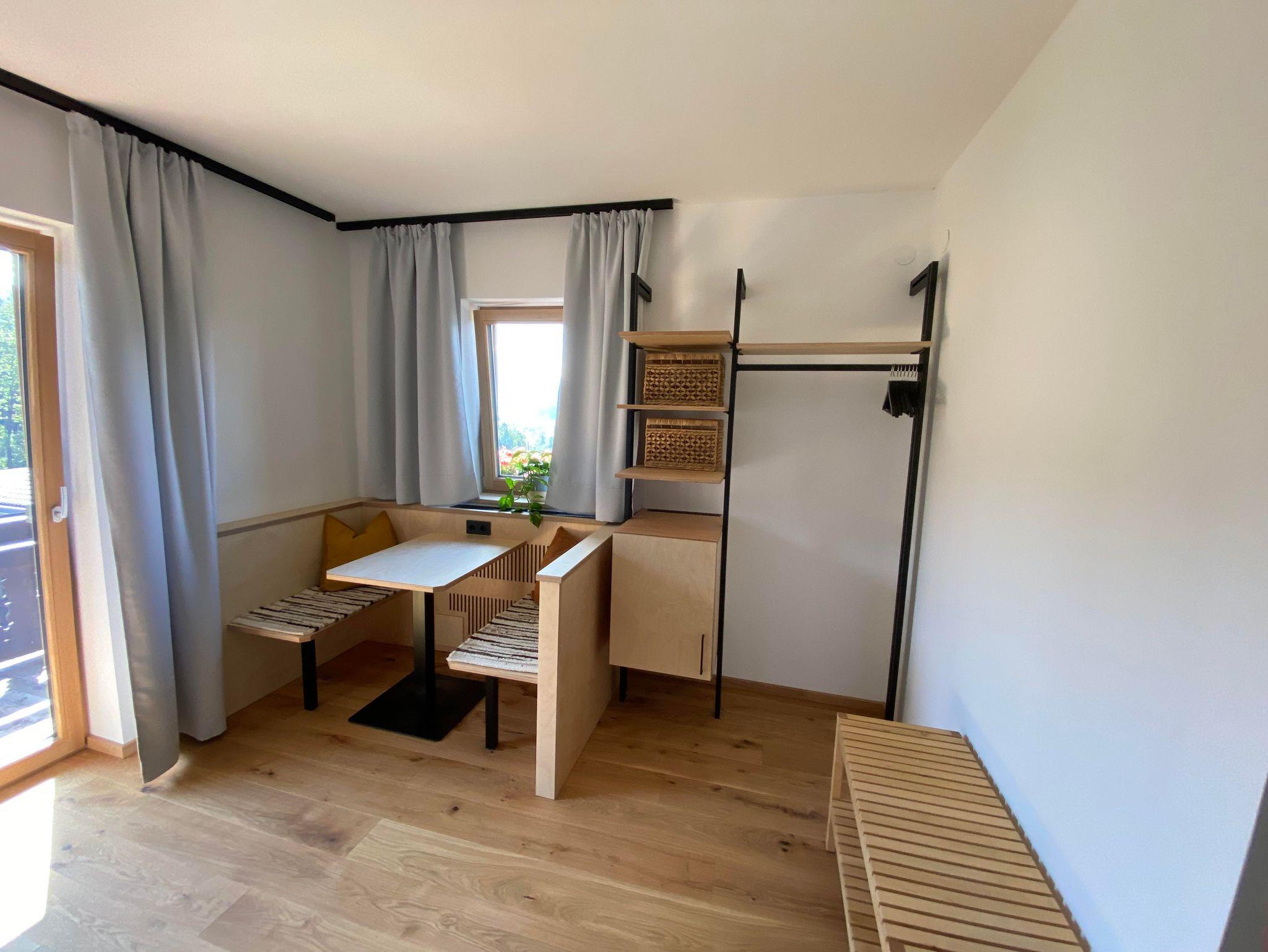 Generalsaniertes Doppelbettzimmer mit einer Küchenecke, ein Mix aus alten und neuen Elementen. Ca 100 Jahre alte Wandtäfer (welche ca. 50 Jahre in einer Garage als Wandteiler mißbraucht wurden) wurden vom Chef persönlich zu einer Garderobe bzw. einer Schiebetür upgecyclt. Ein uralter Tisch bzw. Stühle bekamen ebenfalls ein zweites Leben verpasst.