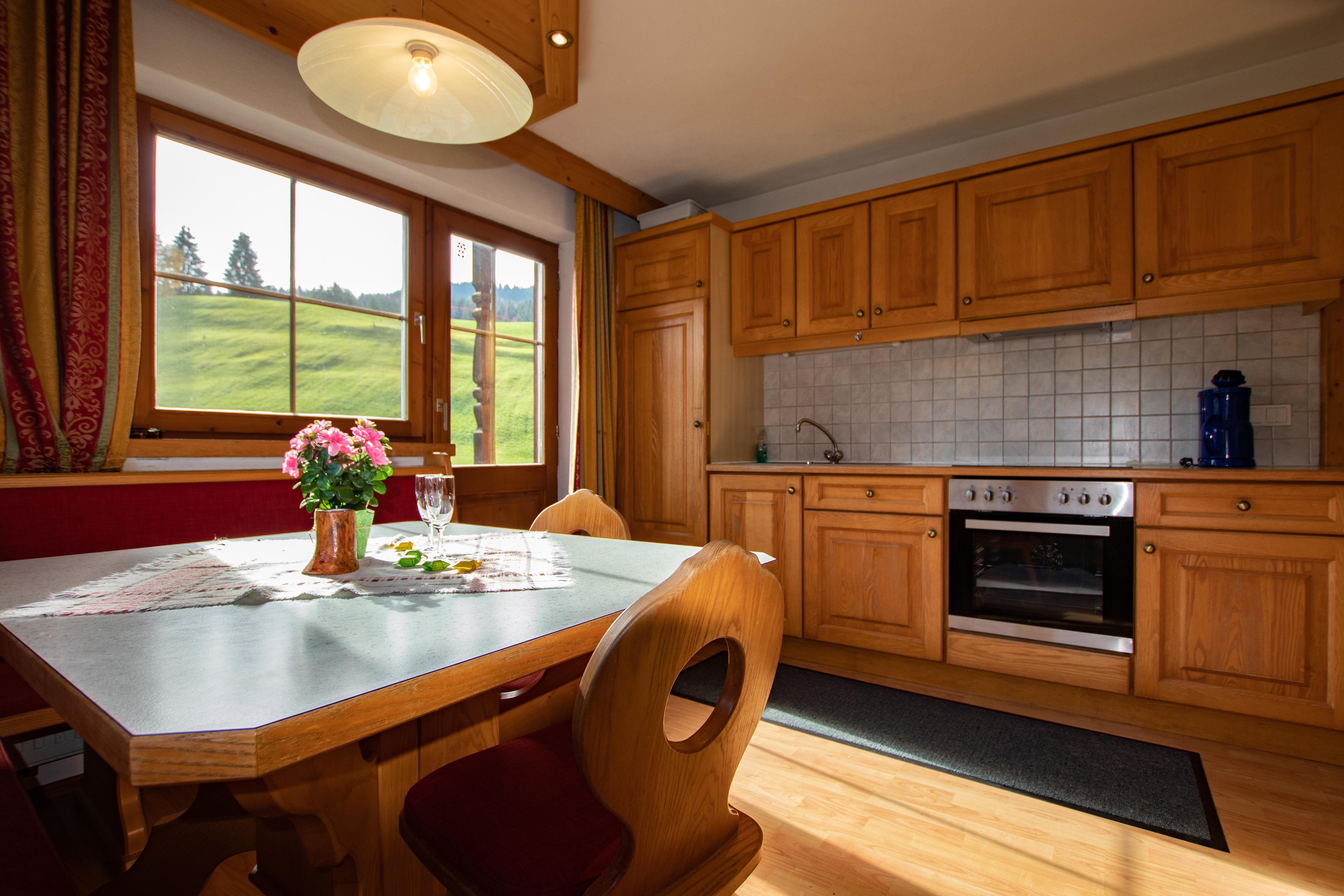 Gemütliche Ferienwohnung für 2-4 Personen im 1OG, 1 DZ , 1 DZ mit zwei Einzelbetten, Wohnküche mit Eckbank und Stühlen, Ausgang zum Balkon. Dusche nur zugänglich von einem Schlafzimmer, 1 Sep/WC. Küchenausstattung: 4 Platten Ceranfeld, Backofen, Mikrowelle, Kühlschrank, Kaffeemaschine, Wasserkocher, Toaster.