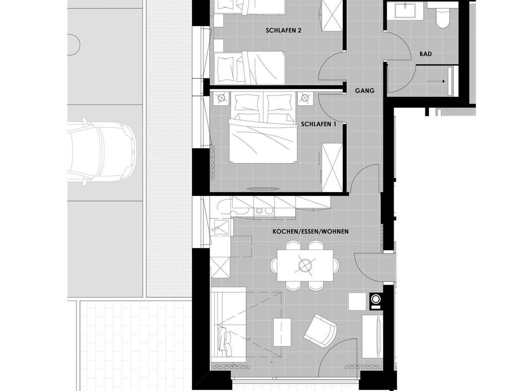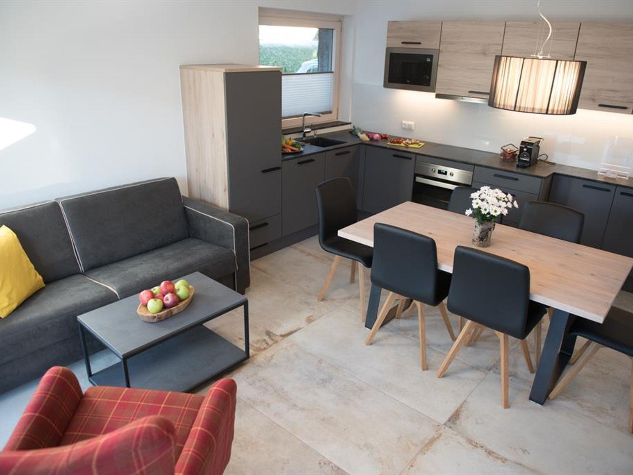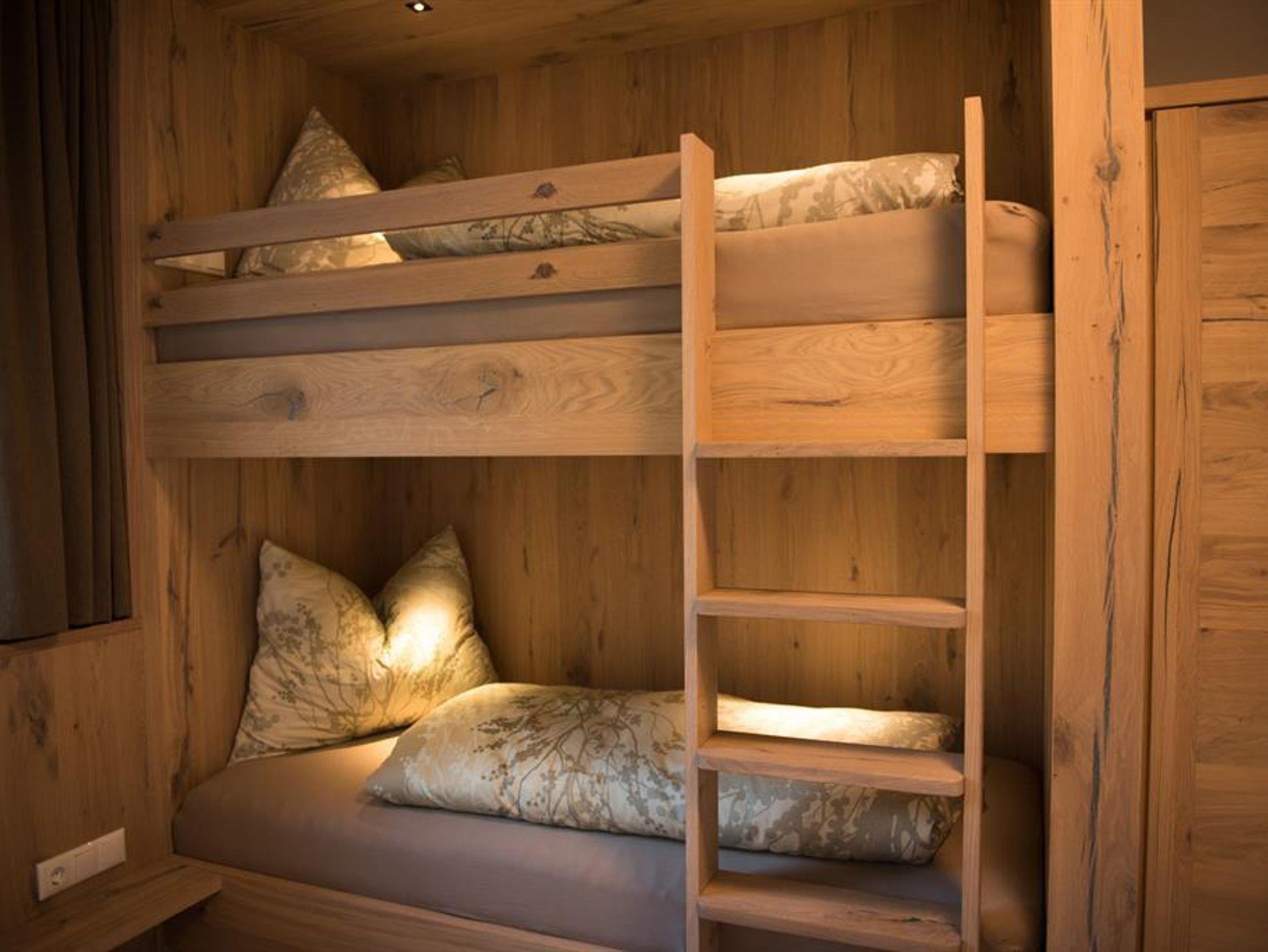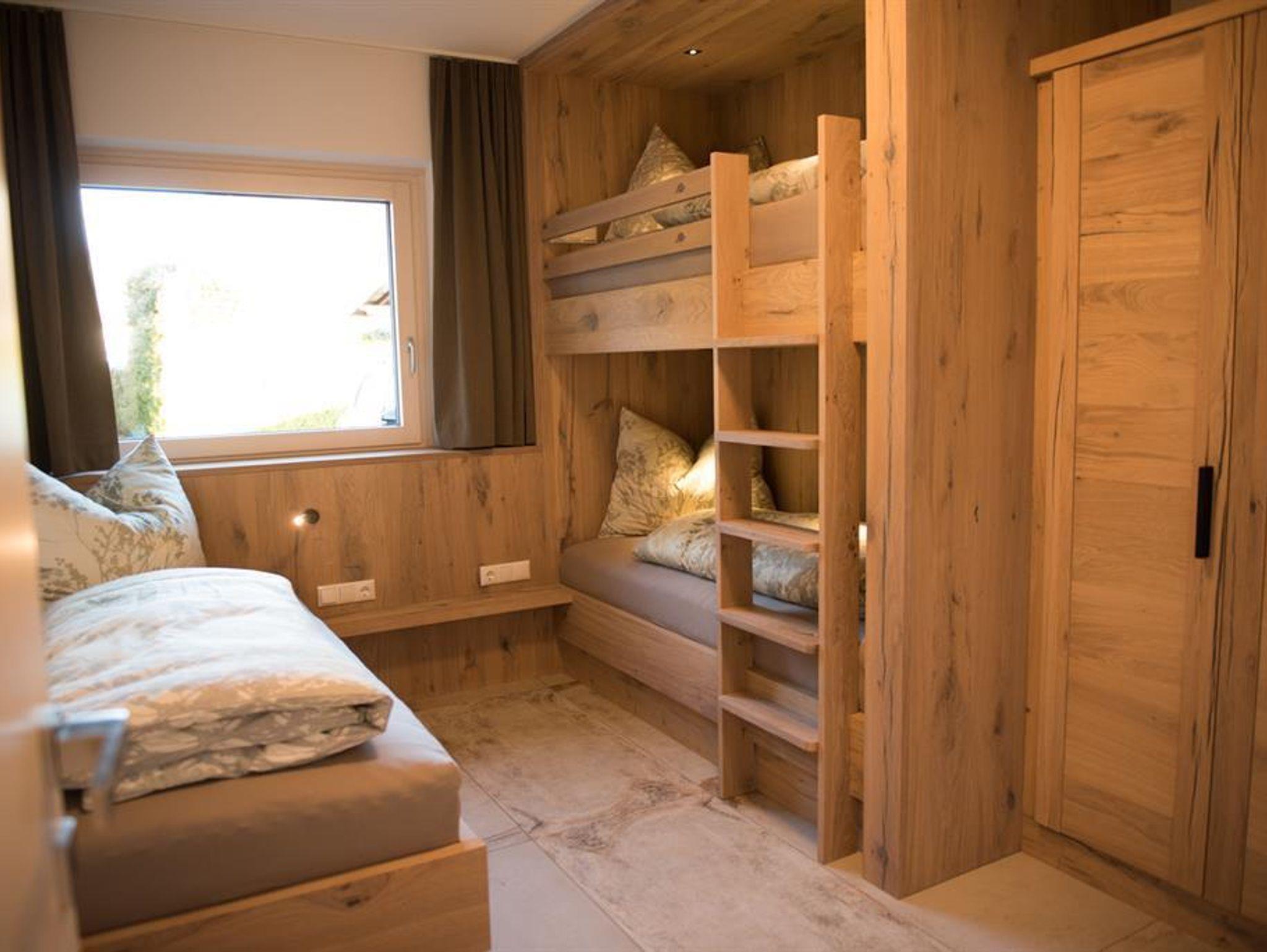 Das modern-rustikal eingerichtete Appartement besteht aus 2 Schlafzimmer (1 x Doppelbett / 1 x Dreibettzimmer mit hochwertigem Stockbett), 2 Bäder mit Dusche und WC, großer Wohn- und Kochbereich mit einer ausziehbaren Schlafcouch, die mit einem Handgriff in ein vollwertiges Doppelbett für 2 Personen umfunktioniert werden kann, Abstellraum und Flur.