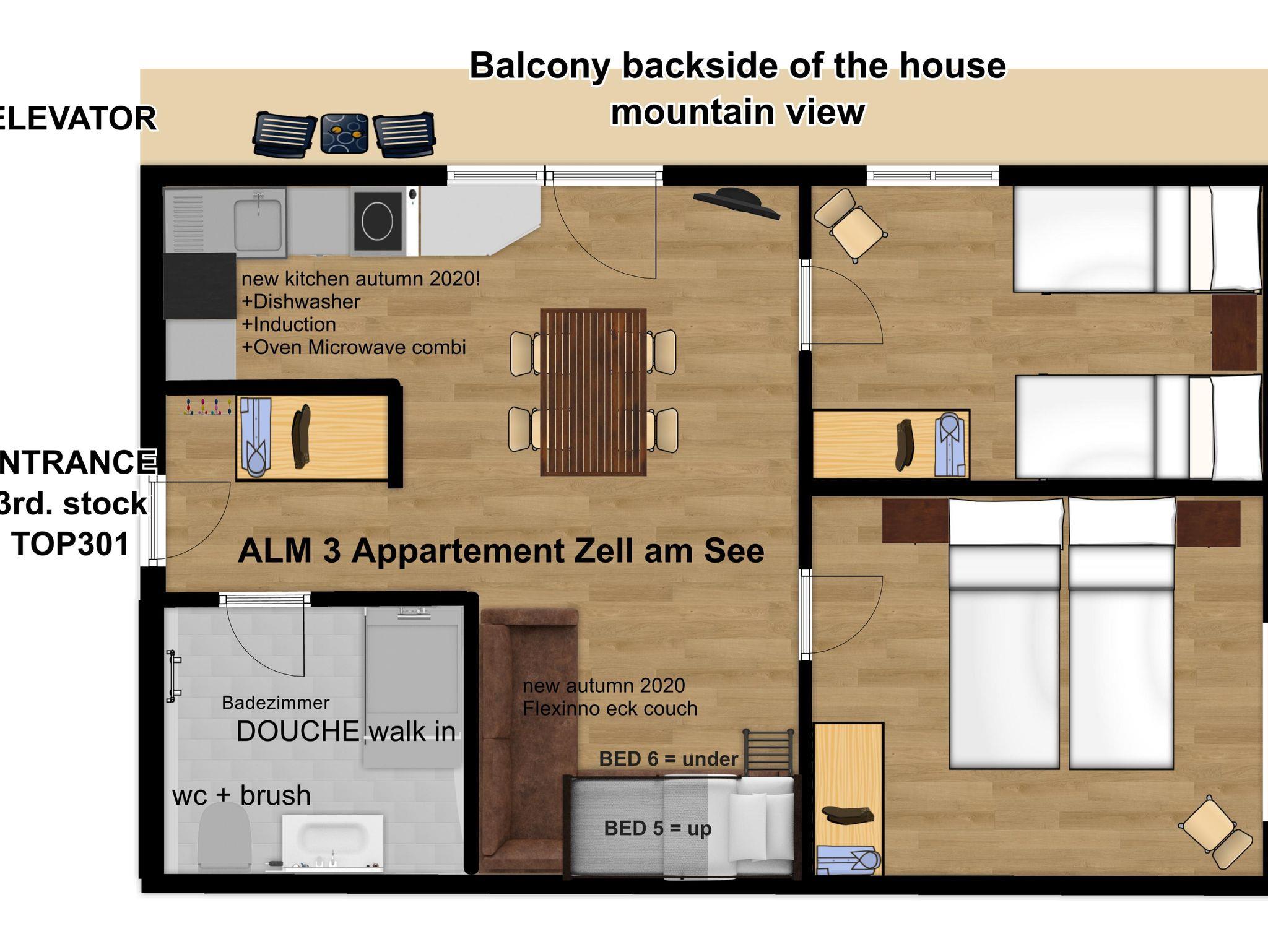 ALM 1 für bis zu 6 Personen mit 3 Schlafzimmer (3 x 2 Bett) und extra Schlafmöglichkeit in Living mit 2 single Couchbetten. 80 m² im Dachgeschoß vom Haus, Erreichbar mit Aufzug, 1. Badezimmer mit Dusche WC und Bidet, Klimaanlage im Wohnzimmer, Flatscreen kabel TV im Wohnzimmer mit Chrombox, Extra WC, gratis Parken für max 2 Autos und gratis WIFI. Wohnküche komplet ausgestattet mit Geschirrspüler, Backofen, Induktionskochfeld. Balkon mit tollen Blick zum Gletscher Kitzsteinhorn und zur Areitbahn, Bushaltestelle gegenüber.