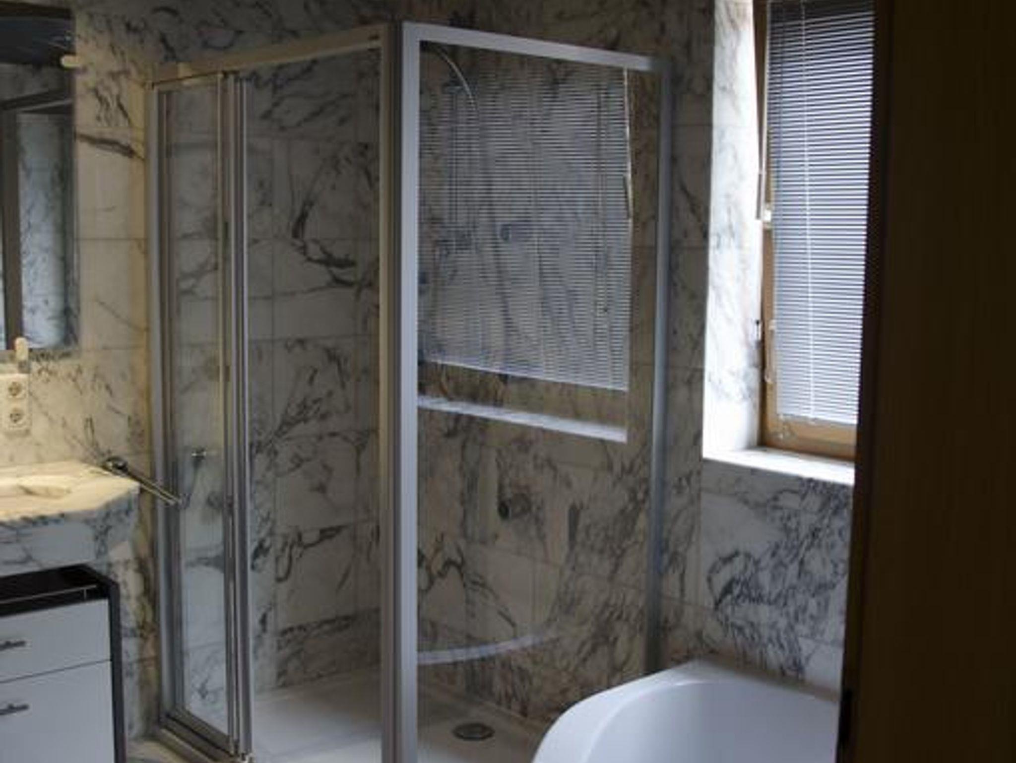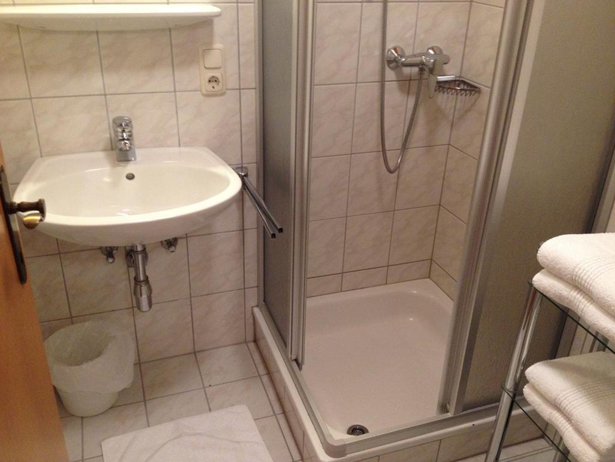 * Badezimmer mit Dusche, Waschbecken und Haartrockner