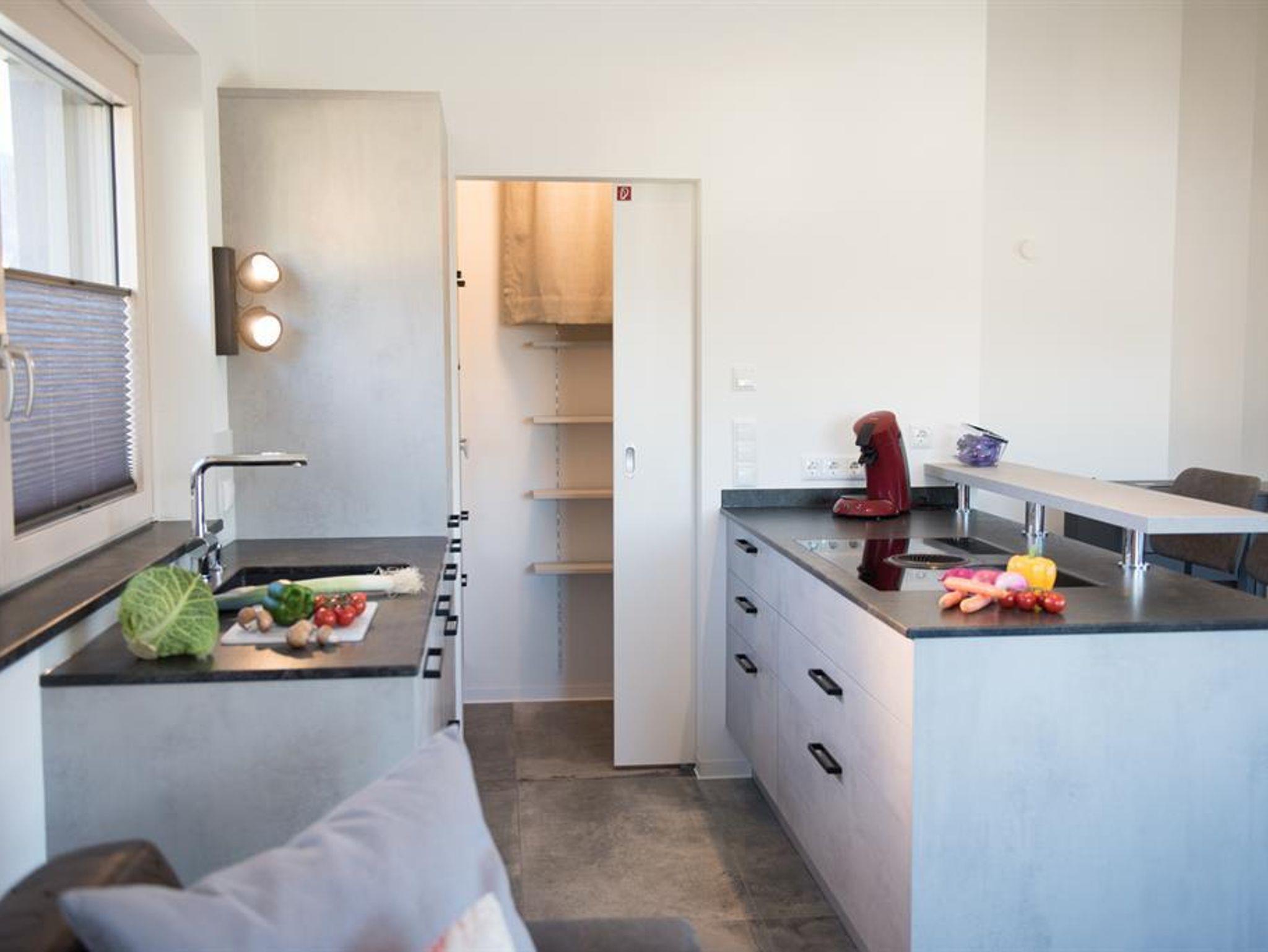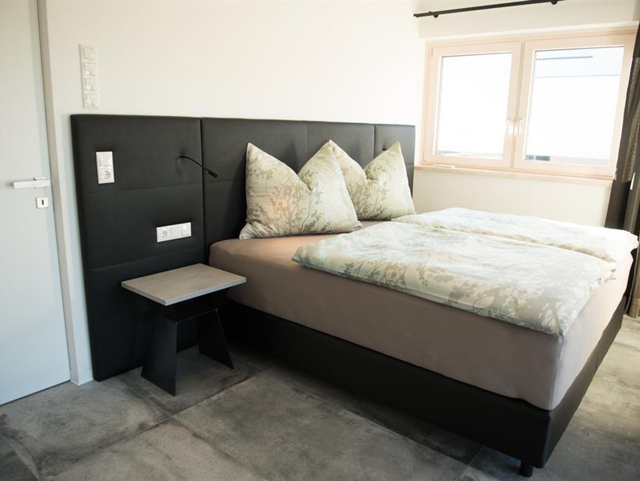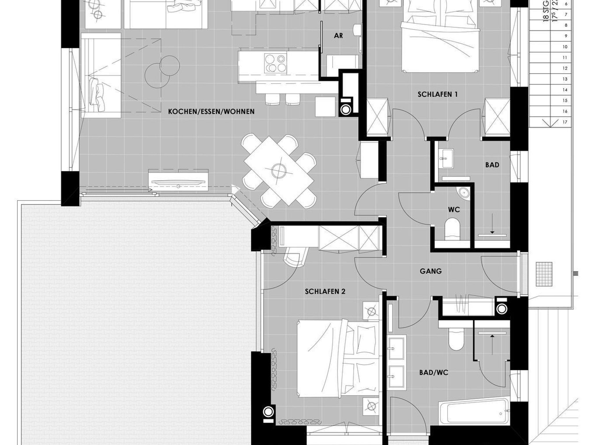 Das modern eingerichtete Appartement besteht aus 2 Schlafzimmer (2 x Doppelbett), Bad 1 mit Badewanne, Dusche und WC, Bad 2 mit Dusche, eigenes WC, großer Wohn- und Kochbereich mit einer ausziehbaren Schlafcouch, die mit einem Handgriff in ein vollwertiges Doppelbett für 2 Personen umfunktioniert werden kann, Abstellraum und Flur.