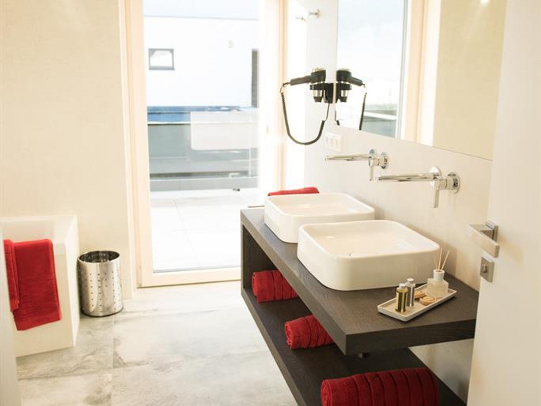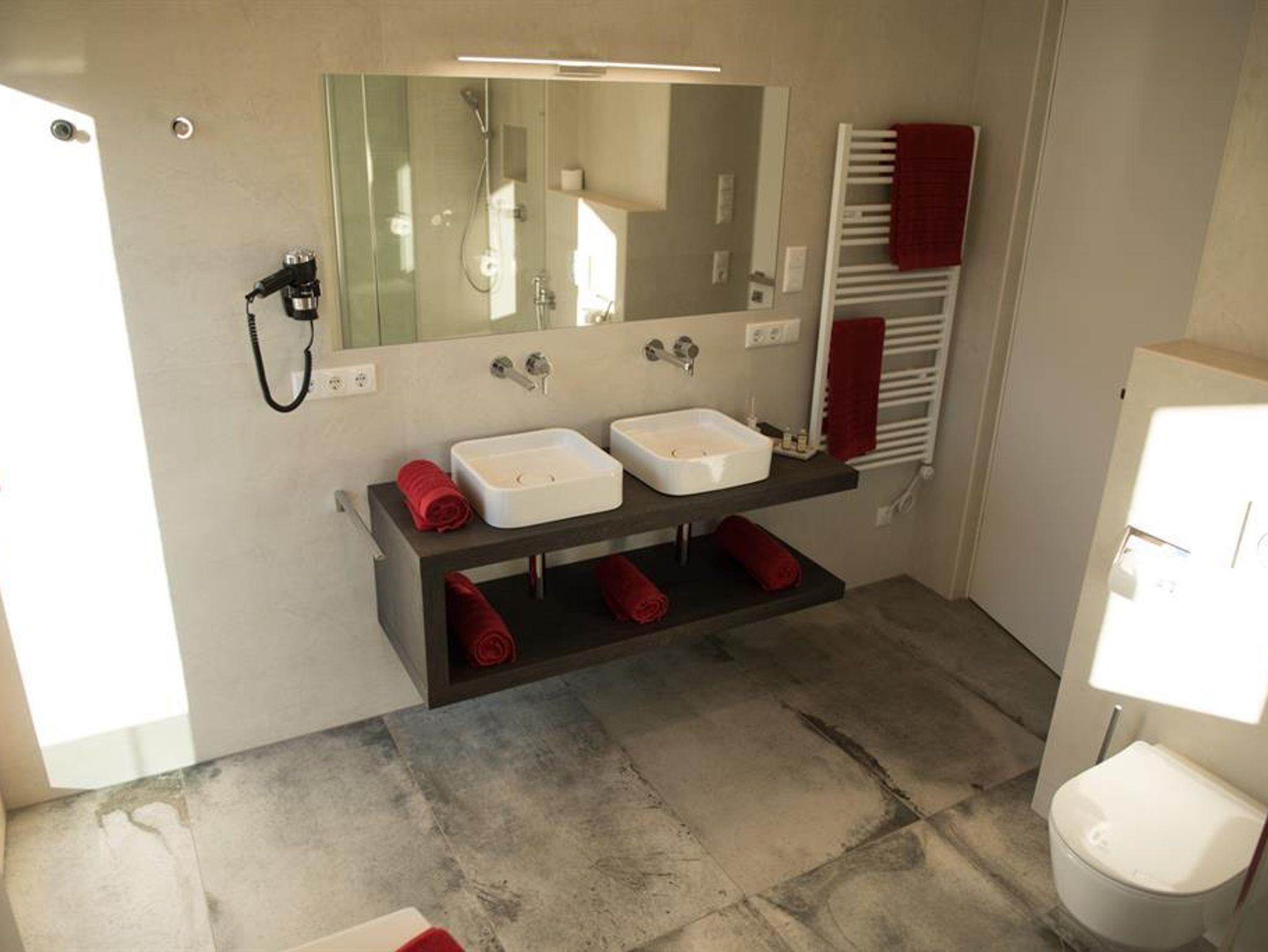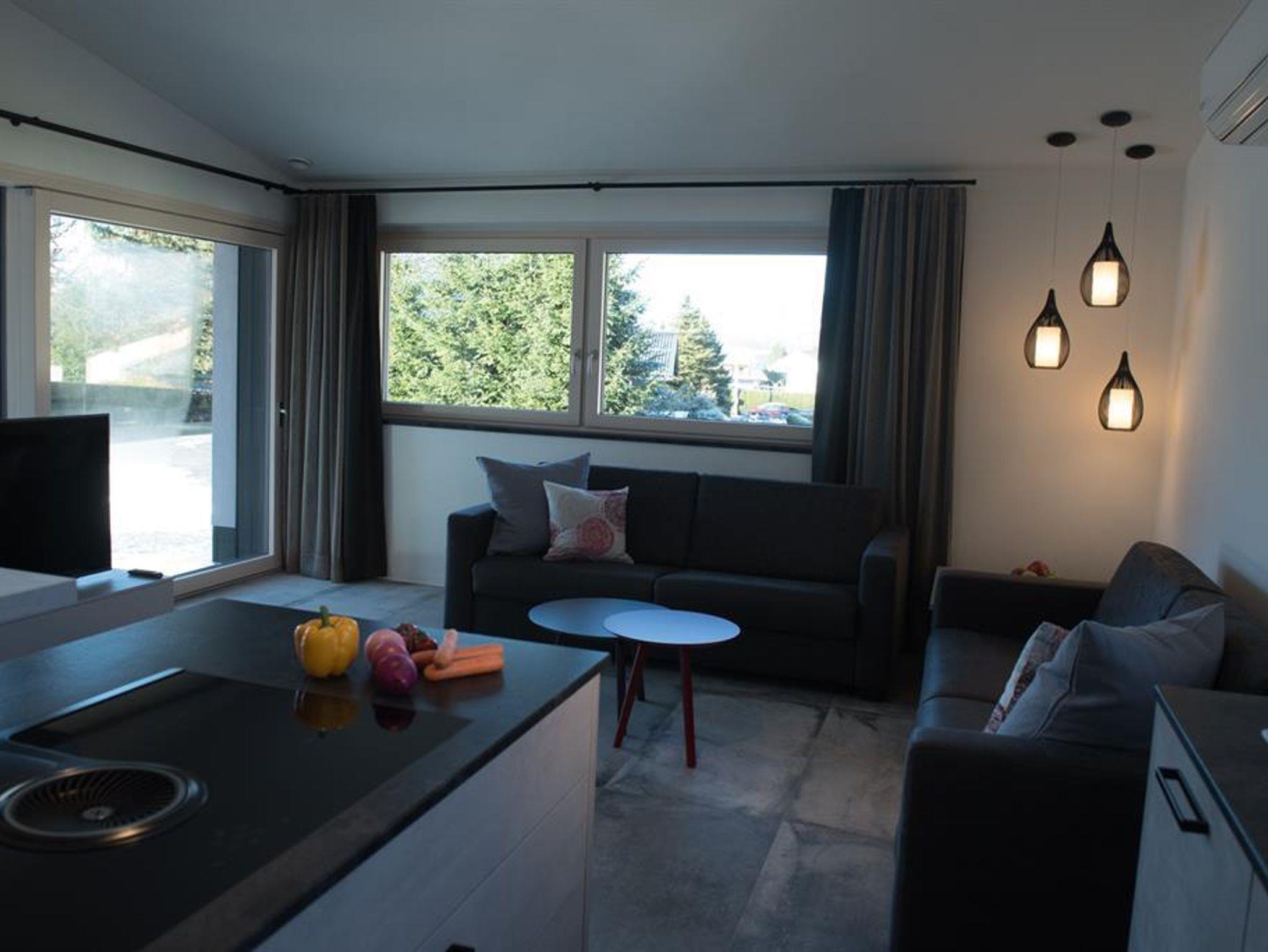 Das modern eingerichtete Appartement besteht aus 2 Schlafzimmer (2 x Doppelbett), Bad 1 mit Badewanne, Dusche und WC, Bad 2 mit Dusche, eigenes WC, großer Wohn- und Kochbereich mit einer ausziehbaren Schlafcouch, die mit einem Handgriff in ein vollwertiges Doppelbett für 2 Personen umfunktioniert werden kann, Abstellraum und Flur.