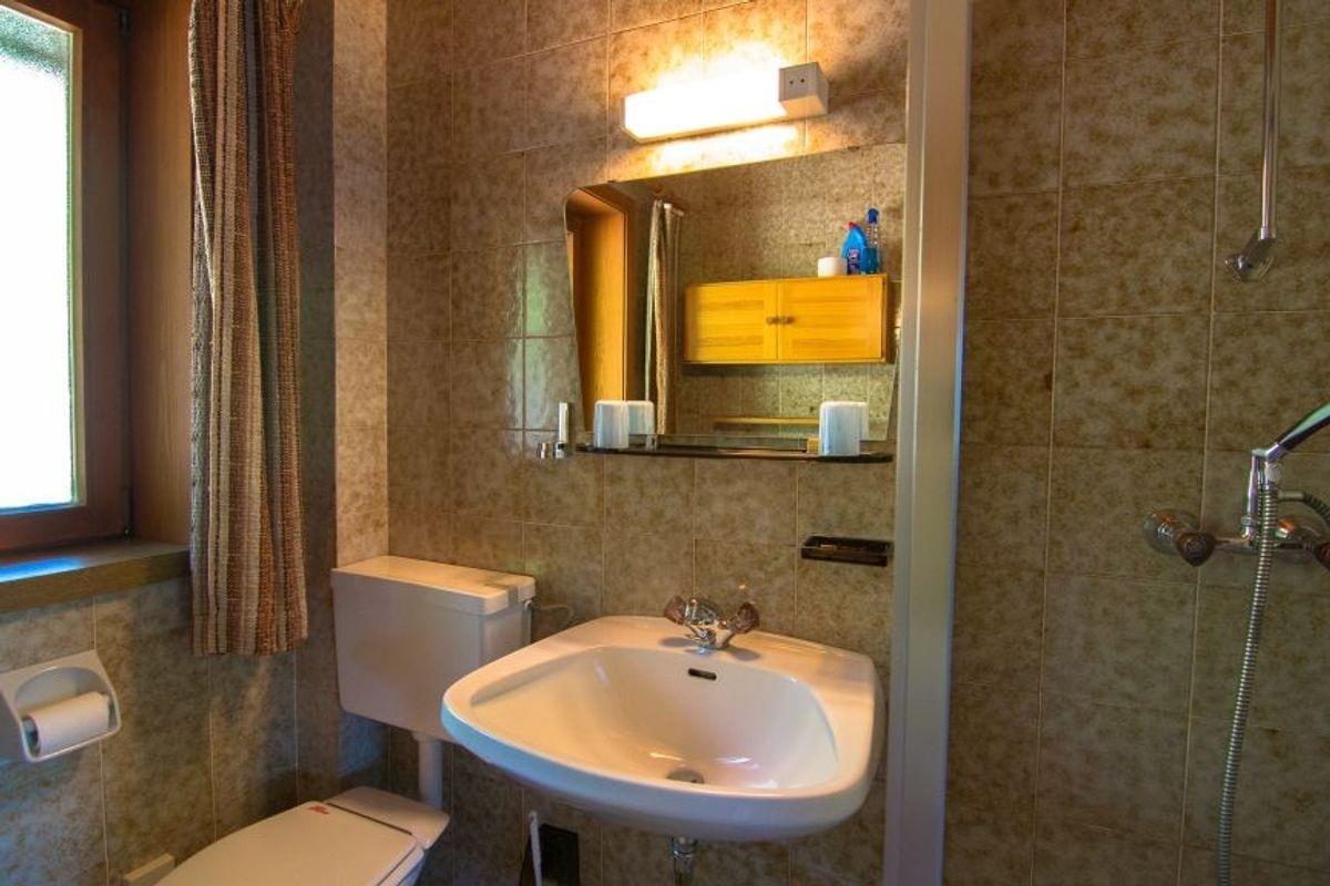 Das Badezimmer verfügt über Dusche, Waschbecken, WC und einen E-Radiator. Der möblierte Balkon lädt zum Verweilen und Genießen der Kärntner Bergluft ein – ideal für Paare, Freunde oder kleine Familien, die eine ruhige, traditionelle Unterkunft suchen.