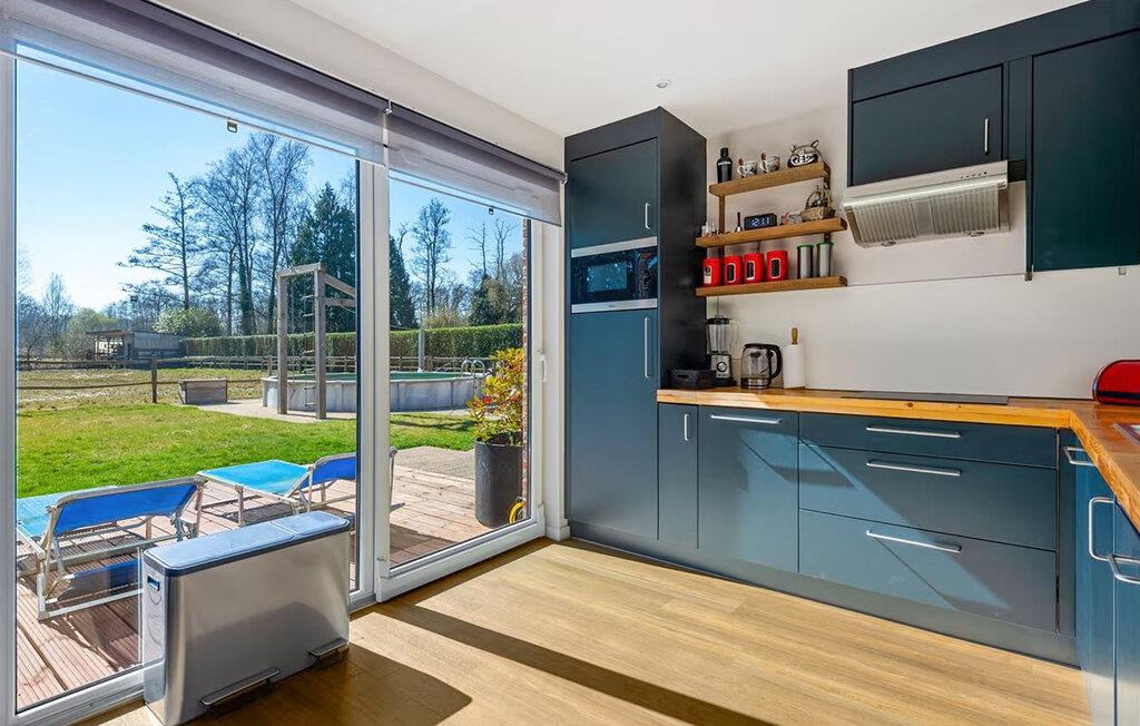 Tilbring avslappende timer i det moderne interiøret, som slipper inn rikelig med naturlig lys gjennom store vinduer. Slå deg ned i den romslige stue- og spisestuen med en komfortabel sofagruppe og et solid trebord. Møblene kombinerer varme naturmaterialer og synlige trebjelker. Benytt deg av det åpne kjøkkenet med utstyr av høy kvalitet og direkte tilgang til terrassen. Etter en aktiv dag kan du trekke deg tilbake til badstuen eller slappe av i boblebadet.