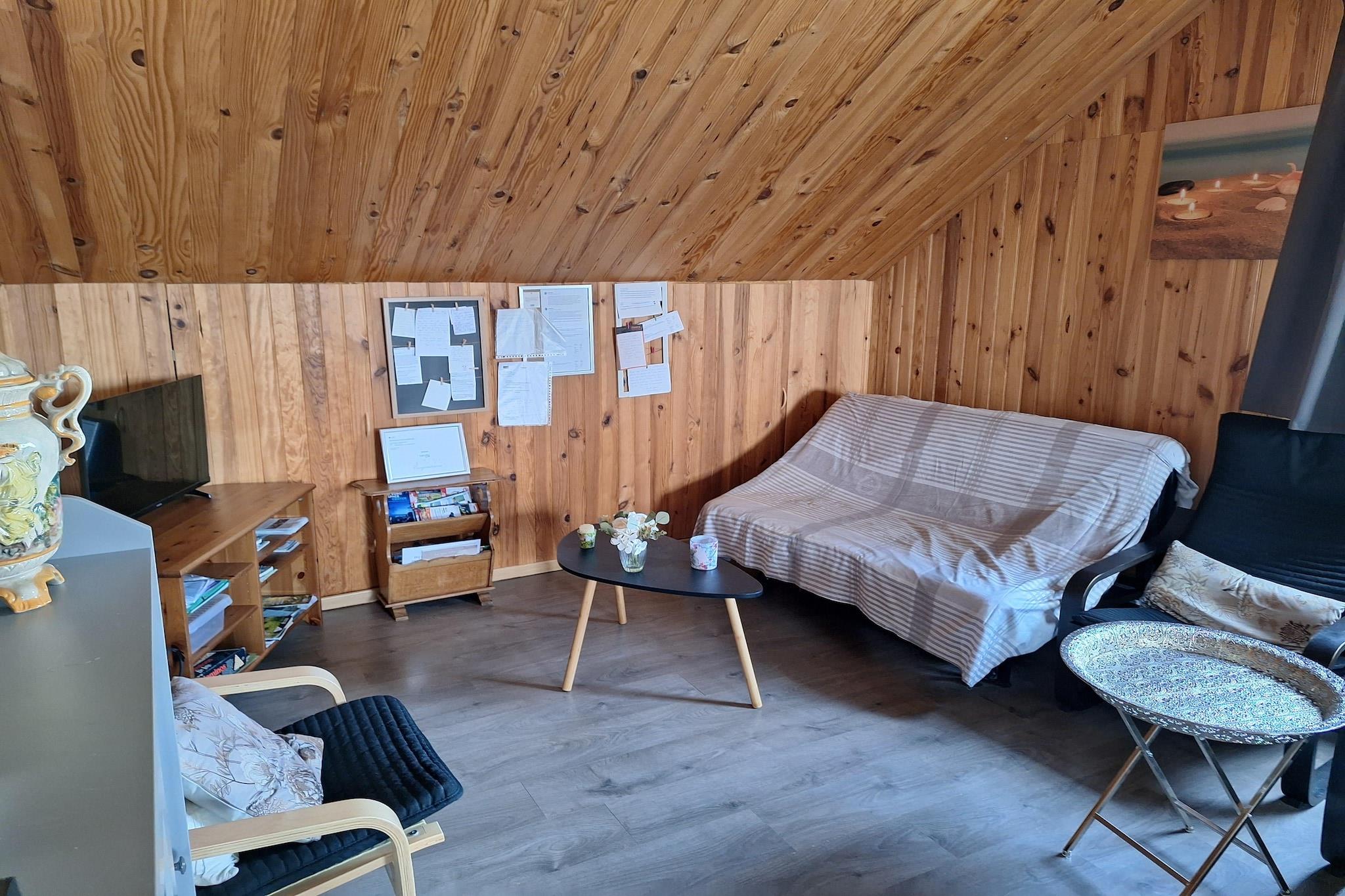 Første etasje: (Inngang(tilgjengelig fra utsiden), hage) i 2. etasje: (åpent kjøkken(vannkoker, komfyr(komfyr med 4 kokeplater, keramisk), kaffetrakter(kaffetrakter, kaffepute), stekovn, mikrobølgeovn, oppvaskmaskin, 2x kjøleskap(+ fryser)), Stue/spisestue(dobbel sovesofa(140 x 200 cm), TV, spisebord, radio), soveværelse(dobbeltseng), soveværelse(dobbeltseng(140 x 200 cm), strykebrett, strykejern), bad(dusj(tilpasset uføre), håndvask, toalett, Hårtørker)) sprinkelseng, hagemøbler, grill, parkering