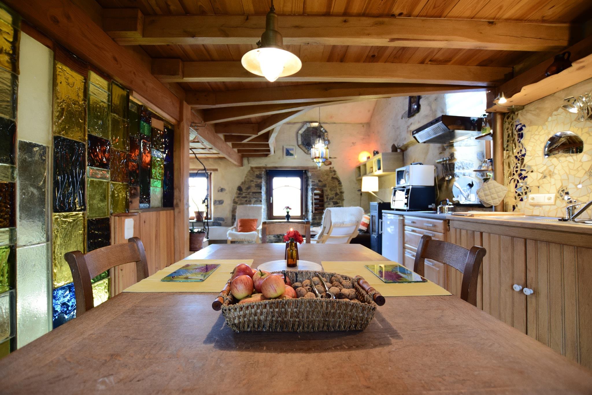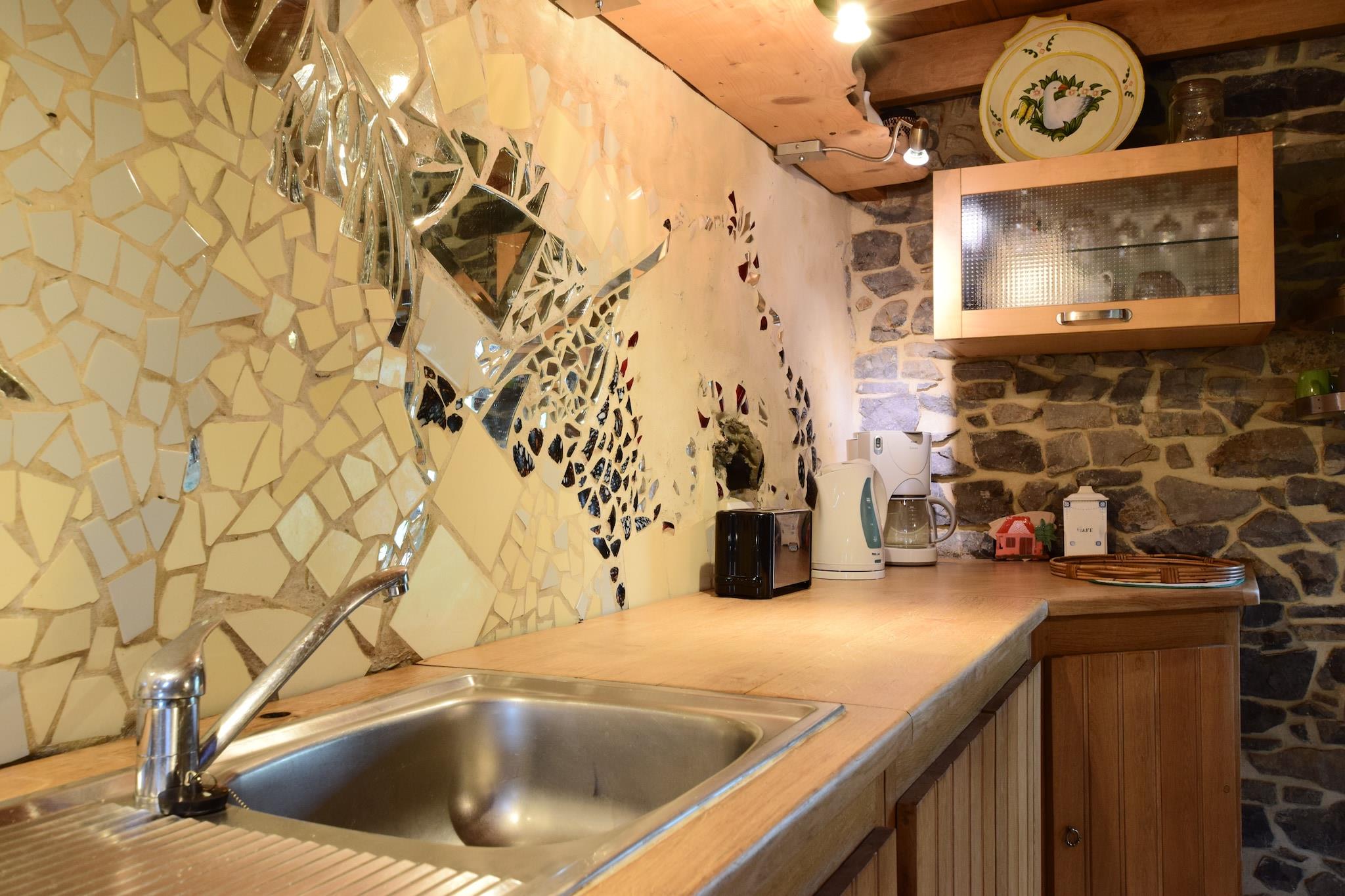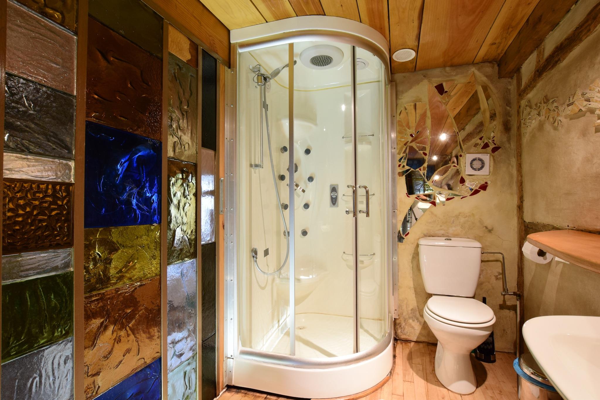 Ikke langt fra den lille Ardennesbyen Durbuy, vil denne hytta overraske deg med sin komfort og miljøkvalitet. Faktisk er den bygget helt av 100% naturlige materialer: stein, tre, hamp og kalk for halvtømmer. Alt dekorasjon av veggene, så vel som bøylene og skinnene i smijern i hytta ble gjort av eieren. Sjarm og en naturskift garantert! Hytta er ideell for naturelskere som ønsker å utforske regionen til fots eller delta i en rekke aktiviteter som terrengsykling, kajakkpadling, fiske, ridning, klatring og ski om vinteren, etc. Hytta har også en butikk med lokale produkter hvor du kan finne all informasjon du vil ha for å prøve produsere fra produsentene. Hytta er WWF Panda-sertifisert, noe som betyr at den er helt naturlig og oppfyller økologiske kriterier.