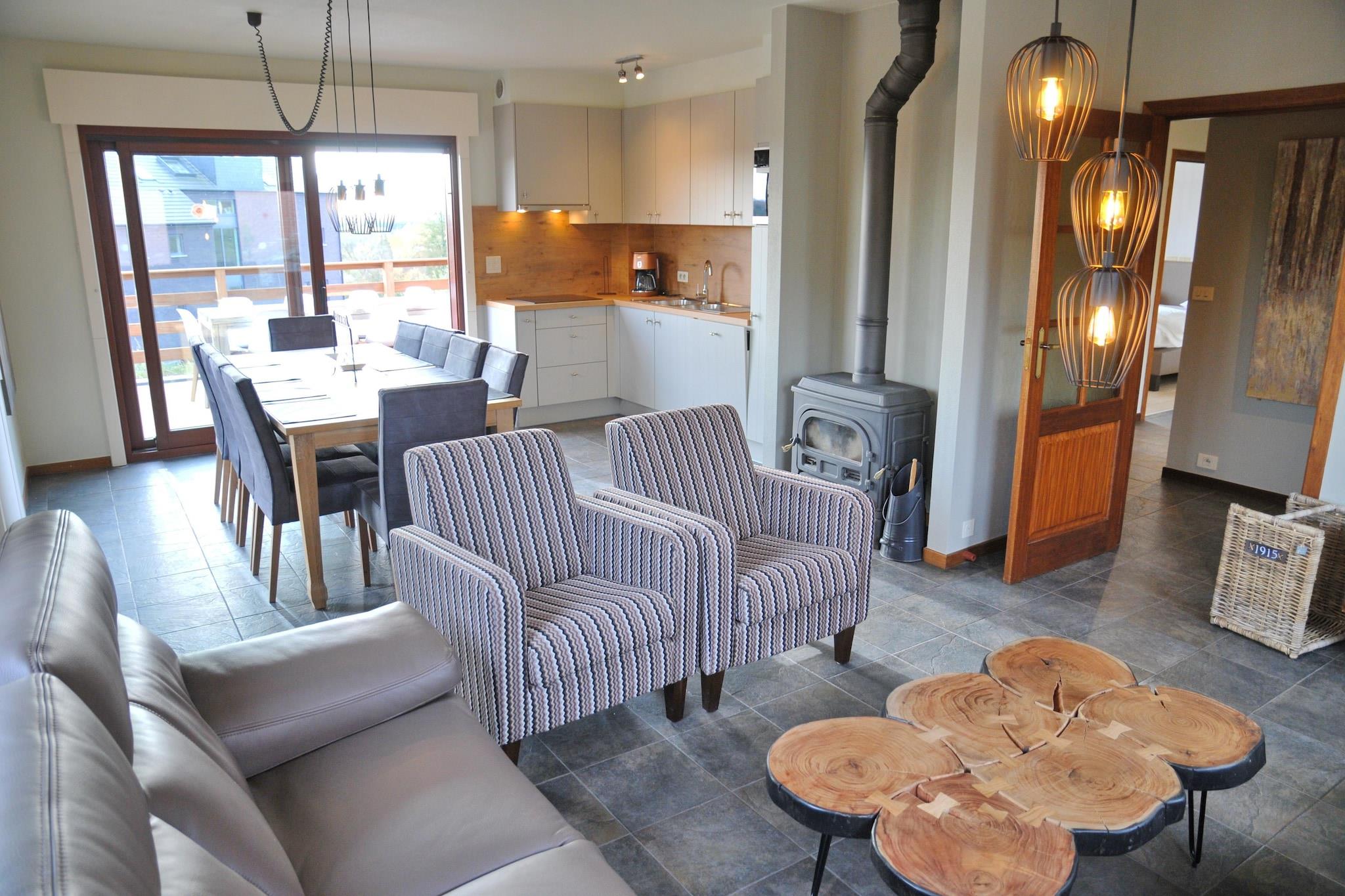 Stilfullt møblert villa med fantastisk utsikt over Ardennene, i gangavstand fra Durbuy og Romas opplevelsespark. Vakker villa med koselig stue (digital TV og wifi) med åpen kjøkkenløsning med utsikt over en romslig, sørvendt terrasse med grill og en vid utsikt over Ardennene. Fire stilige soverom med king-size springfjærsenger, to i første etasje som deler bad med dusj og to i 1. etasje hvor det ene soverommet har en ekstra seng. Begge rommene har vask på rommet og deler bad med dusj og badekar. I underetasjen er oppholdsrommet med biljard og brettspill.