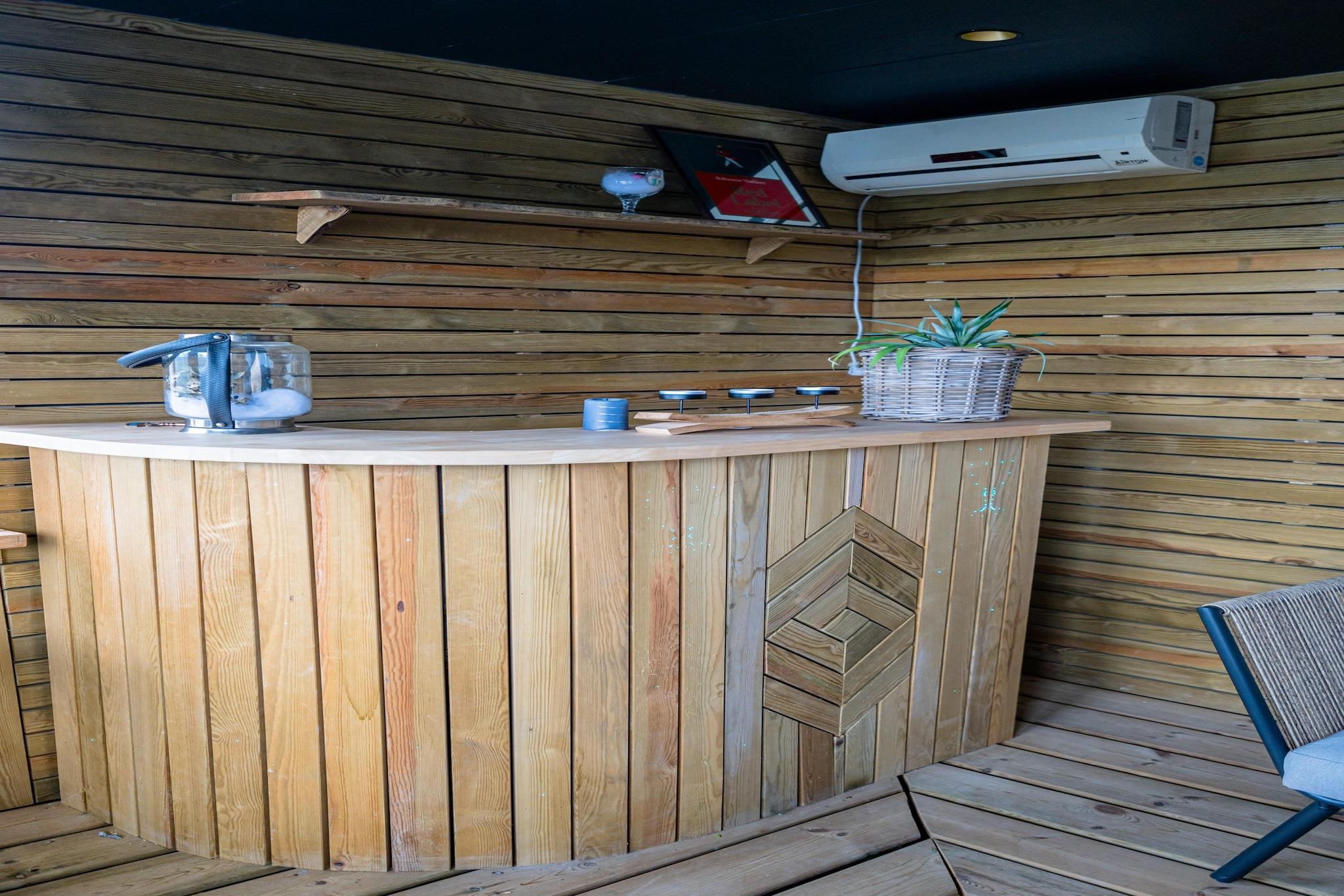 Første etasje: ((sittehjørne, bar, klimaanlegg), Stue(sittehjørne), åpent kjøkken(spisebord(4 personer), vannkoker, brødrister, kjøkkenvifte, kaffetrakter, espressomaskin, stekovn, oppvaskmaskin, kjøleskap med fryser, elektriske kokeplater), soveværelse(dobbeltseng(160 x 200 cm)), soveværelse(dobbeltseng(140 x 200 cm)), bad(Bubble bath, håndvask), toalett) spisebord(4 personer)