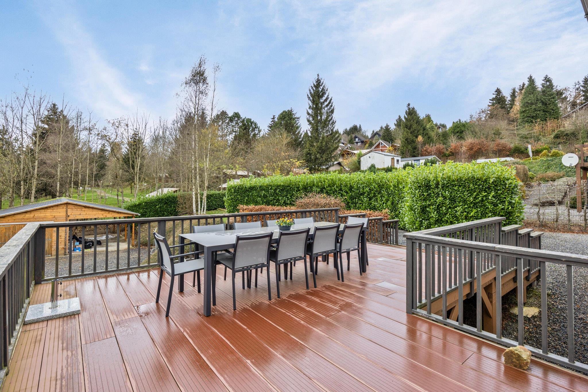 Denne romslige villaen ligger i den fredelige landsbyen Manhay, og tilbyr et avslappende tilfluktssted for familier og grupper. Bare 2 km fra Dochamps og omgitt av skog, er det nær toppattraksjoner som Parc Chlorophylle, en naturpark perfekt for barn og turgåere, og den historiske byen La Roche-en-Ardenne, kjent for sitt middelalderslott og sjarm ved elvebredden. For eventyrsøkere er Adventure Valley Durbuy og Parc Safari Monde Sauvage Aywaille innen rekkevidde, og tilbyr zip-linjer, dyreliv og utendørs moro. Villaen har seks soverom, inkludert tre med eget bad, og en koselig stue/spisestue med vedovn og sitteplasser til ti. Det åpne kjøkkenet er fullt utstyrt med moderne apparater, og avslapningsområdet inkluderer en infrarød badstue. Gjestene kan nyte en inngjerdet hage med en stor terrasse, trampoline, sklie, grilling og selskapsspill. Ytterligere fasiliteter inkluderer en vaskemaskin, tørketrommel, sykkeloppbevaring og en ladepost for elbiler. Nærliggende spisesteder inkluderer La Fourchette Paysanne for belgiske spesialiteter, Le Patton Restaurant for fransk mat og Biotanique for sunne europeiske retter.