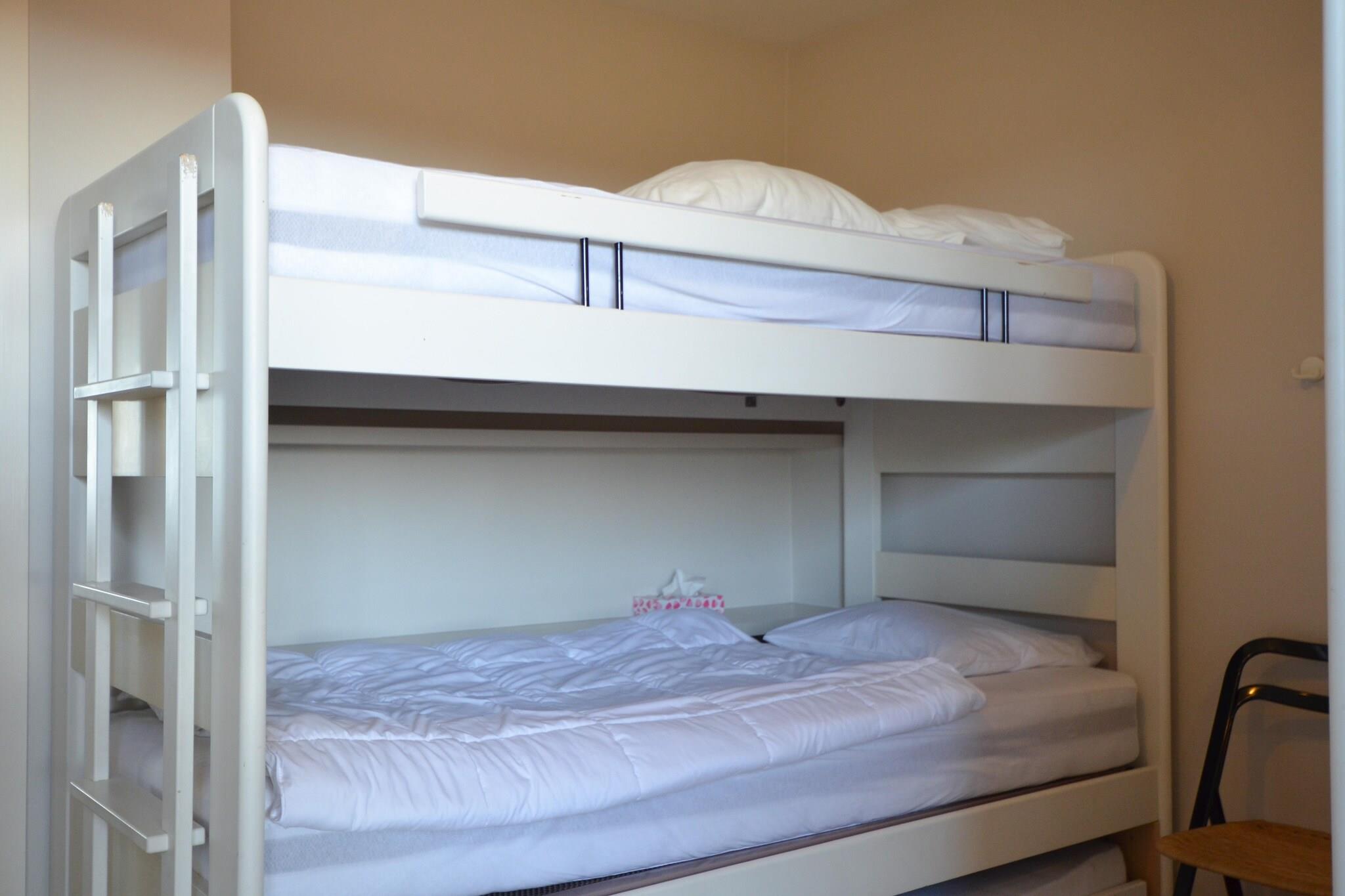 I 4. etasje: (åpent kjøkken(komfyr med kokeplater, kjøkkenvifte, kaffetrakter, stekovn, mikrobølgeovn, oppvaskmaskin), Stue/spisestue(TV(flatskjerm, digital), spisebord, sittehjørne, DVD-spiller, radio, balkon), soveværelse(dobbeltseng(dobbeldyne, 140 x 200 cm), balkon), soveværelse(1 persons uttrekkbar seng(dyn), køyeseng(dyn), balkon), bad(dusj, håndvask, toalett)) garasje, heis