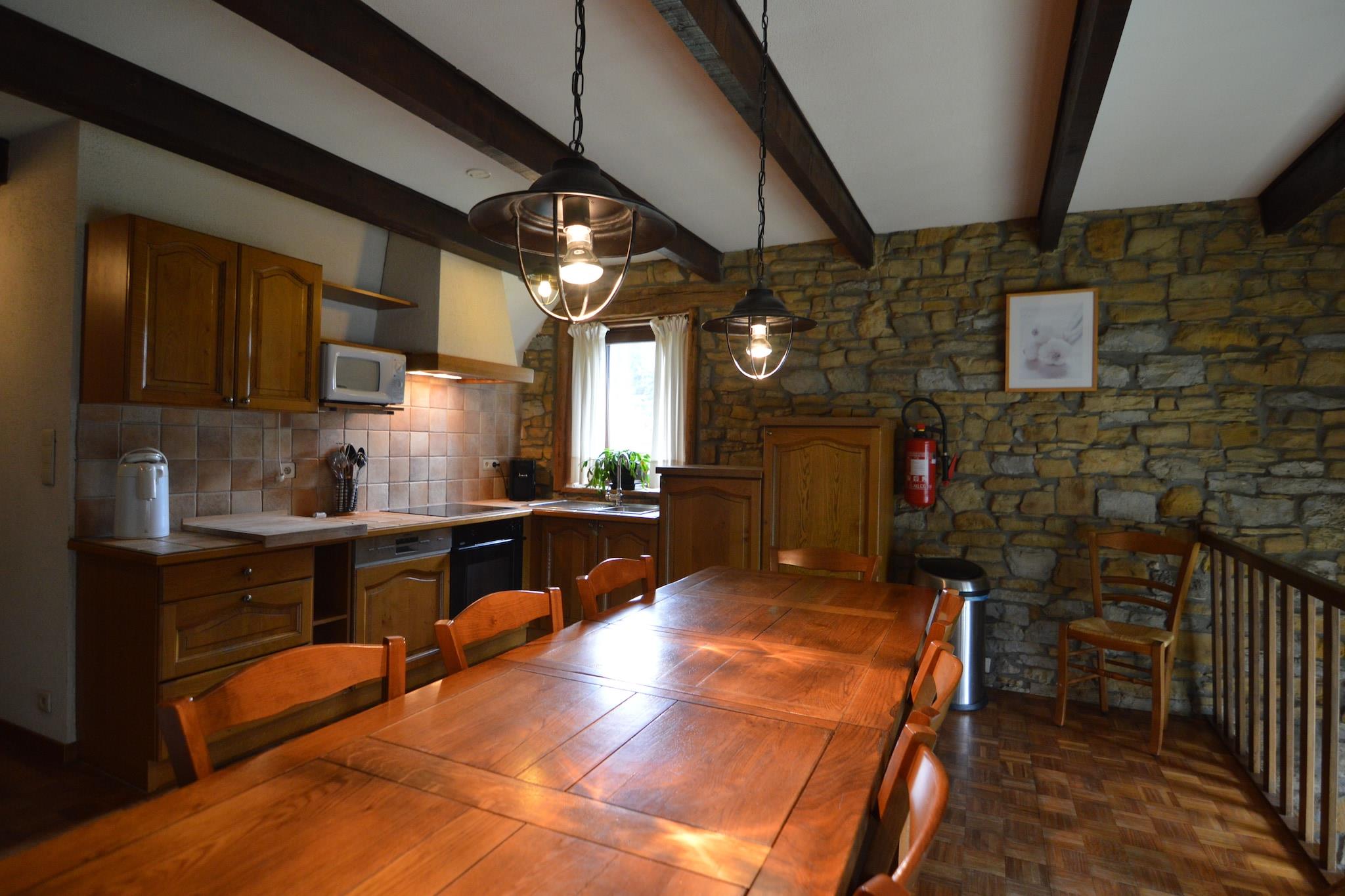 Dette ekspansive feriehuset i Sprimont-Ogné er perfekt for store familier eller grupper som søker komfort og plass i hjertet av Belgias Liège-region. Bare 1 km fra sentrum og omgitt av frodig landskap, tilbyr det enkel tilgang til kulturelle landemerker som middelalder-château de Franchimont og den fascinerende Grotte de Comblain. Naturelskere vil nyte fotturer i nærliggende skoger eller besøke dyreparken Le Monde Sauvage i Aywaille. Boligen er fordelt på tre etasjer og har ti soverom, fem bad og flere stue- og spiseområder. De to kjøkkenene er fullt utstyrt med ovner, griller, mikrobølgeovner og oppvaskmaskiner - ideell for gruppemåltider. Underholdningen er dekket med kabel-TVer, DVD-spillere og stereoanlegg, mens sentralvarme og private terrasser sørger for komfort hele året. Utendørs kan gjestene nyte en inngjerdet hage, grill, dam og lekeapparater, med rikelig med parkering tilgjengelig. Sprimont tilbyr utmerket mat innen gangavstand. Nyt raffinert belgisk mat på Il Calice, rustikk sjarm på La Marelle, eller italienske smaker på Il Mulino. Enten du utforsker grotter, tar utslag på Golf de Gomzé-Andoumont eller slapper av på terrassen, er denne eiendommen en perfekt base for ditt Ardennes-eventyr.