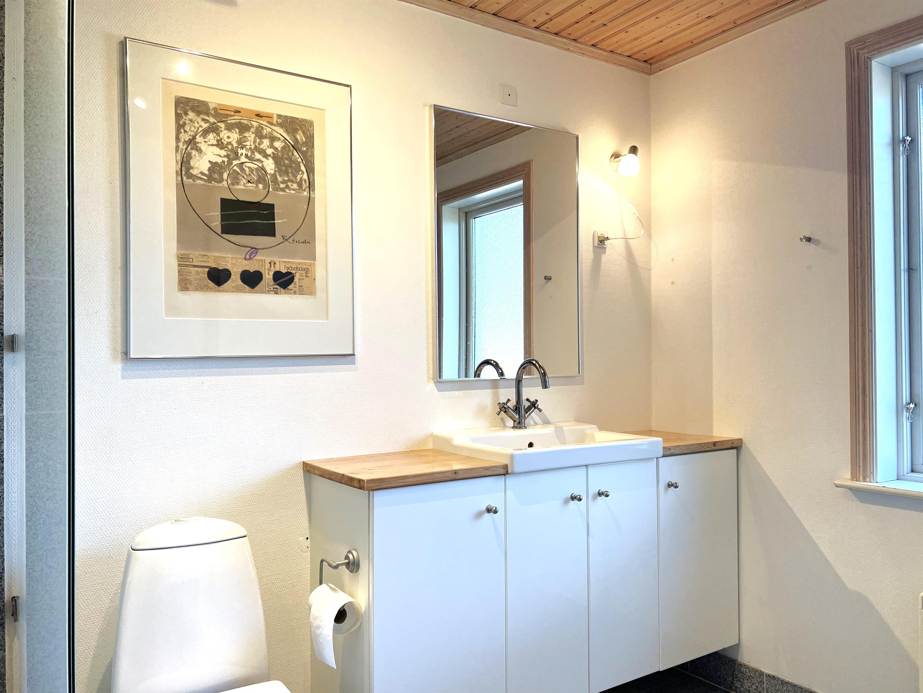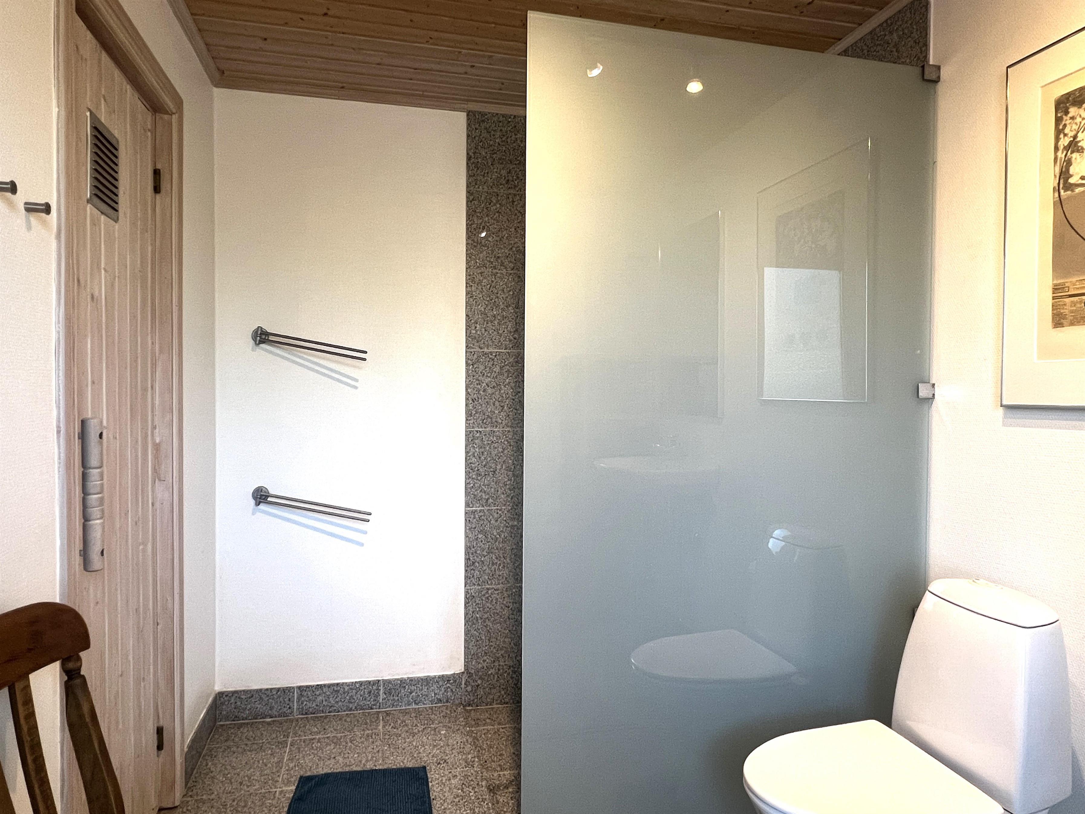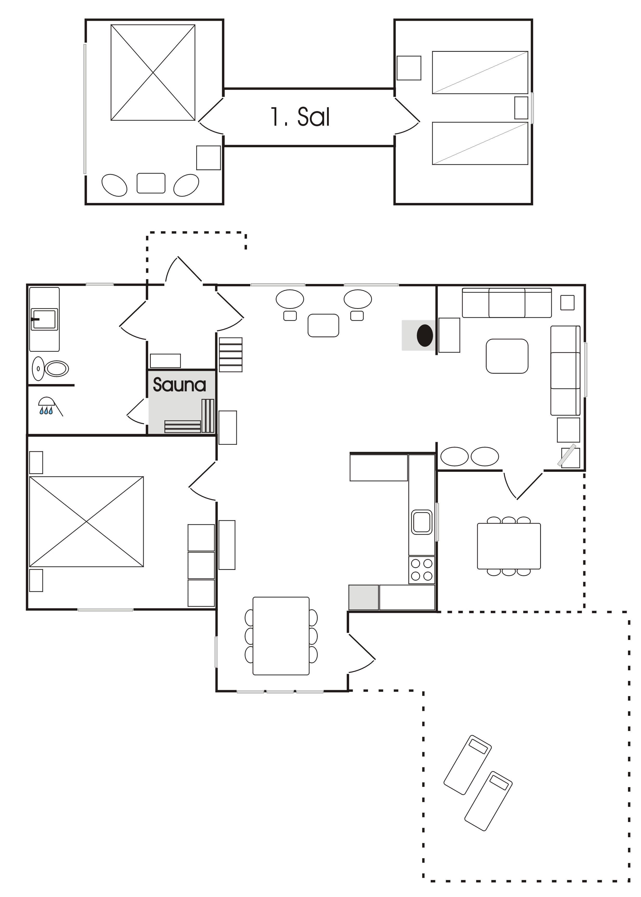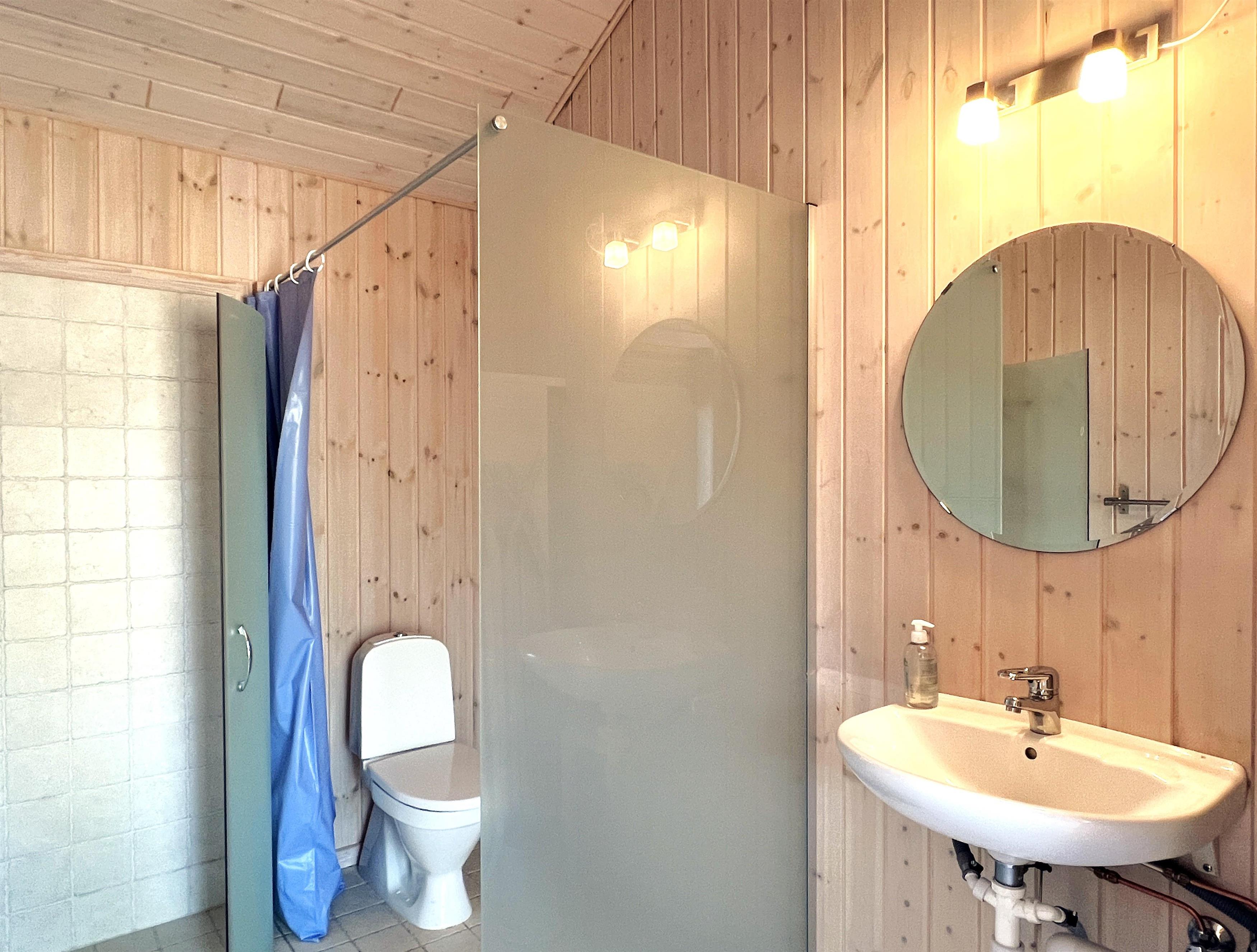 Das große Haupthaus und das Nebengebäude sind durch eine Holzterrasse verbunden, so dass Sie problemlos zwischen den beiden Häusern wechseln können, die zu schönsten Urlaubsaufenthalten einladen – auch für zwei Familien. Das Haupthaus ist mit einer Dachschräge gebaut und wirkt hell und einladend. Feine und gut ausgestattete Küche in offener Verbindung zum Esszimmer mit Zugang zur beeindruckend großen Terrasse. Das Haus verfügt über ein schönes Wohnzimmer mit bequemen Möbeln und TV, von dem aus auch Zugang zur Holzterrasse besteht. Außerdem gibt es ein Schlafzimmer mit Doppelbett und ein schönes Badezimmer mit Sauna. Im 1. Stock befinden sich zwei weitere schöne Schlafzimmer mit jeweils einem Doppelbett und zwei Einzelbetten. Alle Zimmer sind sehr geräumig und verfügen über viel Stauraum. Im Nebengebäude gibt es ein großes, schönes Schlafzimmer mit Doppelbett und ein schönes Badezimmer mit Dusche. Der Anhang verfügt über schönes Licht durch den Doppelfensterbereich mit Terrassentür. Das Haus verfügt über ein starkes Glasfasernetz und ist insgesamt sehr gut ausgestattet. Rund um das Haus gibt es mehrere schöne Sonnenplätze und viele schöne Gartenmöbel. Auch der Hausgrill kann hier genutzt werden. Zusammen mit der Aussicht auf das schöne Gelände und der ruhigen Lage spüren Sie das besondere Læsø-Ruhe.