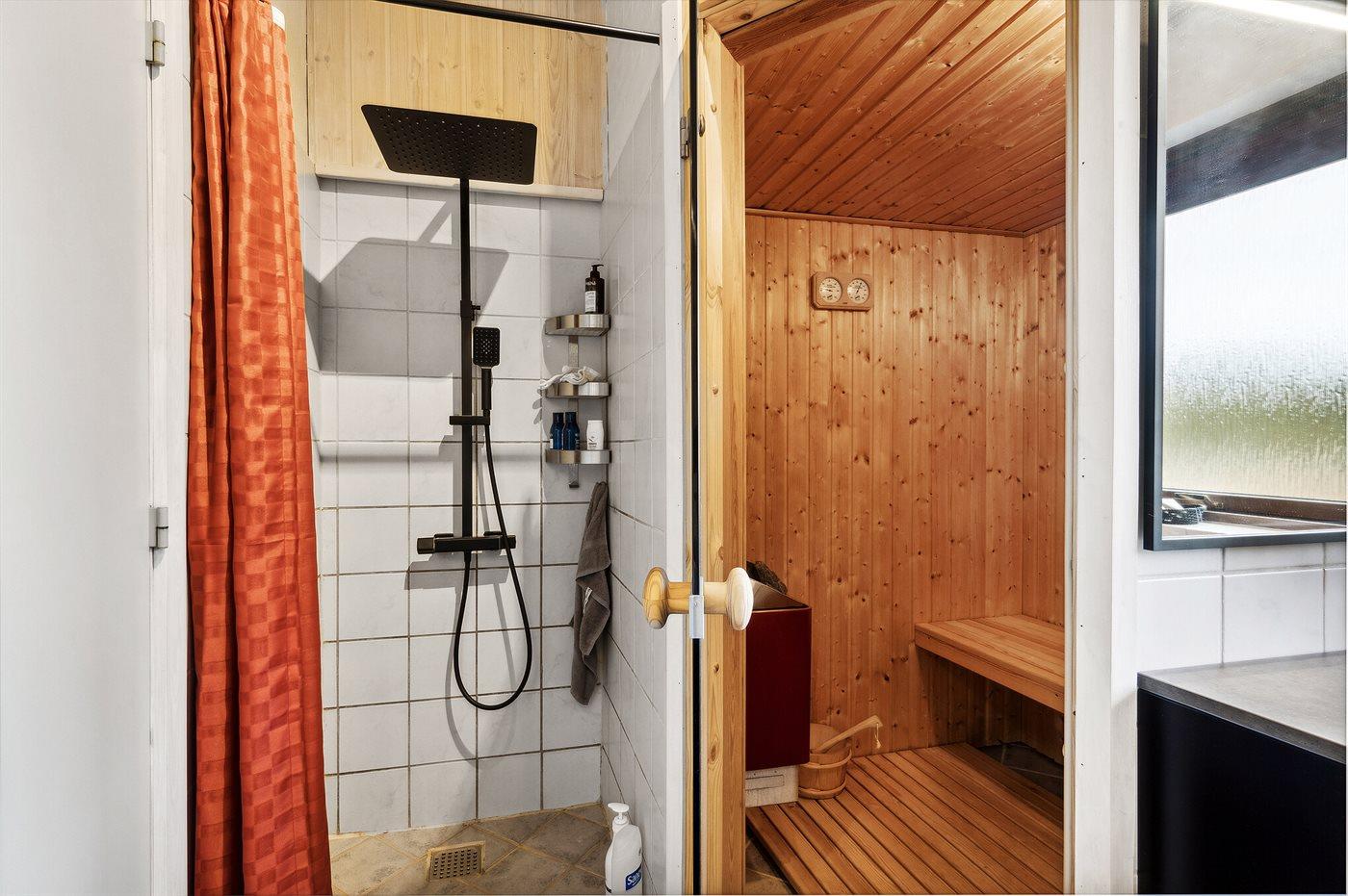 Det er 2 baderom med dusj og 3 toaletter, herav 1 gjestetoalett. Det er varme i gulvet i 2 av baderom. I badstuen er det mulighet for å slappe av.