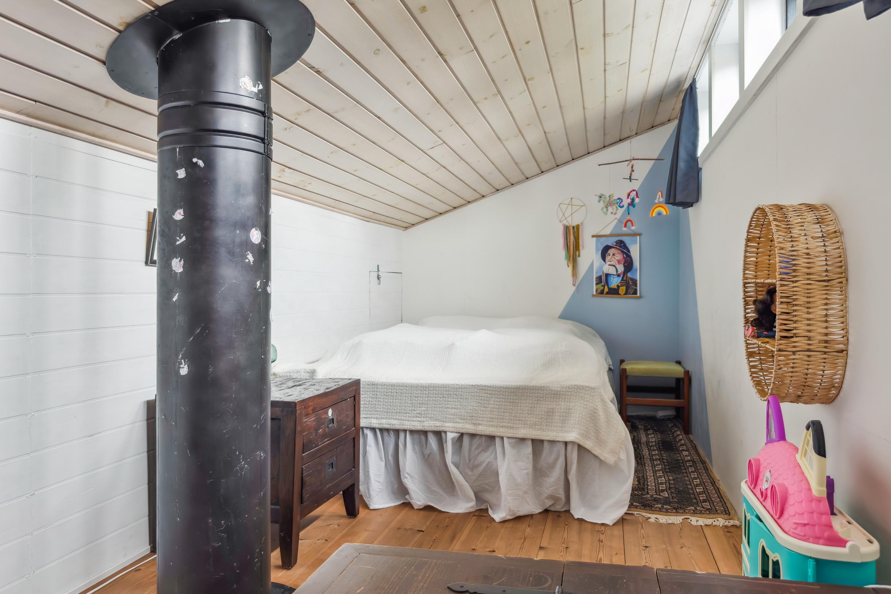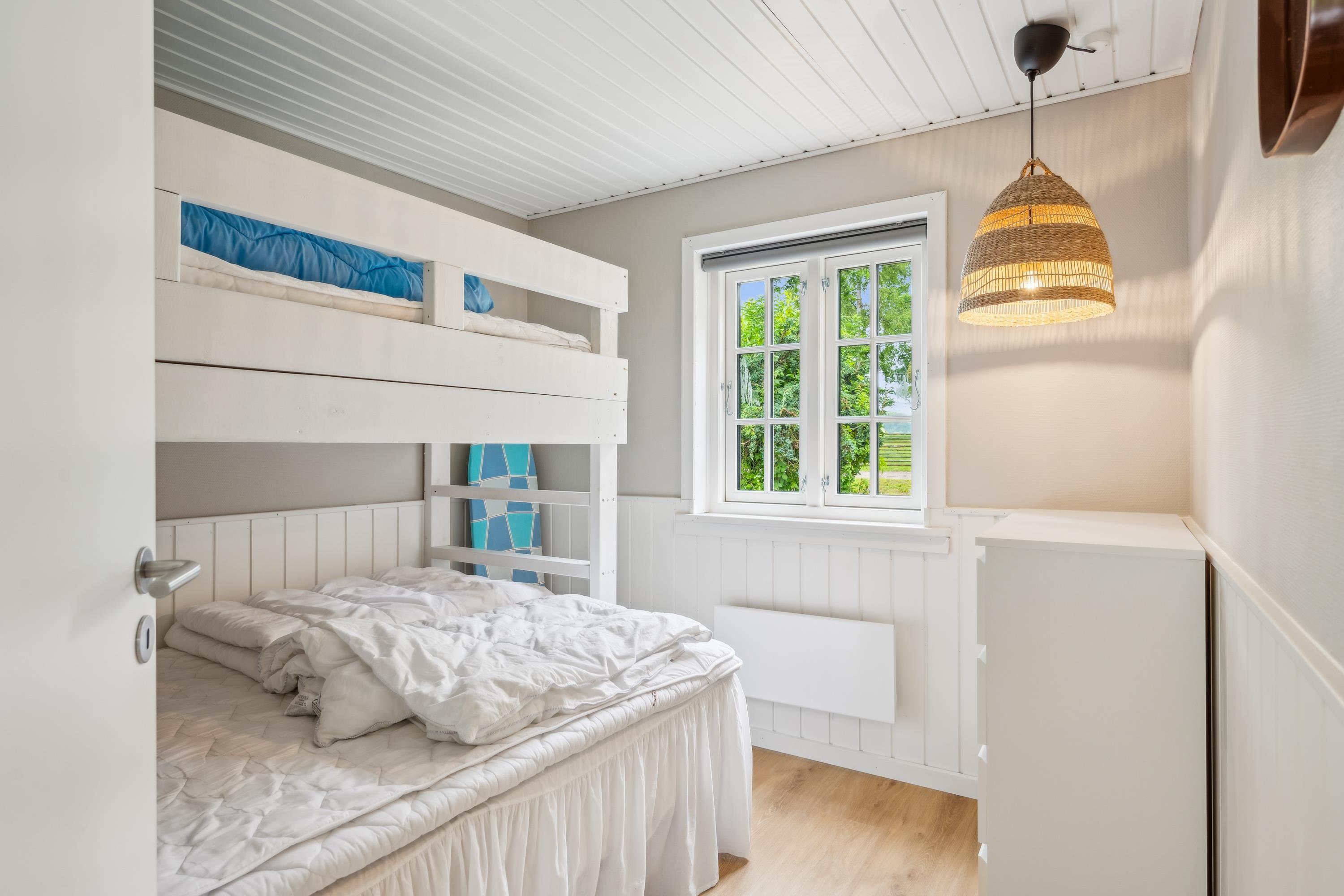 The house offers sleeping accommodation in two bedrooms – one with a double bed, and another with a double bed and a top bunk. Two additional sleeping places are found in the loft, which has a double bed and is accessed via a good ladder/staircase. For the little holiday guests, a high chair and a cot are available. TV is streamed via Chromecast.