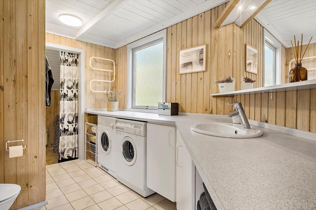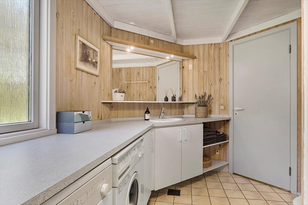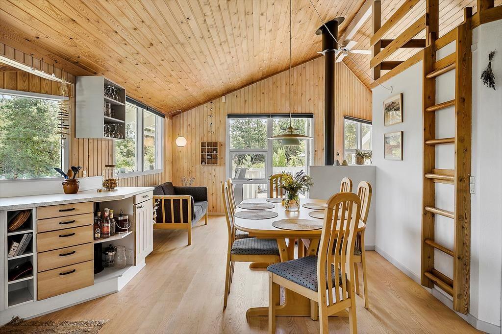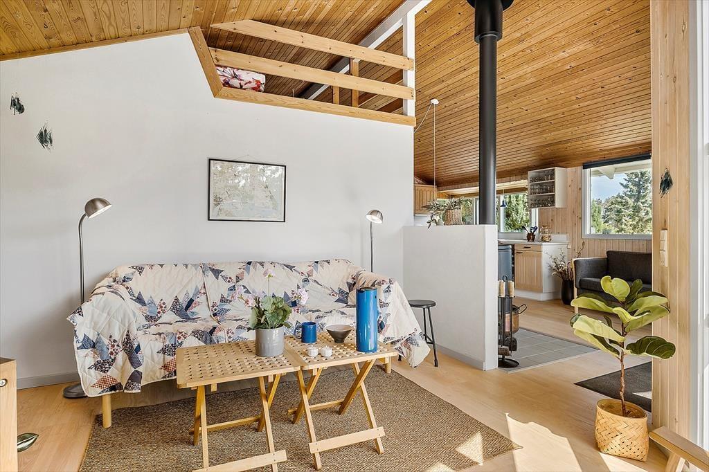 Tritt ein in dieses schöne Ferienhaus und erlebe eine wunderbare Atmosphäre voller natürlichem Charme und Gemütlichkeit. Die Einrichtung ist hell und einladend, und das Haus bietet mehrere gemütliche Ecken, in denen du dich mit einem guten Buch oder einer Tasse Kaffee entspannen kannst. Der offene Grundriss verbindet die Küche mit dem Wohnzimmer, was eine geräumige und soziale Umgebung für das Kochen und gemütliche Momente mit der Familie schafft. Der Kamin im Wohnzimmer sorgt an kühlen Abenden für zusätzliche Wärme und Atmosphäre, während große Fenster viel Licht hereinlassen und eine schöne Aussicht auf die umliegende Natur bieten. Das Ferienhaus verfügt über drei schöne Schlafzimmer, die alle zu einer erholsamen Nachtruhe nach einem erlebnisreichen Tag einladen.