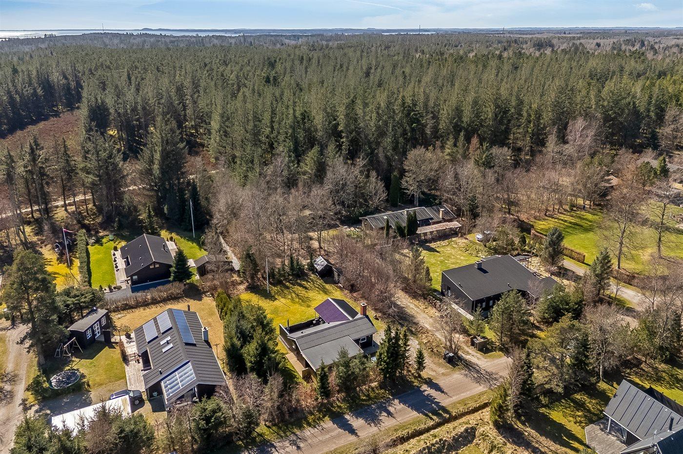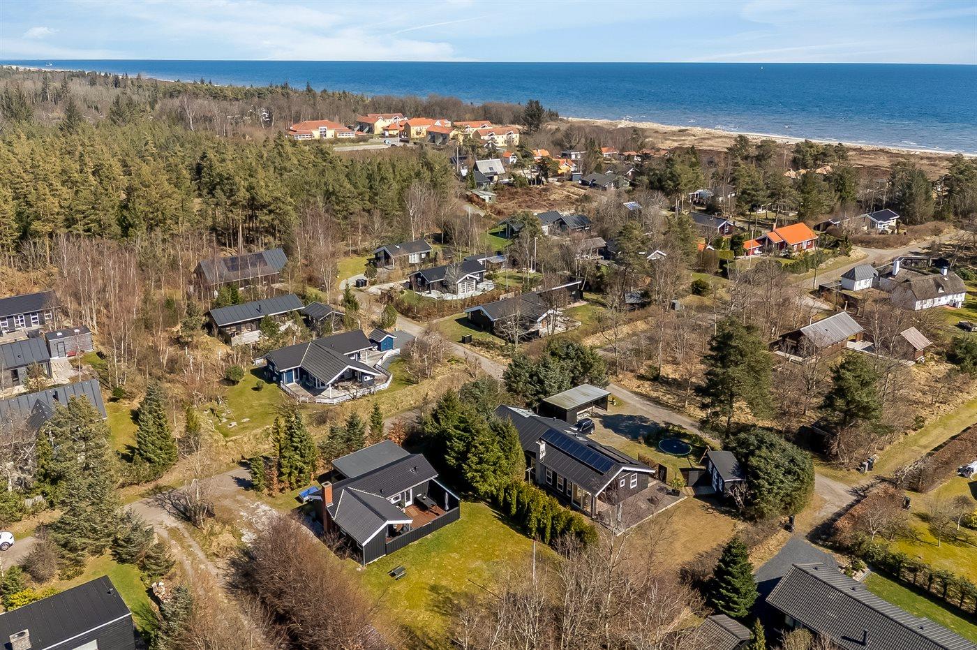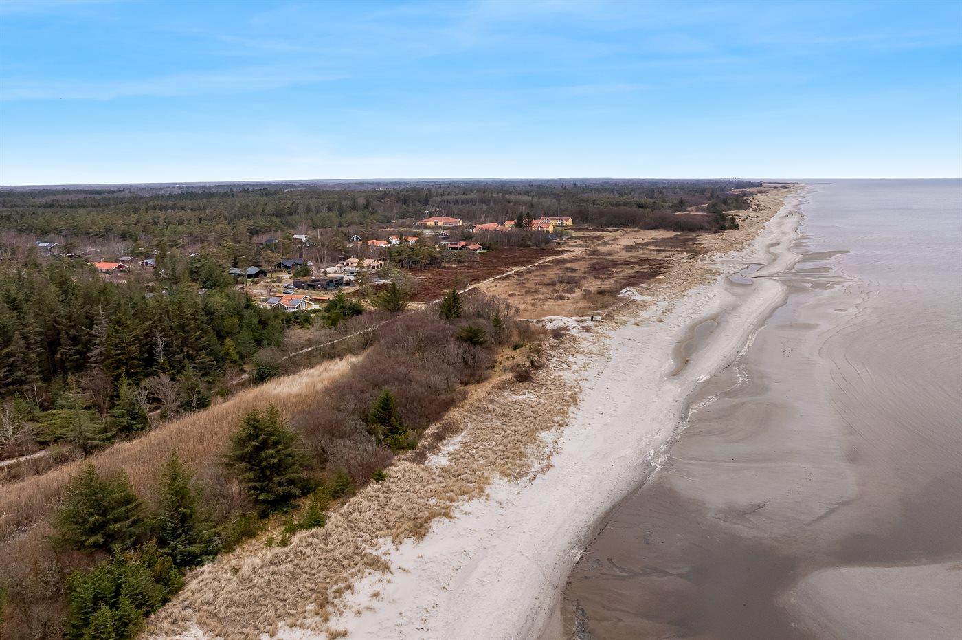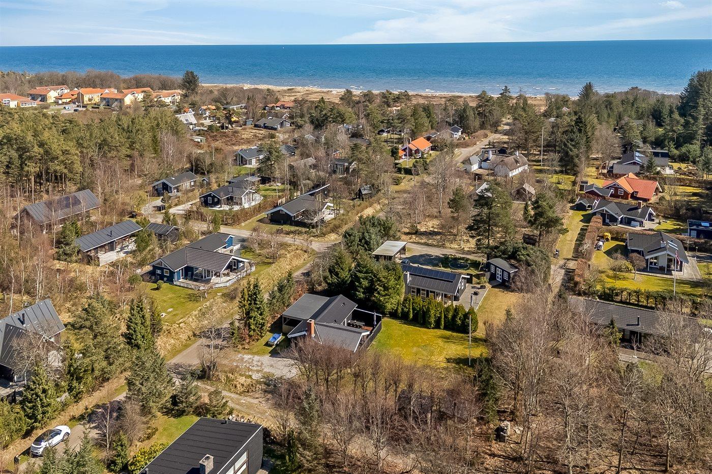 Ferieboligen er beliggende på en 1050 m² stor anlagt have. Avstand til hav er 350 m. Avstand til fjord er 3300 m. Nærmeste butikk ligger i en avstand på 3200 m. Golfbane i en avstand på 2800 m. Til ferieboligen hører åpent terrasseareal. I tillegg er det overdekket terrasse. Bålplass. Det er grill til rådighet. P-plass ved huset.