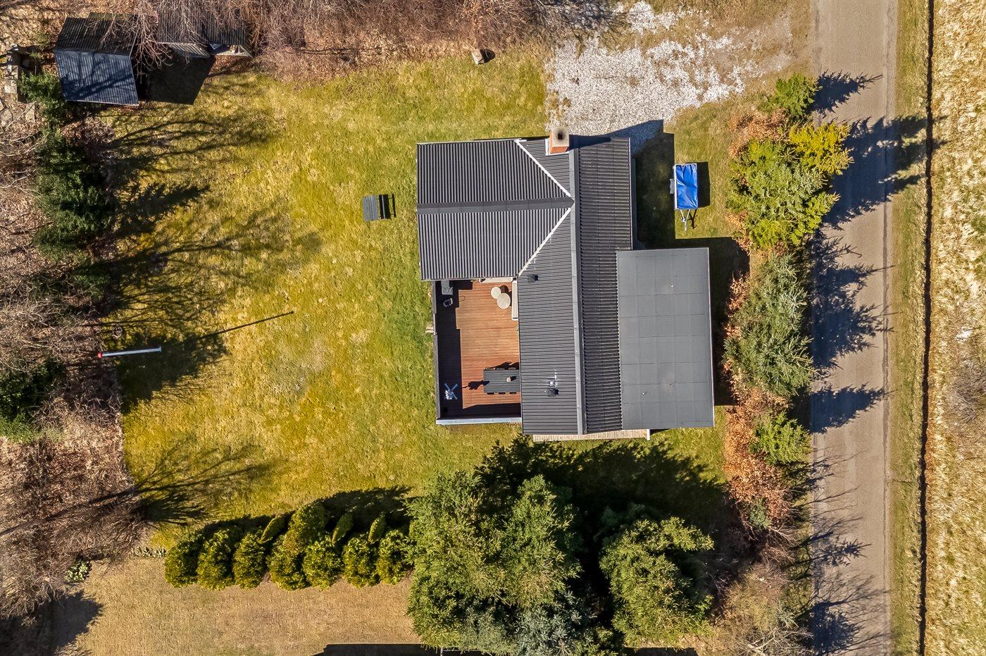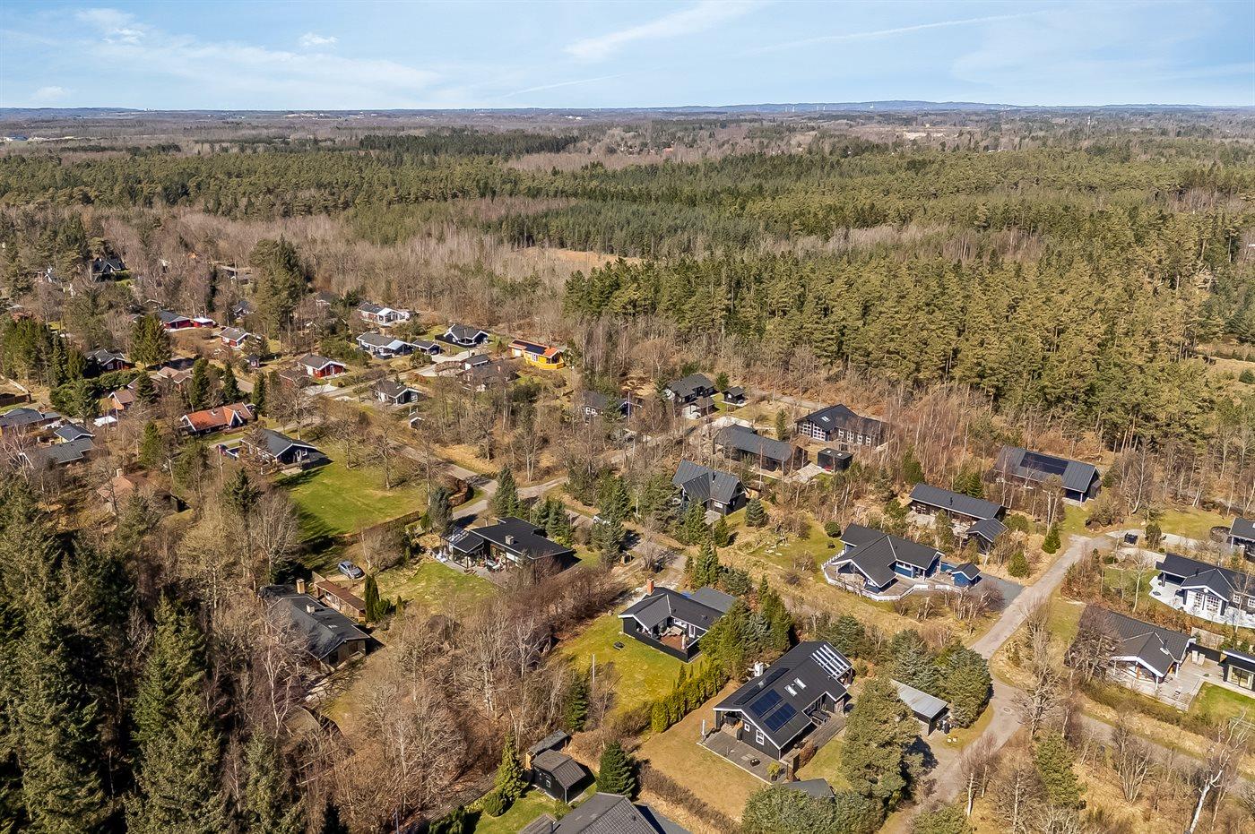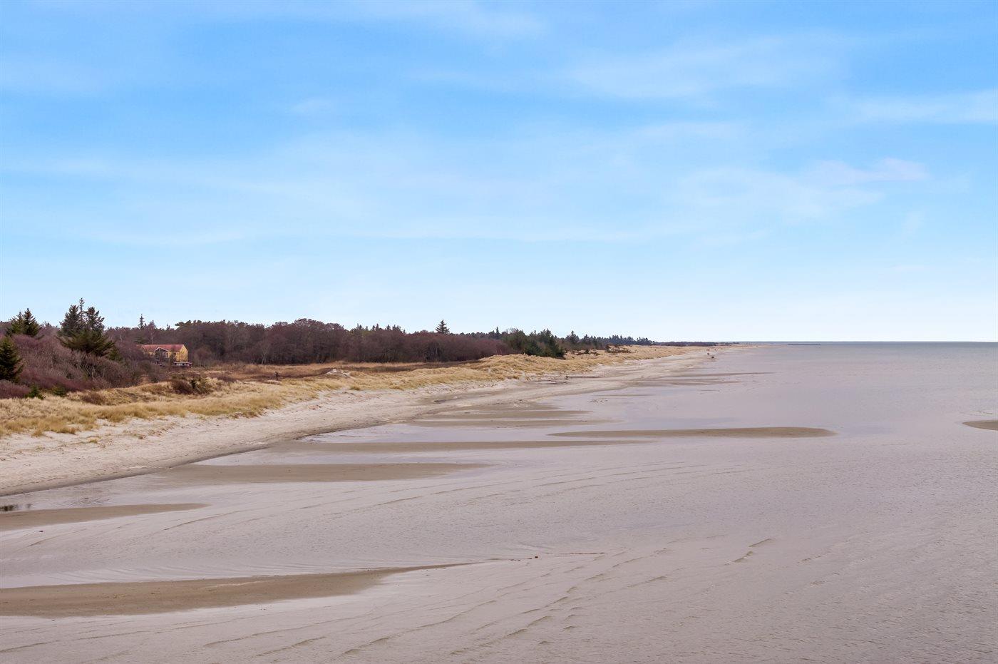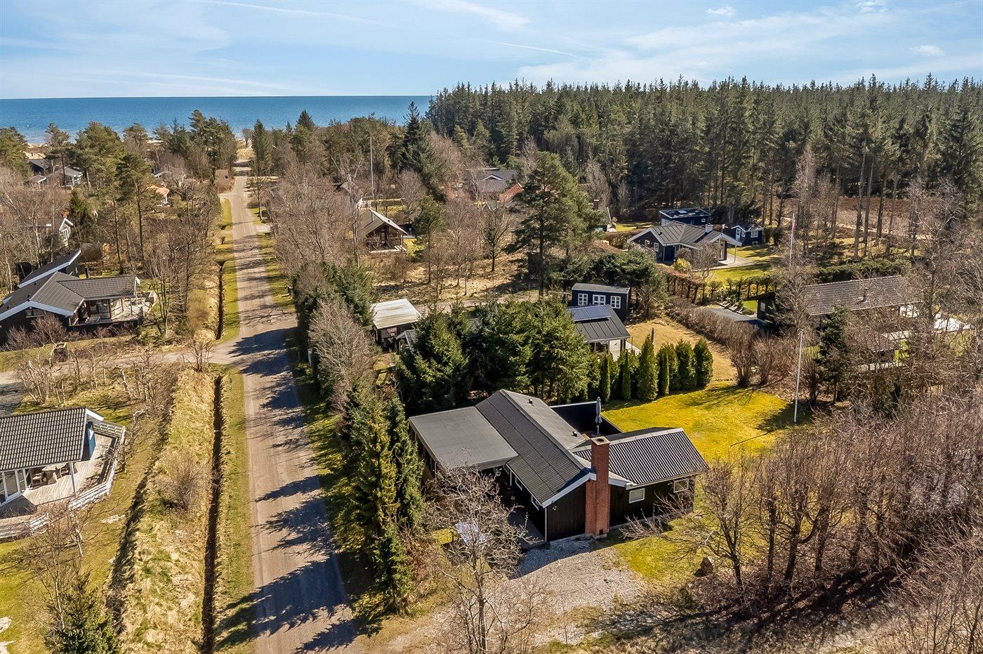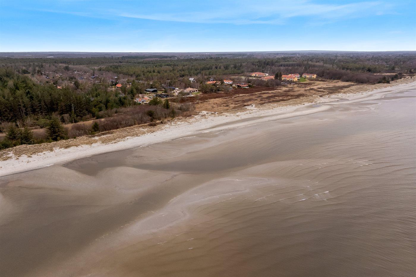 Ferieboligen er beliggende på en 1050 m² stor anlagt have. Avstand til hav er 350 m. Avstand til fjord er 3300 m. Nærmeste butikk ligger i en avstand på 3200 m. Golfbane i en avstand på 2800 m. Til ferieboligen hører åpent terrasseareal. I tillegg er det overdekket terrasse. Bålplass. Det er grill til rådighet. P-plass ved huset.