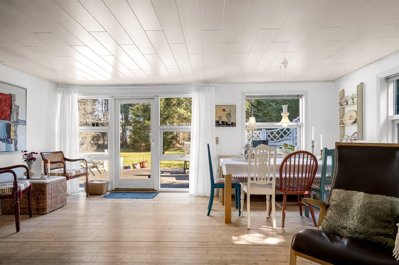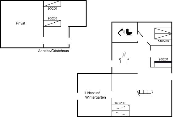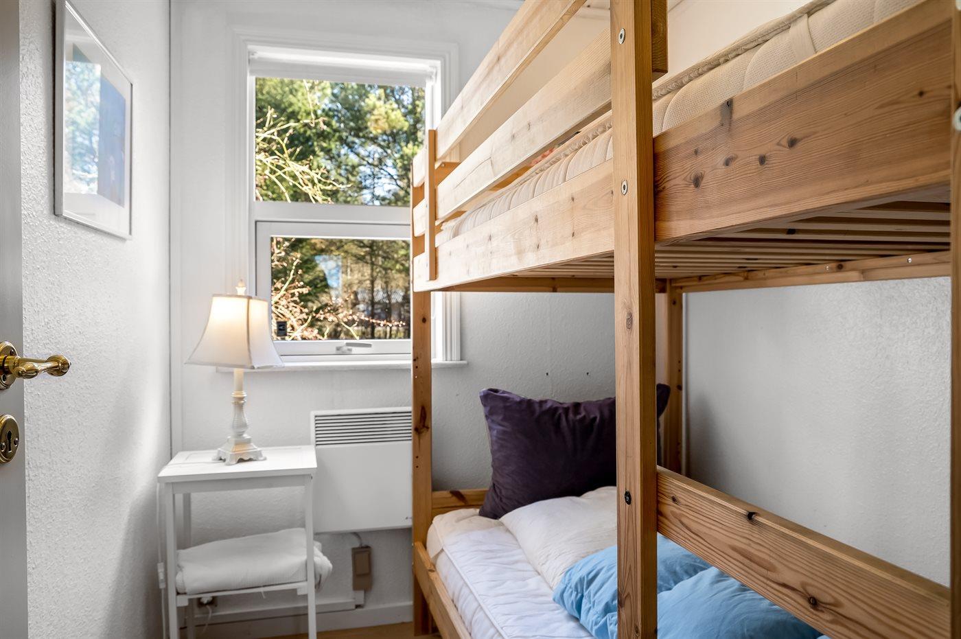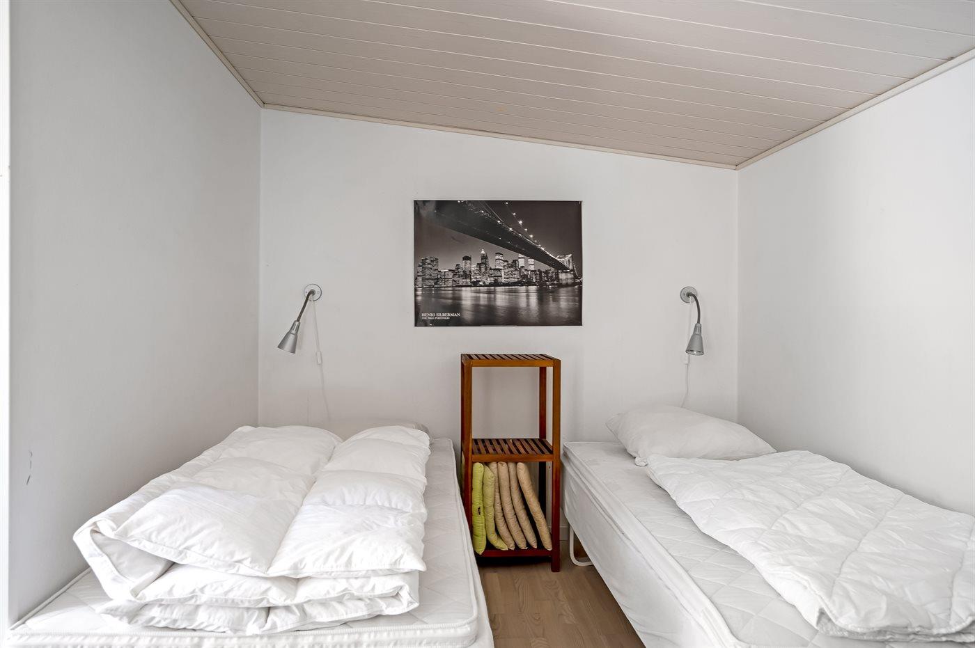 Det er i alt 3 soverom. Soveplassene fordeler seg på: 2 soveplasser i dobbeltseng. 2 soveplasser i enkeltsenger. 2 soveplasser i etasjeseng. 2 soveplasser i sovesofa (dobbelt). 2 av disse soveplasser finnes i annekset og 2 finnes i stuen.