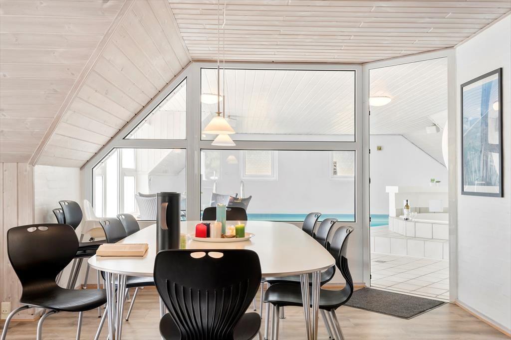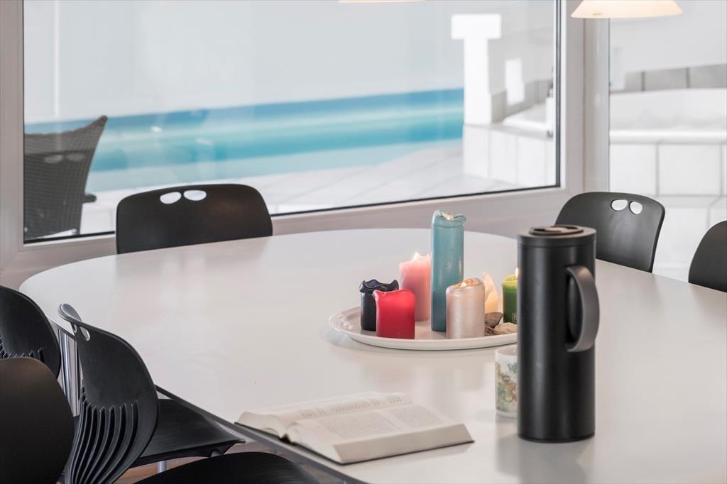 Im Inneren bietet das Ferienhaus helle und funktionale Wohnbereiche, in denen Küche, Essplatz und Wohnzimmer offen miteinander verbunden sind. Dies schafft einen natürlichen Fluss im Haus und macht es einfach, gemeinsam zu kochen, zu essen und entspannte Ferienmomente zu verbringen. Eine große Fensterfront zwischen dem Essbereich und dem Poolraum verbindet die Räume und sorgt für ein offenes Raumgefühl, bei dem die Gemeinschaft erhalten bleibt, auch wenn sich einige im Pool aufhalten.