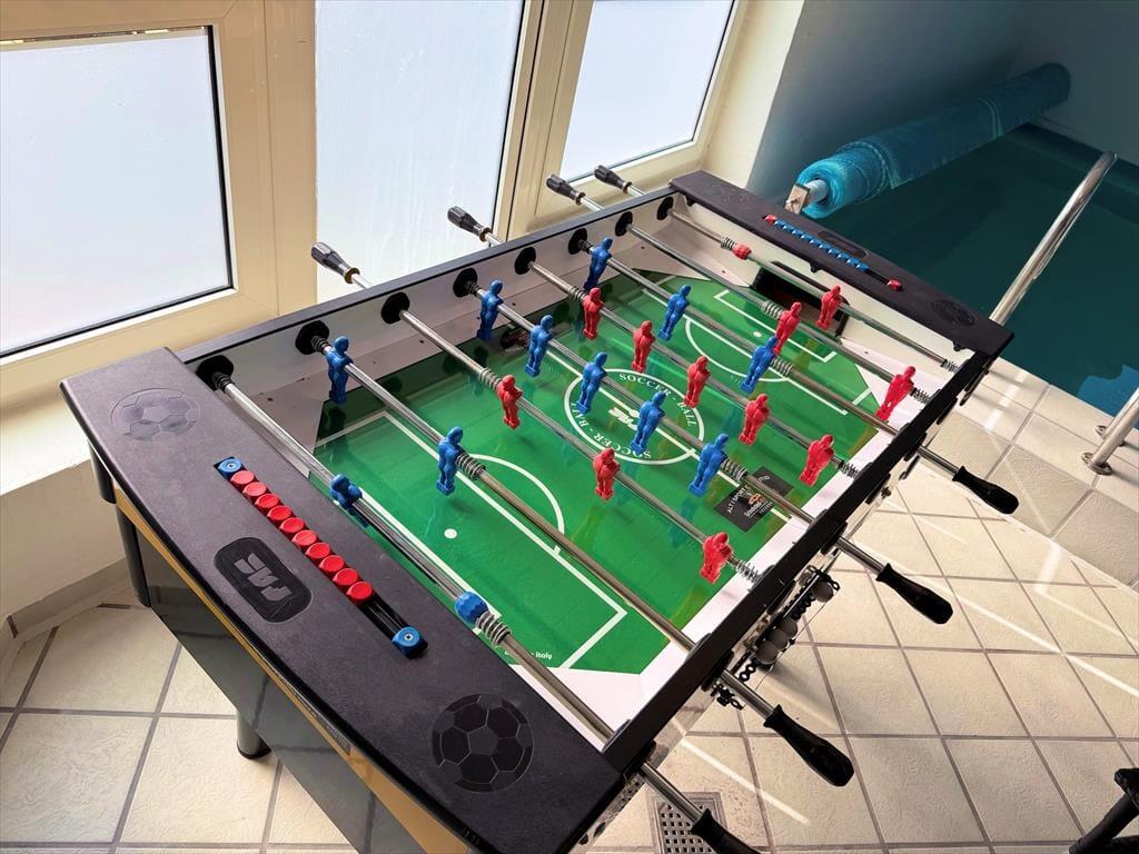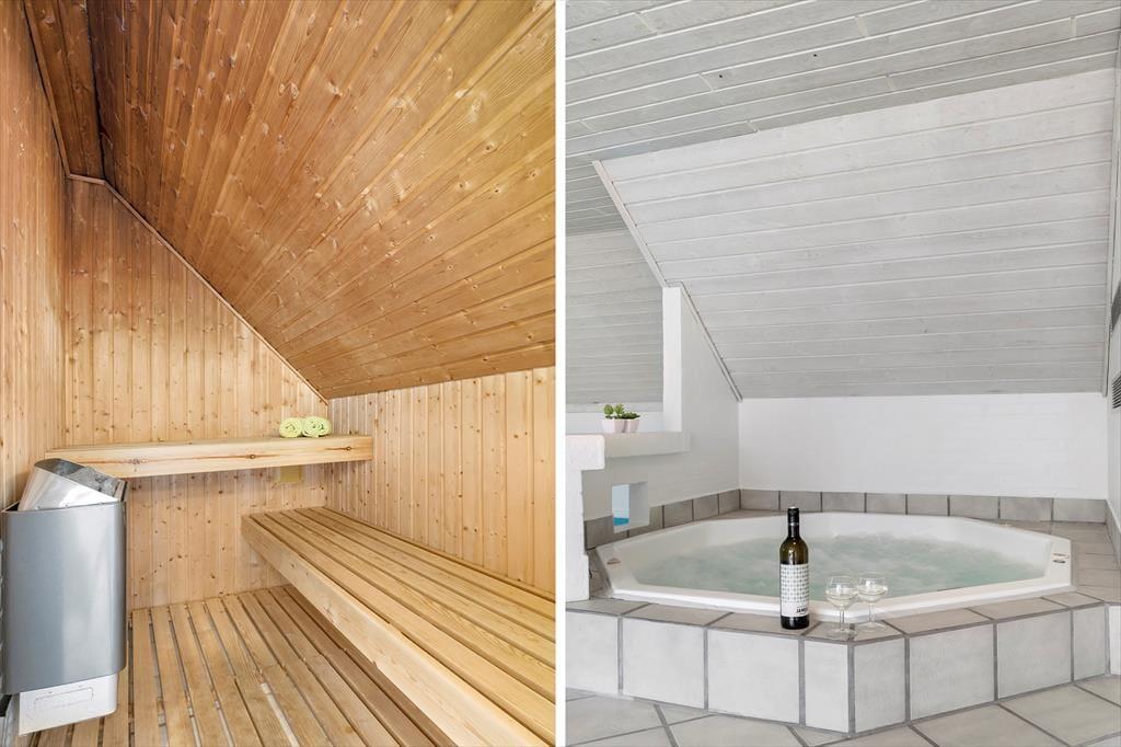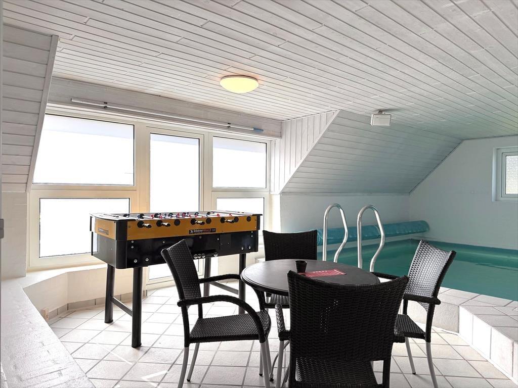 Der Poolraum ist ein naheliegender Treffpunkt und lädt zu stundenlangem Wasserspaß und Bewegung ein. Nach dem Schwimmen können Sie im Indoor-Whirlpool entspannen oder die Wärme der Sauna genießen. Das Ferienhaus verfügt über komfortable Schlafzimmer mit Fokus auf Ruhe und Entspannung sowie über zwei Badezimmer, sodass auch viele Gäste problemlos zusammen wohnen können.