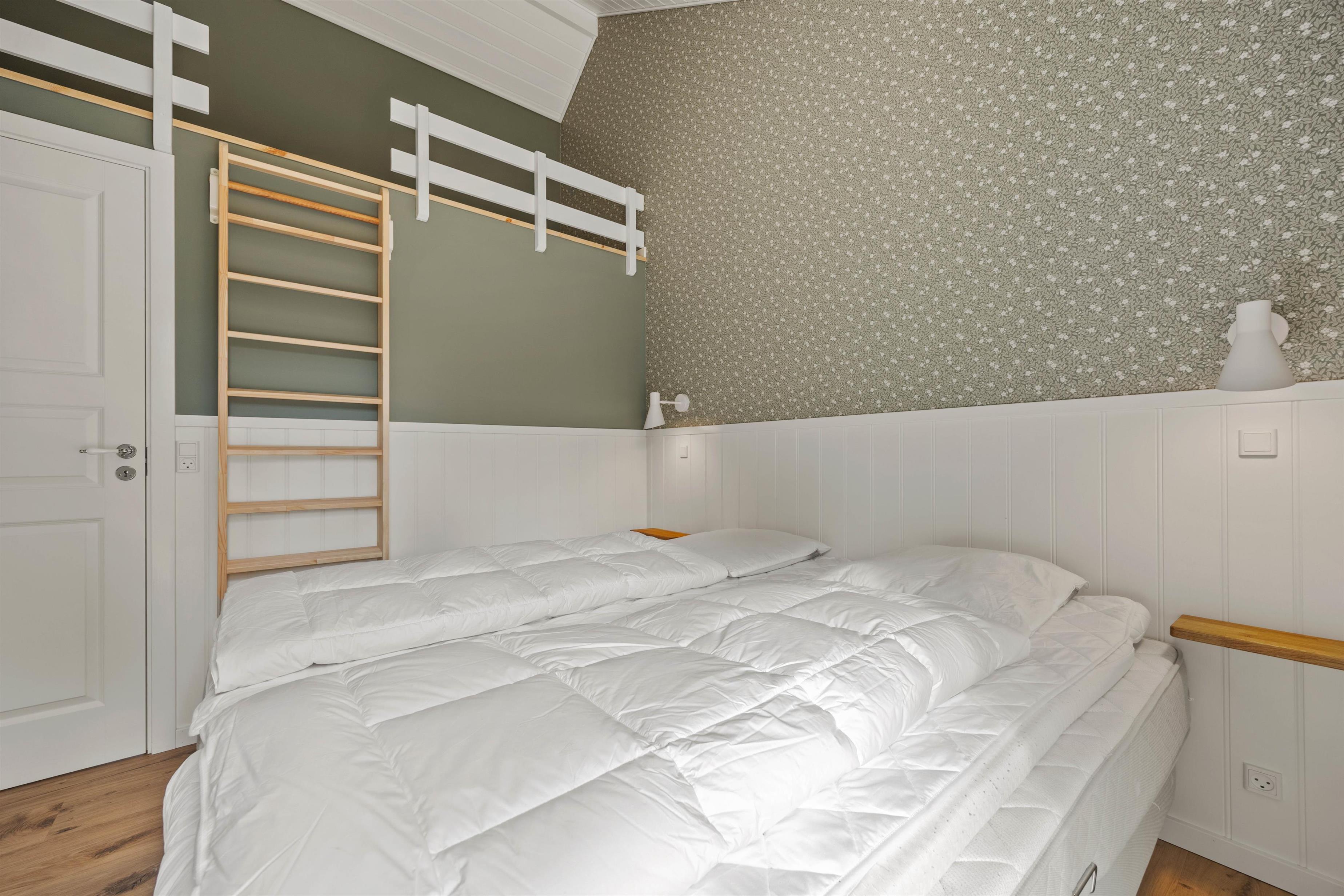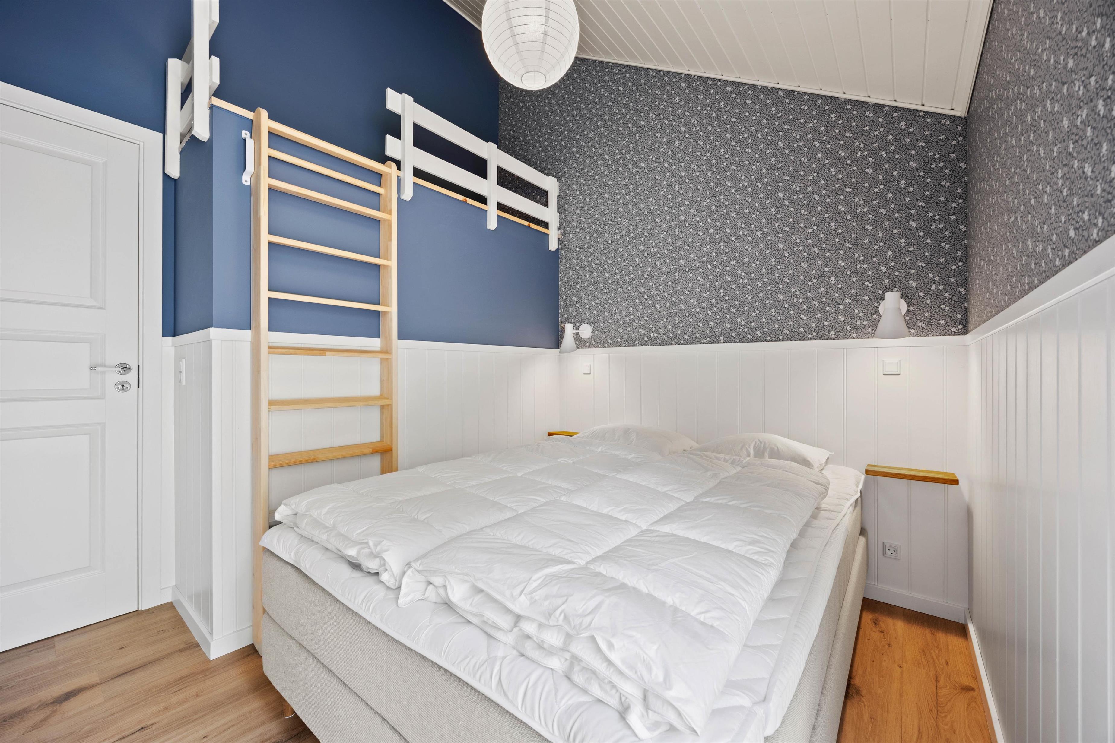 The holiday home features three cosy bedrooms, furnished with two double beds and two single beds. Additionally, three mezzanine areas provide extra sleeping options, ensuring flexible accommodation arrangements. Each bedroom is individually styled and equipped to a high standard, offering perfect spaces for rest and relaxation. The living room's wood-burning stove provides a warm and comfortable atmosphere, while the open and covered terraces, along with the large dune plot, offer plenty of space for outdoor activities and relaxation.