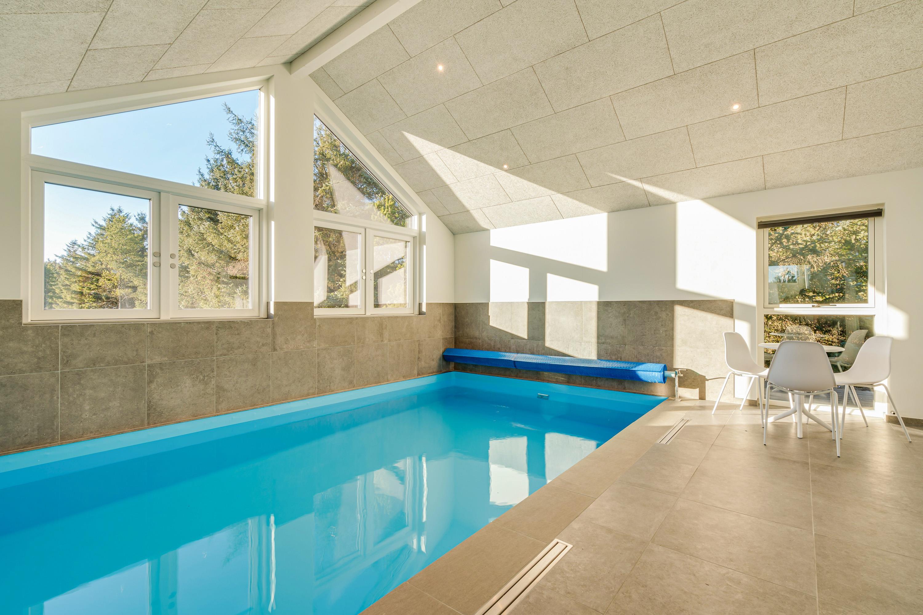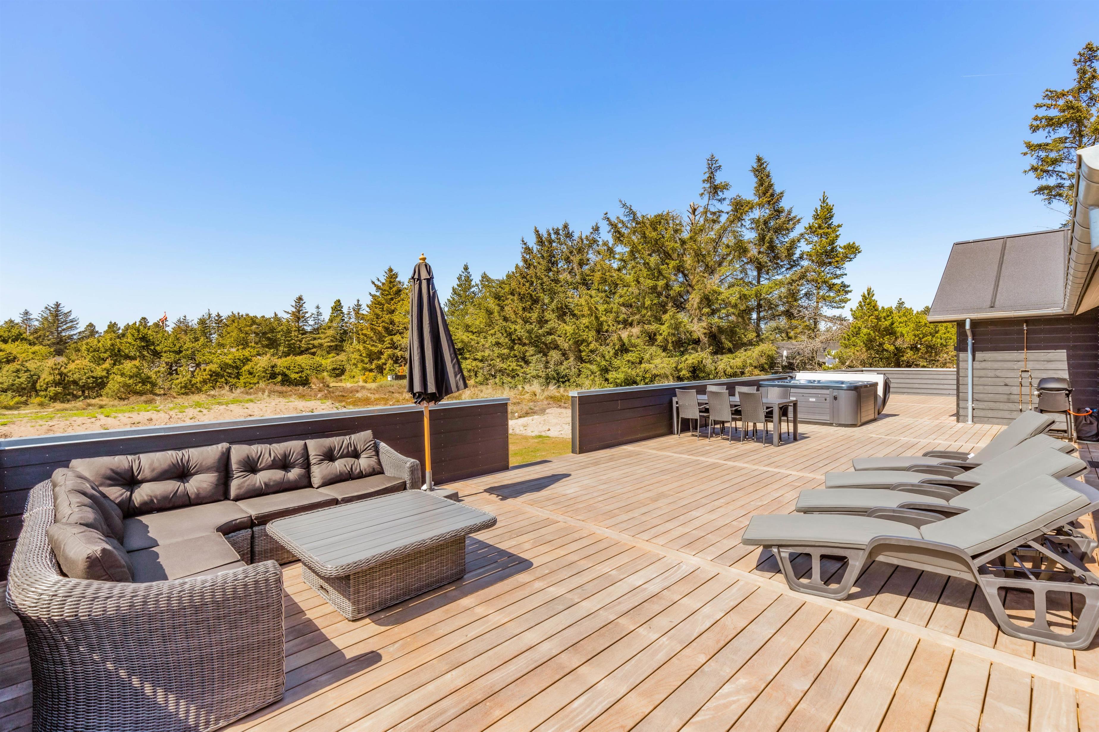 The spacious holiday home at Søren Gades Mark 28 in Blåvand features a 22-square-metre swimming pool, along with an outdoor hot tub and a beautiful sauna.