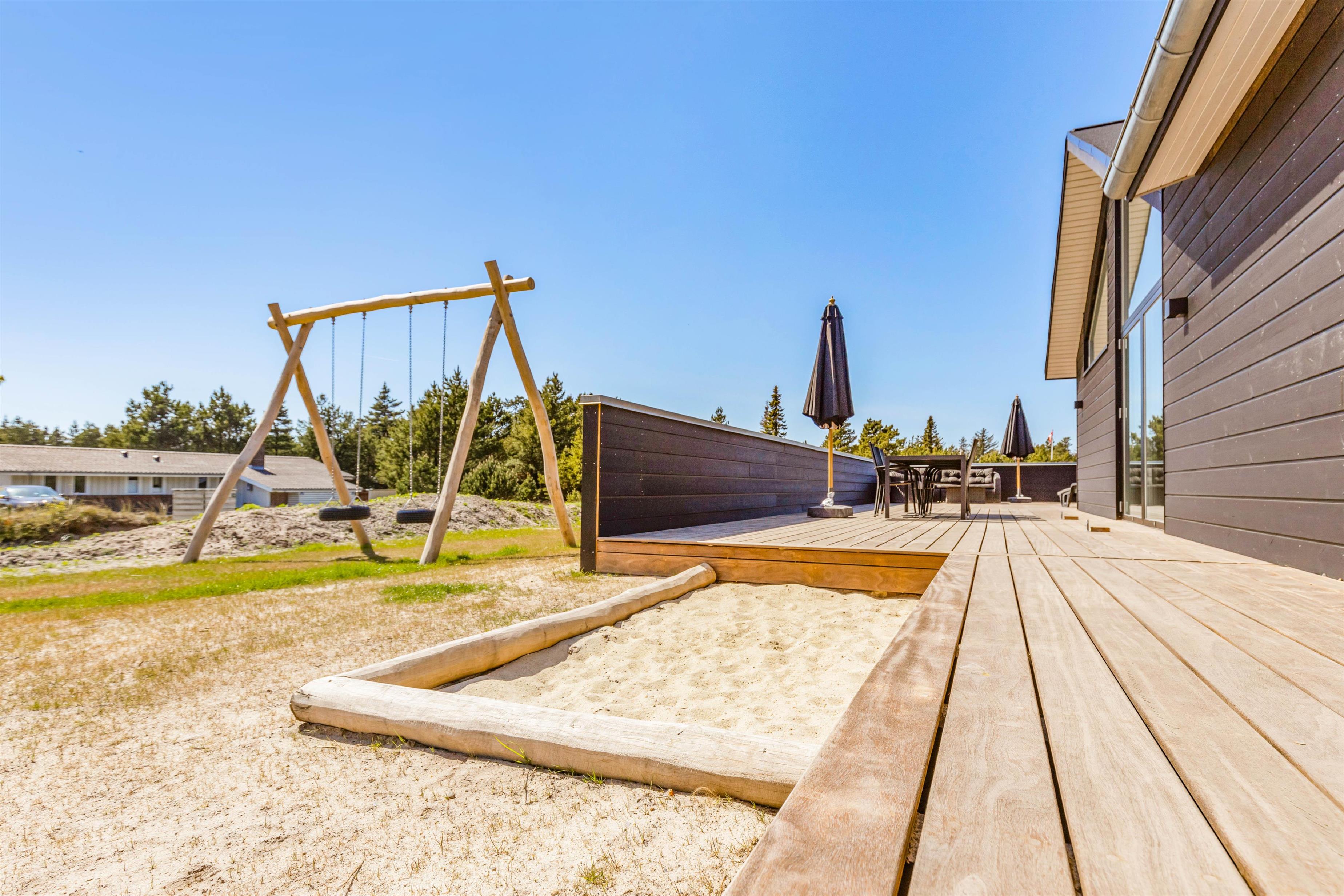 Spacious outdoor area with terrace, swing and sandpit