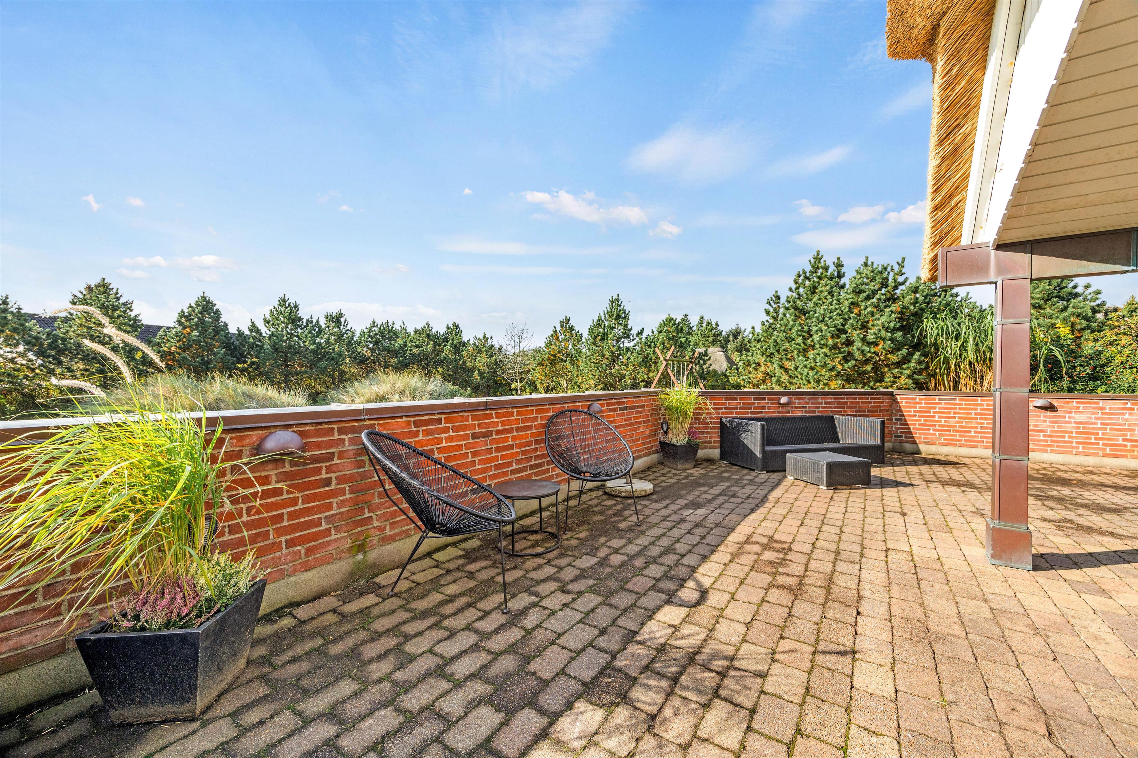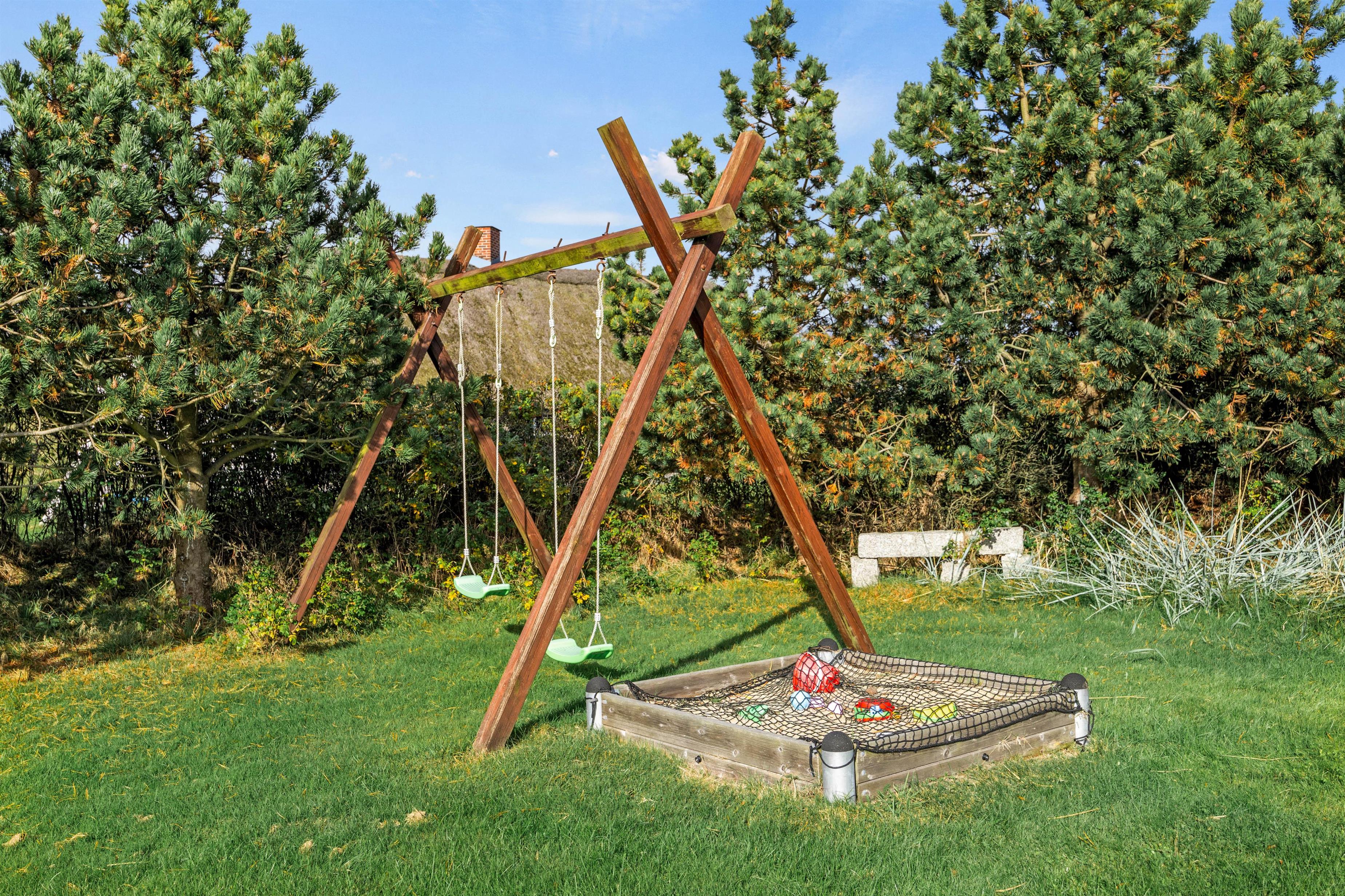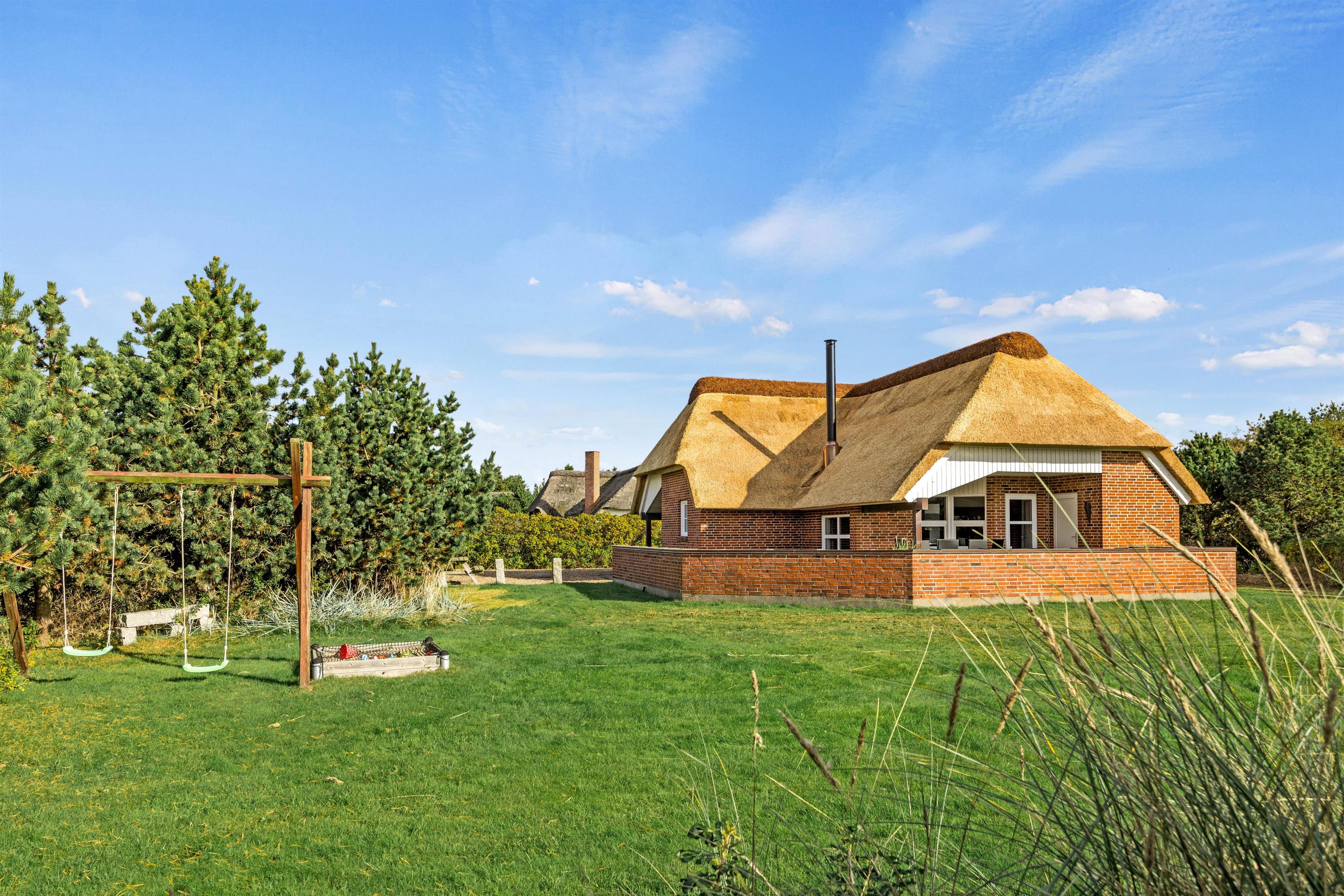 The 1,800-square-metre plot offers plenty of privacy. Children can enjoy the well-maintained lawn, swing set and sandbox. The sheltered terrace, partially covered, provides various spots to enjoy the fresh North Sea air. A barbecue is available for summer evening entertaining.