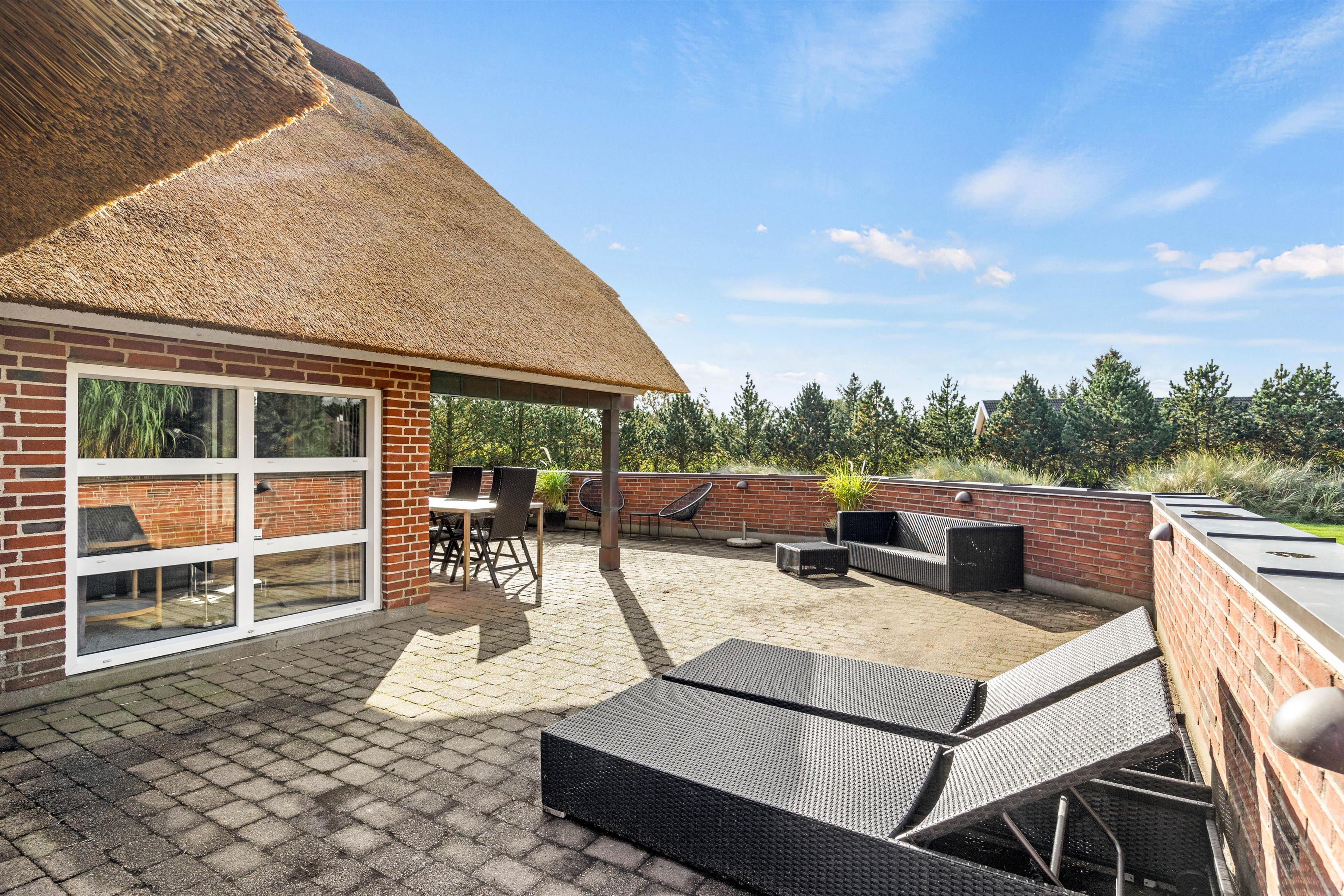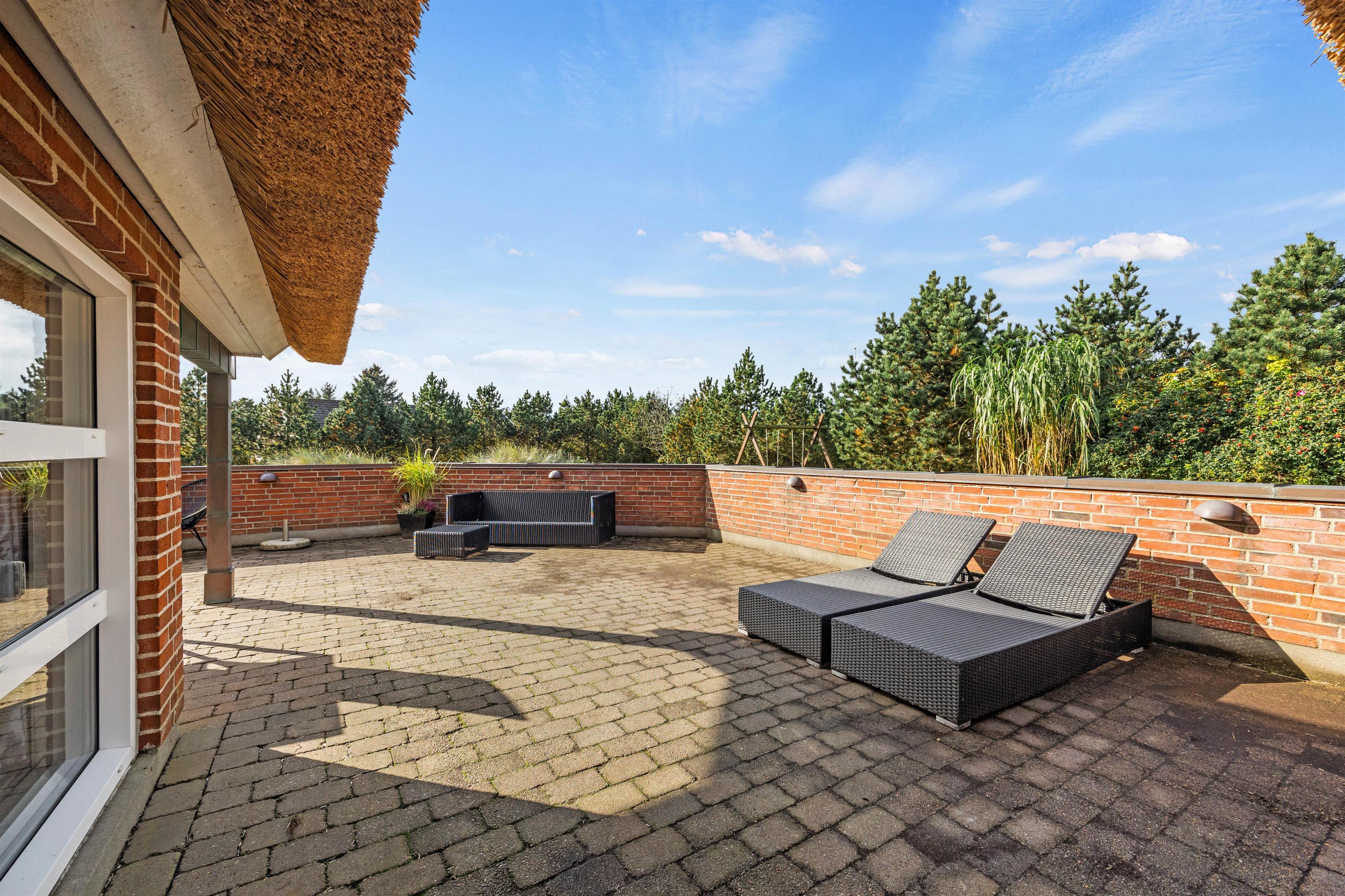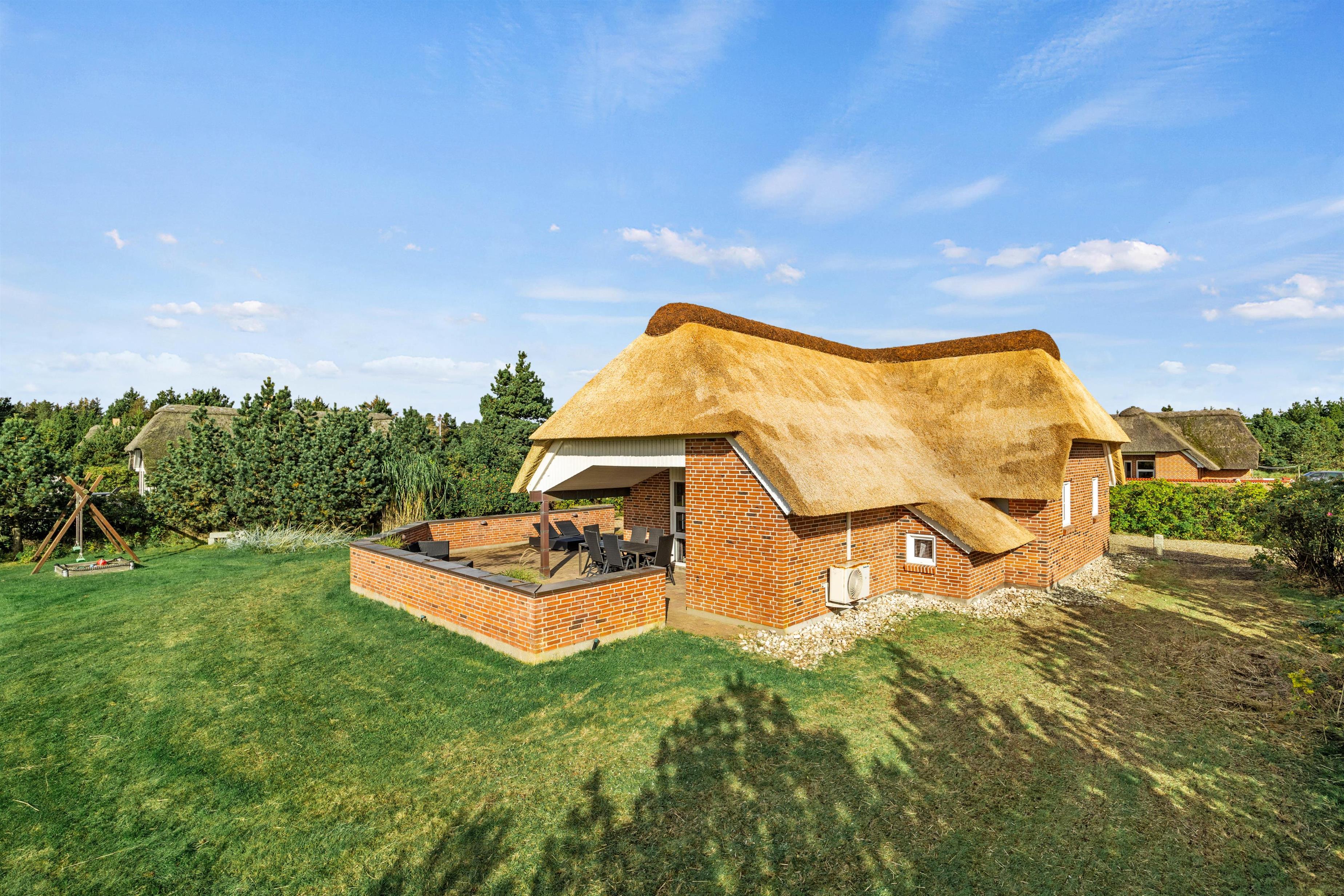 The 1,800-square-metre plot offers plenty of privacy. Children can enjoy the well-maintained lawn, swing set and sandbox. The sheltered terrace, partially covered, provides various spots to enjoy the fresh North Sea air. A barbecue is available for summer evening entertaining.