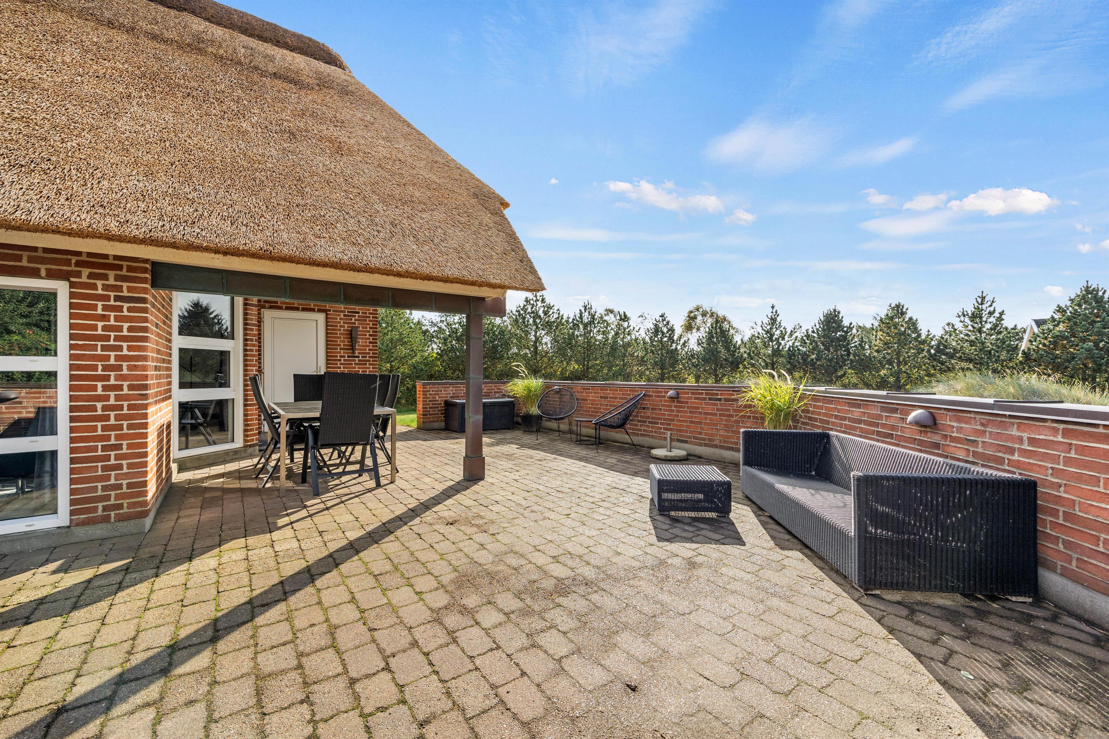 The entire living area features tiled floors with underfloor heating. Additional warmth is provided by a wood-burning stove. The comfortable leather sofas and armchairs offer perfect spots to put your feet up and unwind. A special feature is the traditional Danish 'hyggekrog' - a cosy nook furnished with cushions and a mattress, perfect for curling up with a good book.
