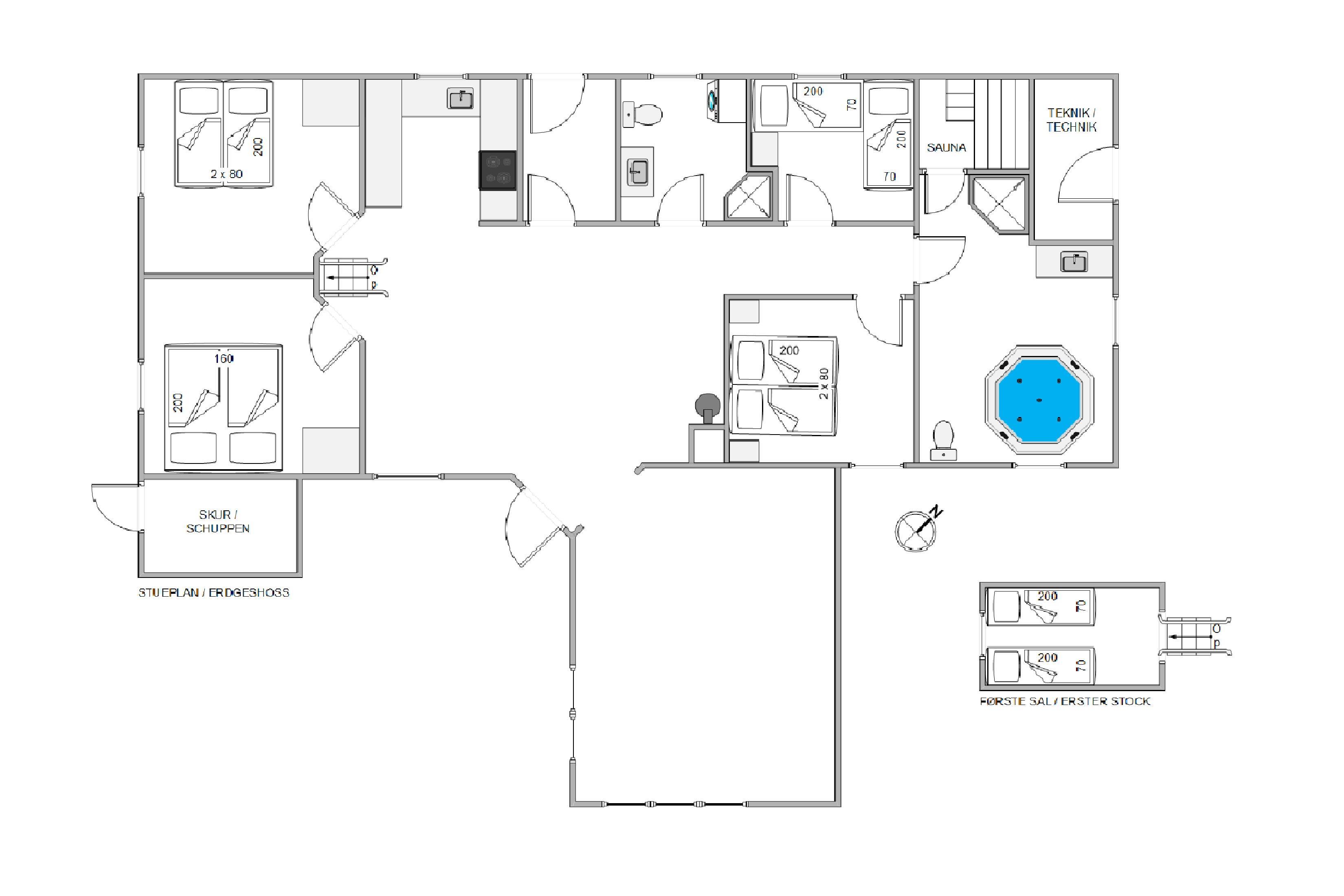 Spread across 143 square metres, the holiday home features four bedrooms: three with double beds and one with twin beds. Two additional sleeping spaces are available in the open loft area - a particularly cosy spot that children will love. There are two bathrooms, both with underfloor heating, ensuring no morning queues.