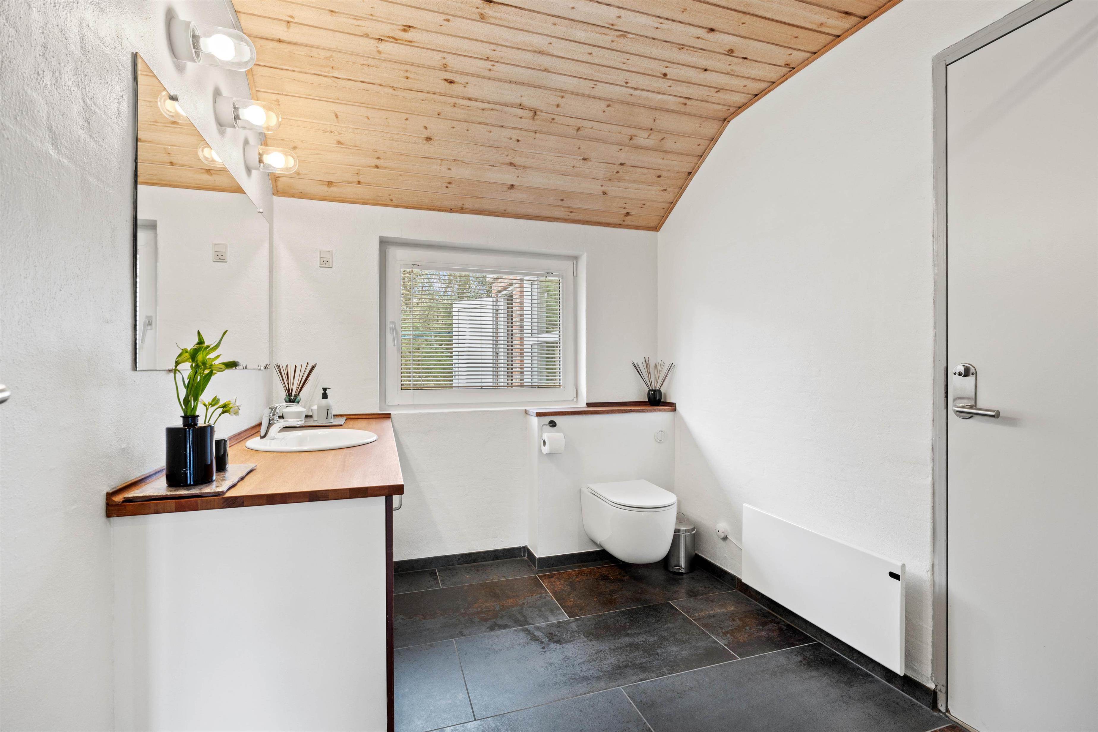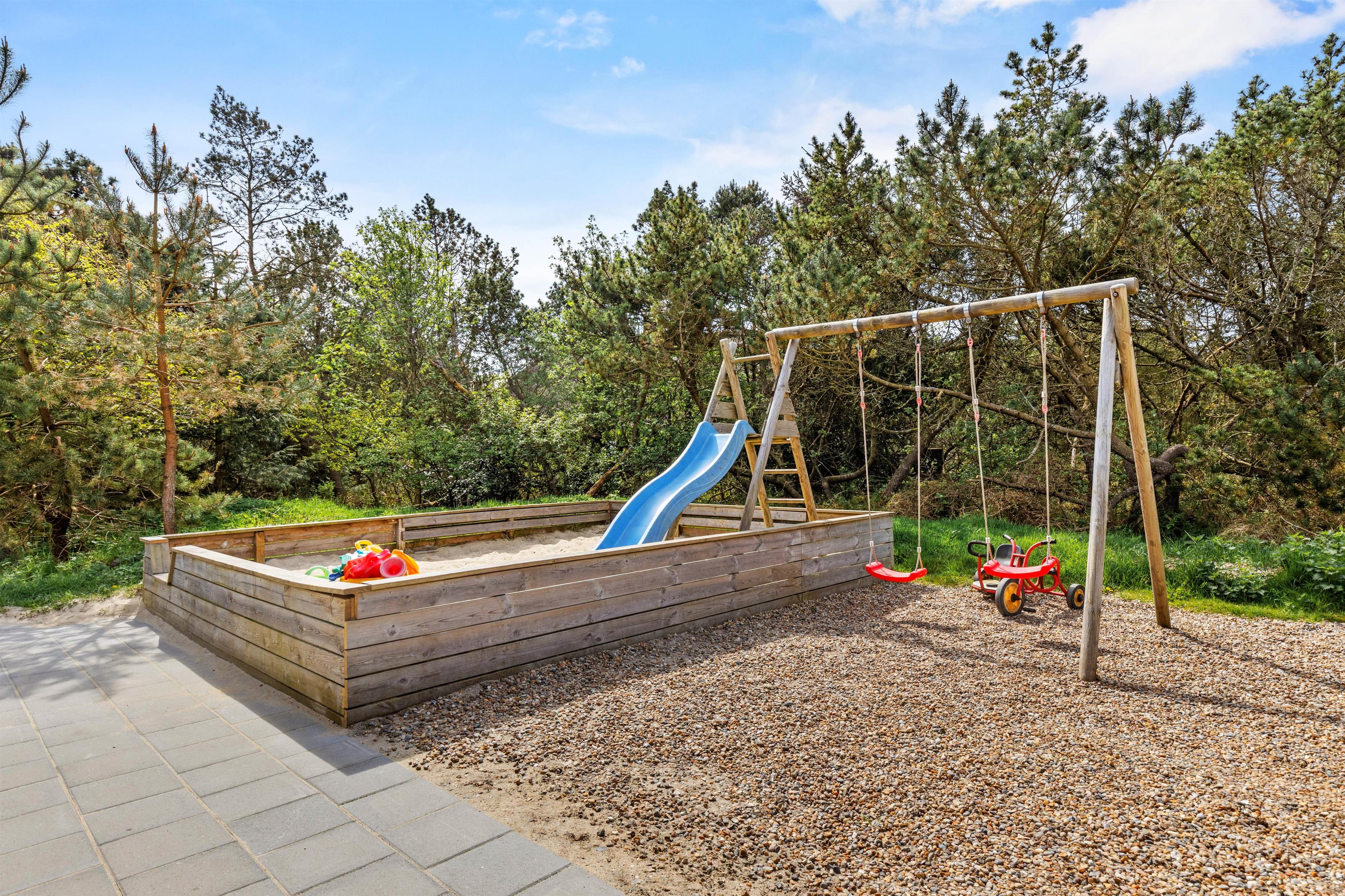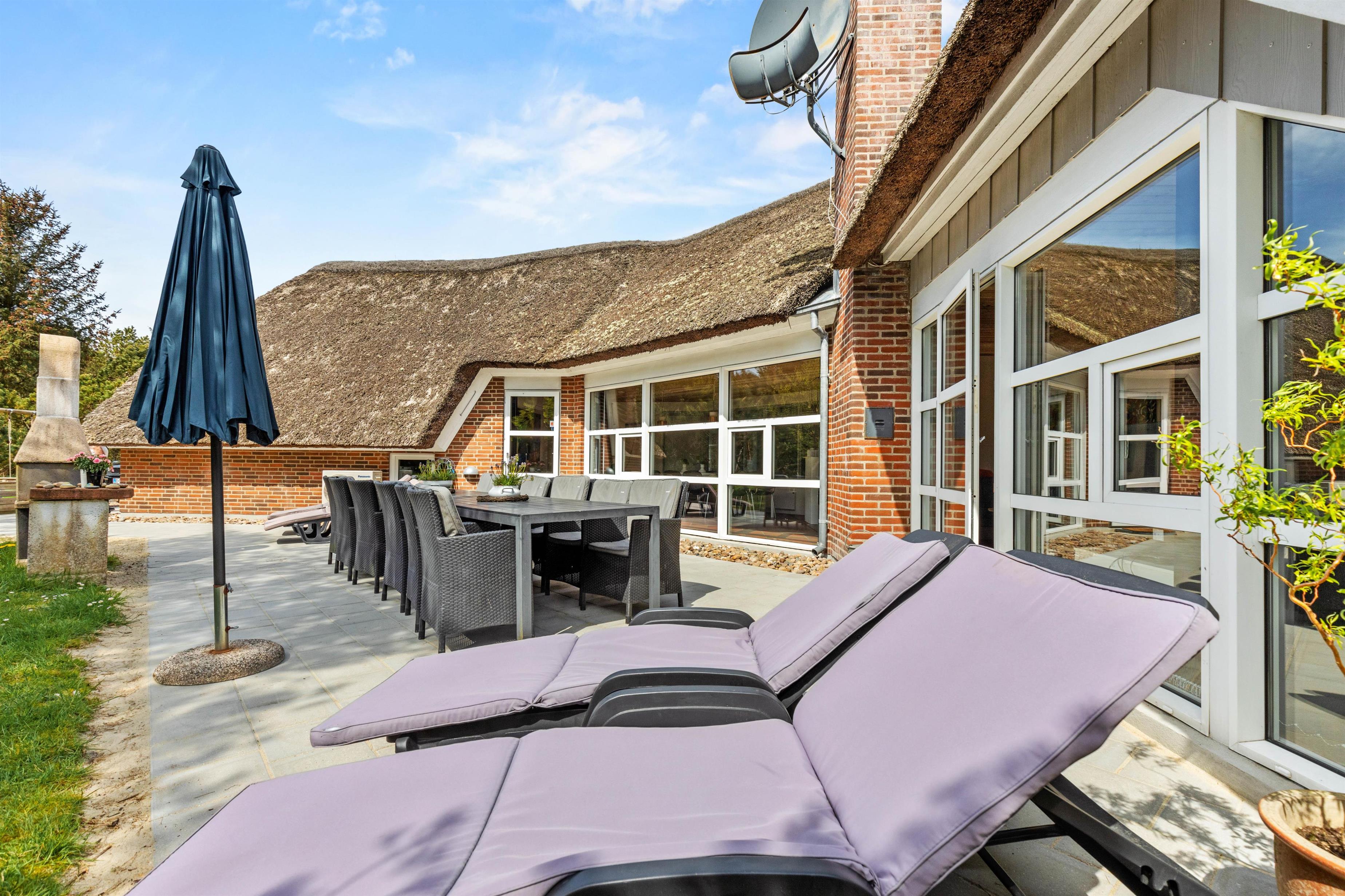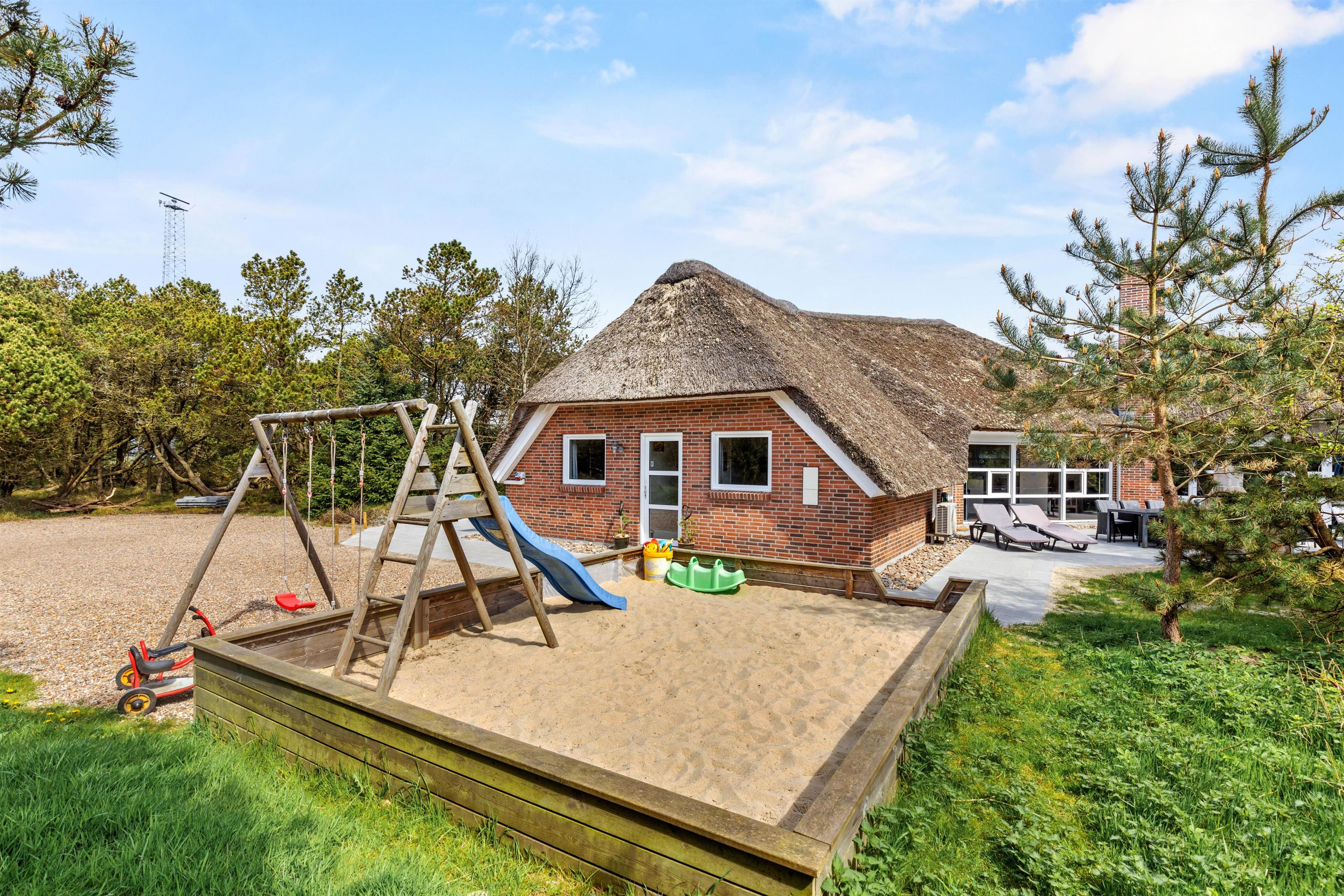 The thatched holiday home at Vestermarken 5B sits on extensive natural grounds, secluded and surrounded by deciduous and coniferous trees. On the open terrace, you can relax on comfortable garden furniture and sun loungers while children enjoy the swing, slide, and sandpit.