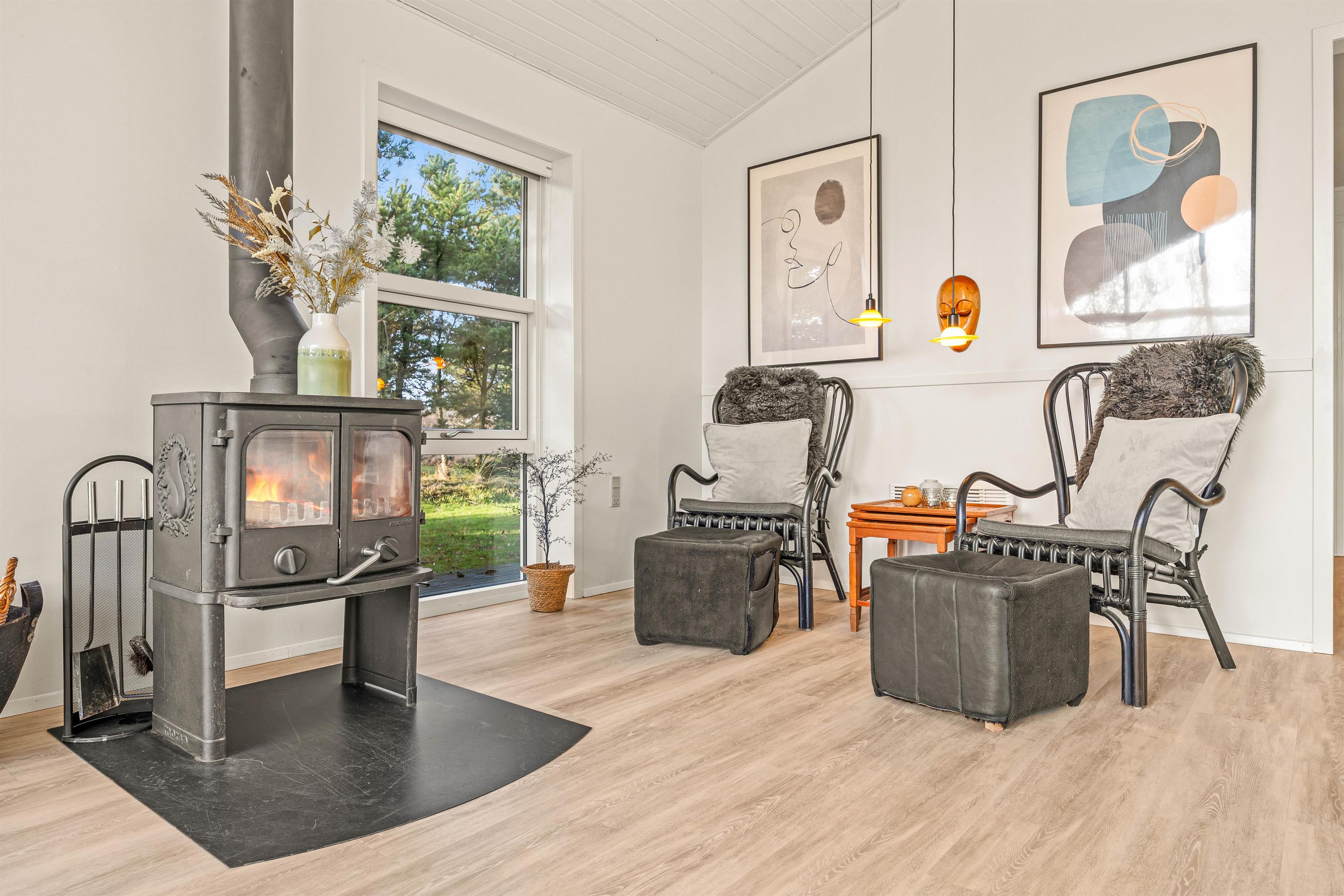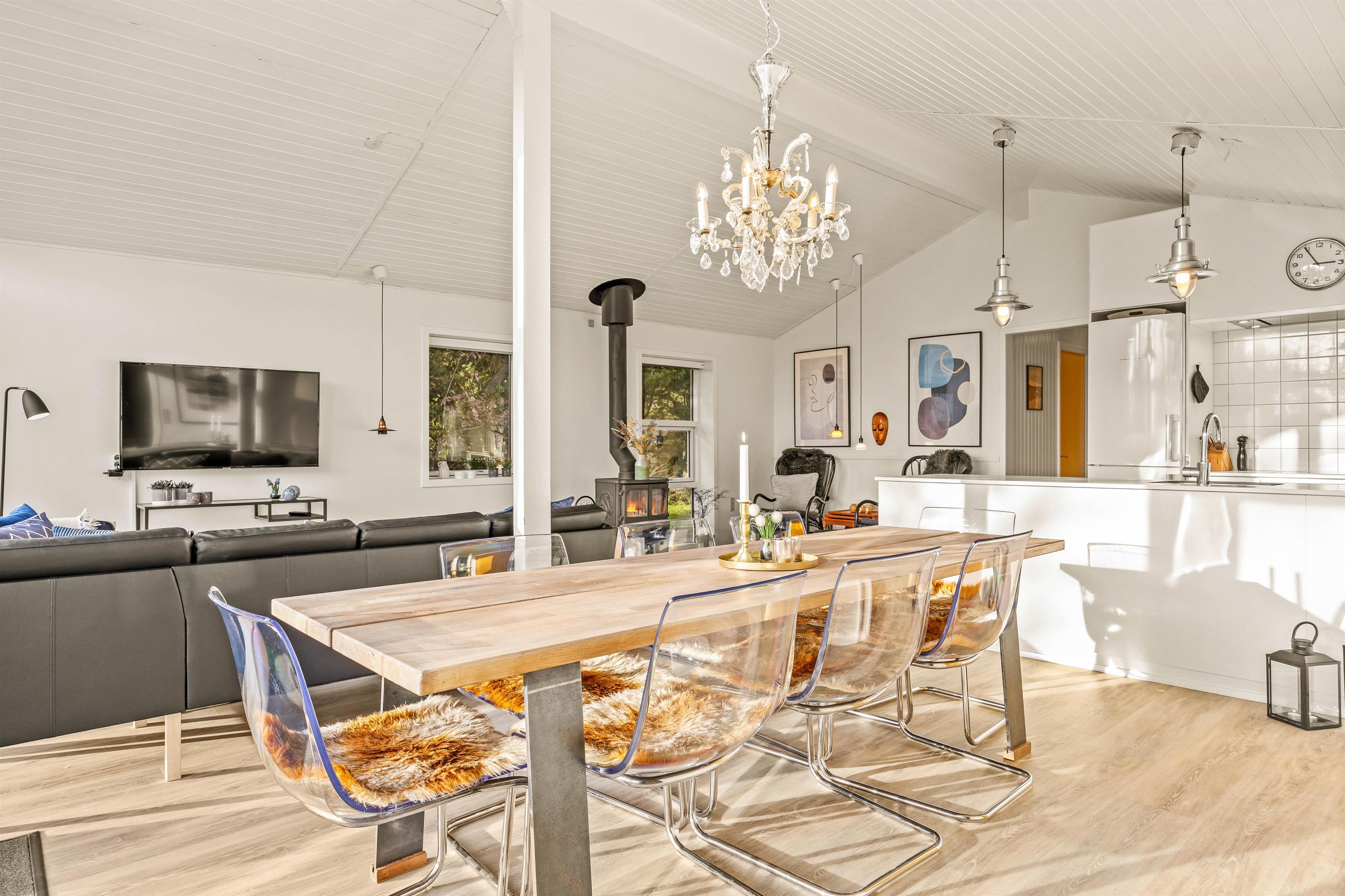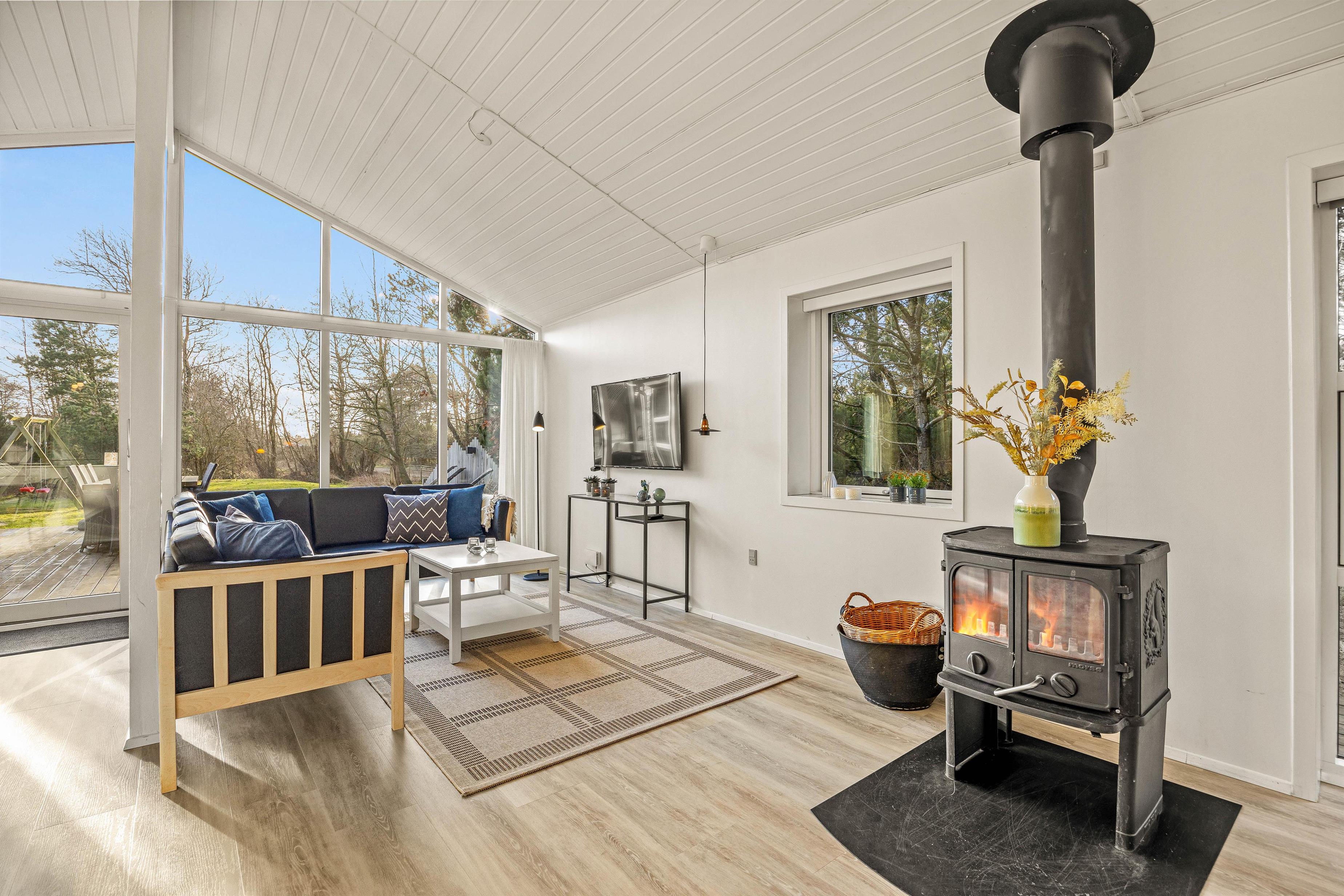 You can enjoy Scandinavian cosiness and an open atmosphere in the living area with its wood-burning stove and open-plan kitchen. You'll spend many harmonious hours cooking, playing games and relaxing while enjoying stunning views through the large window front.