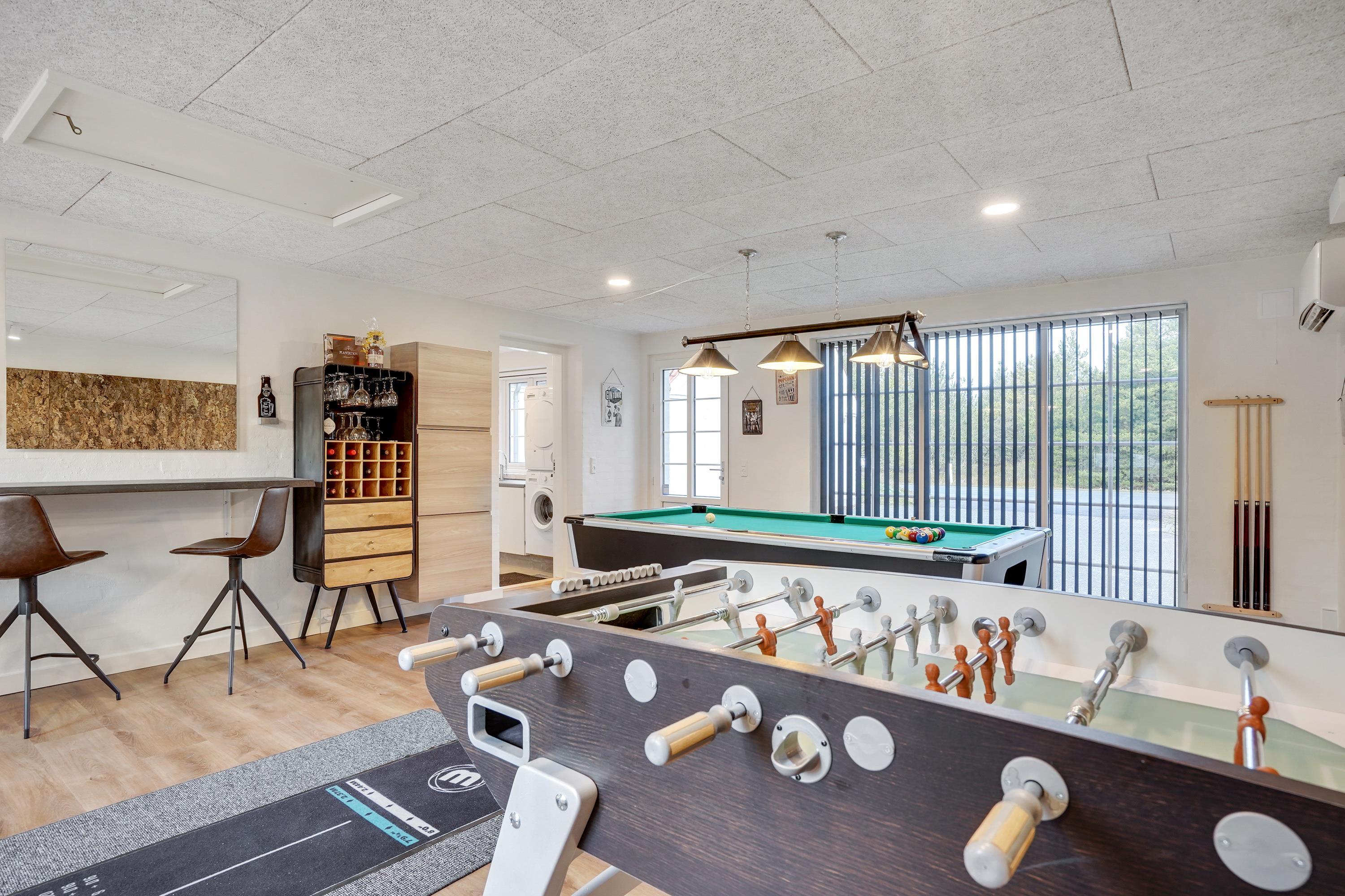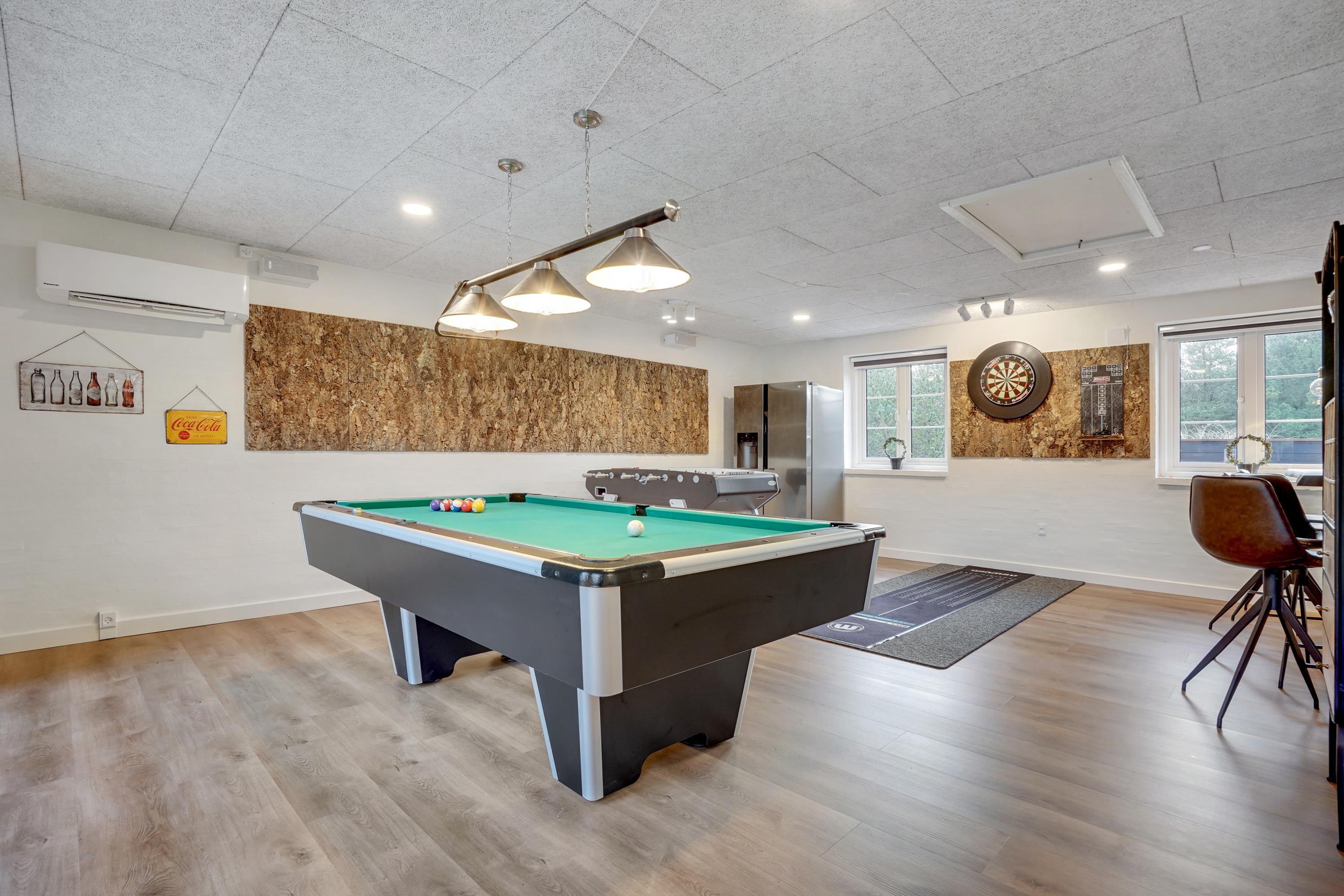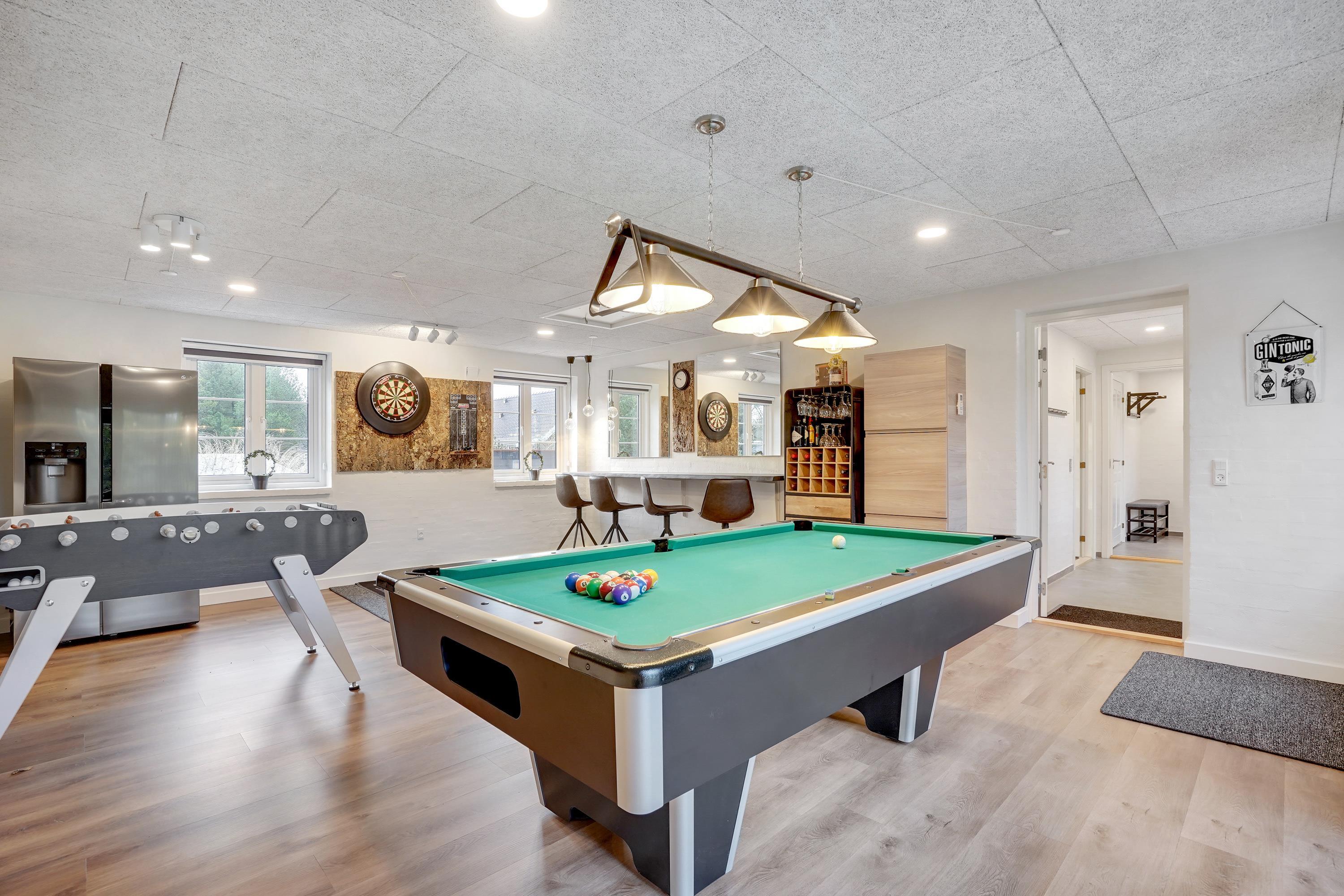 Spacious games room with pool table, table football and darts