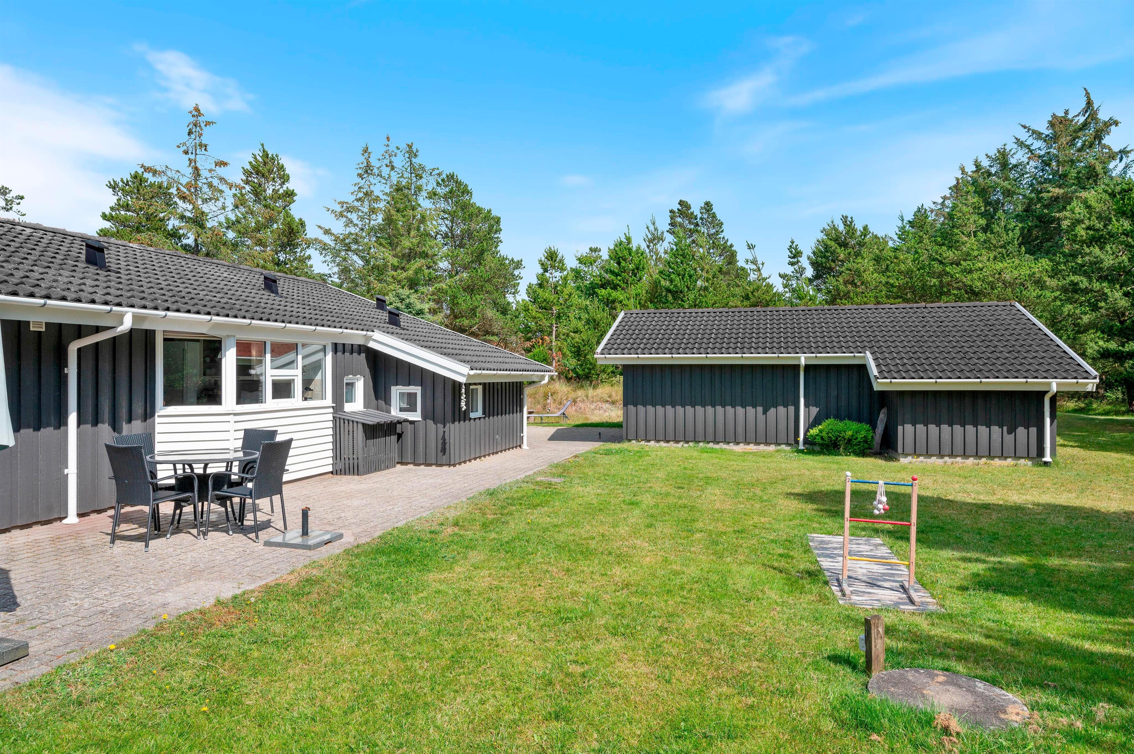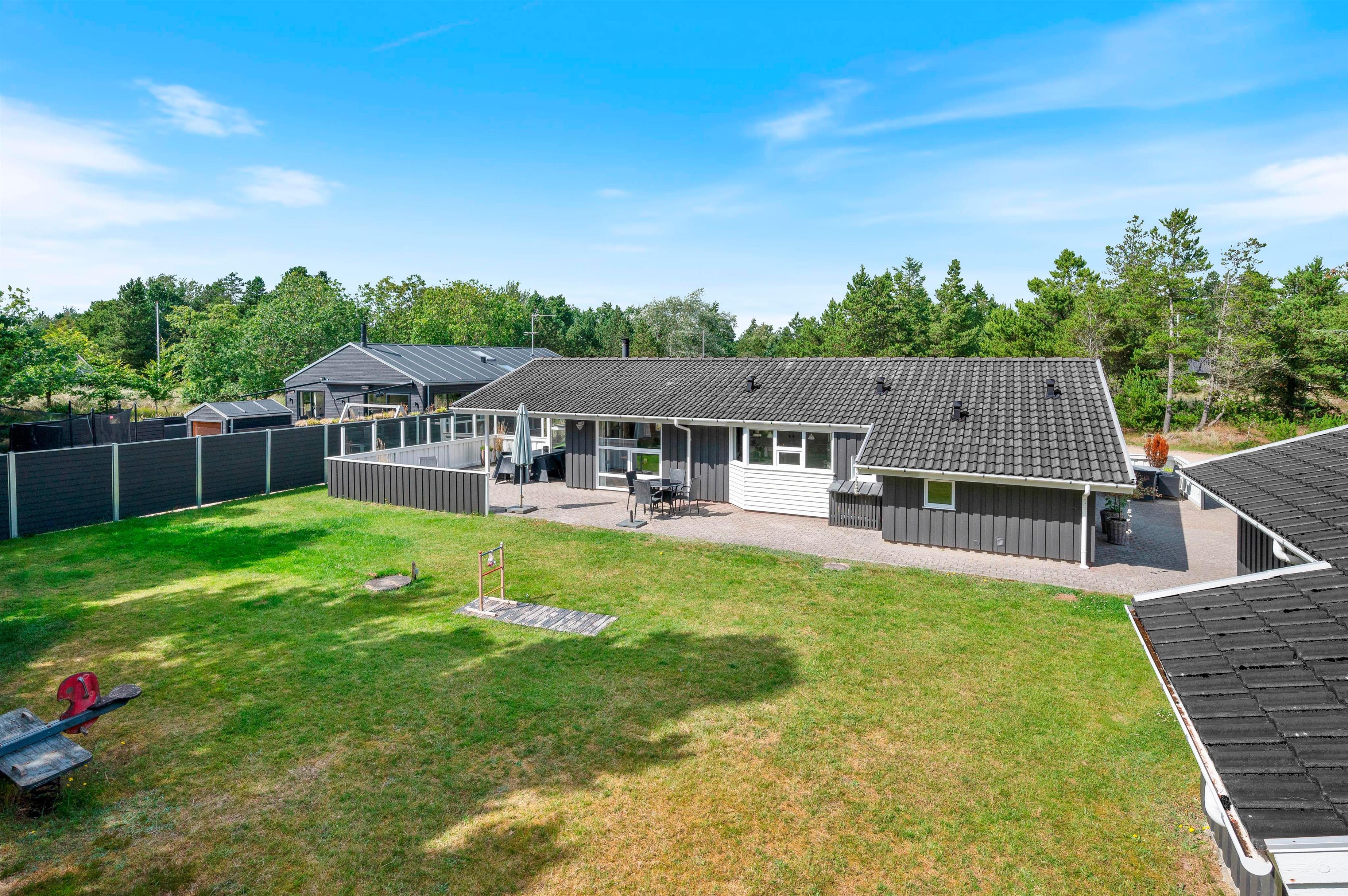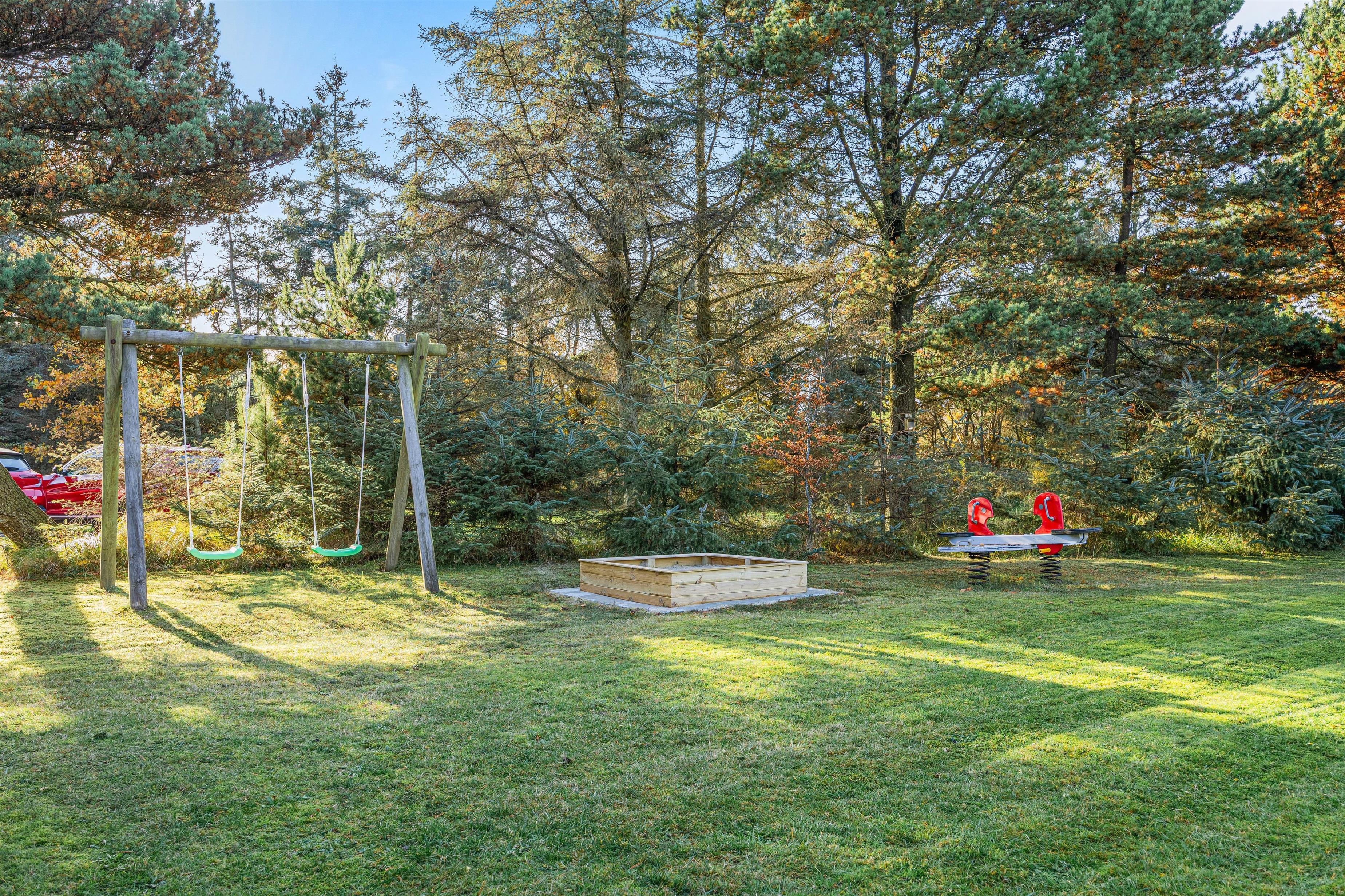 The holiday home enjoys a beautiful setting on a 2,469-square-metre natural plot surrounded by coniferous trees. There's a swing and sandpit for children. Part of the grounds features a lawn area, offering plenty of space for ball games. In the evening, you can enjoy barbecues on the covered terrace and watch the sunset as the day draws to a close.
