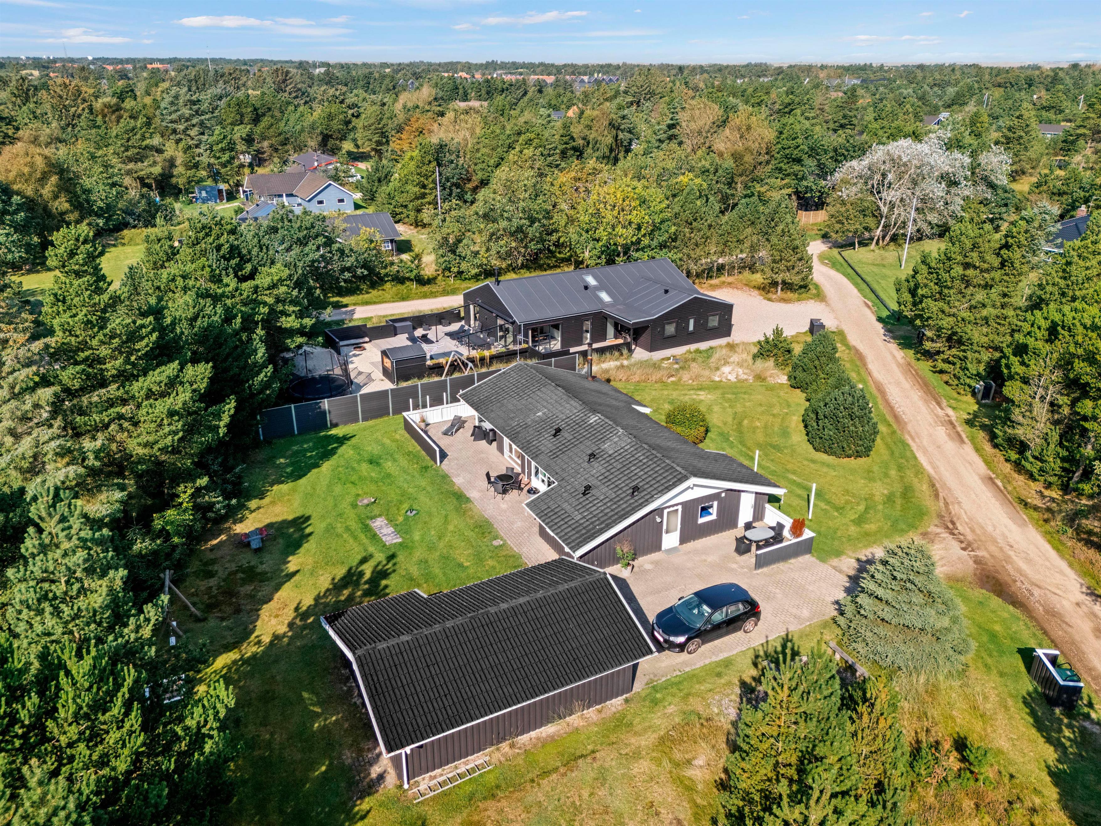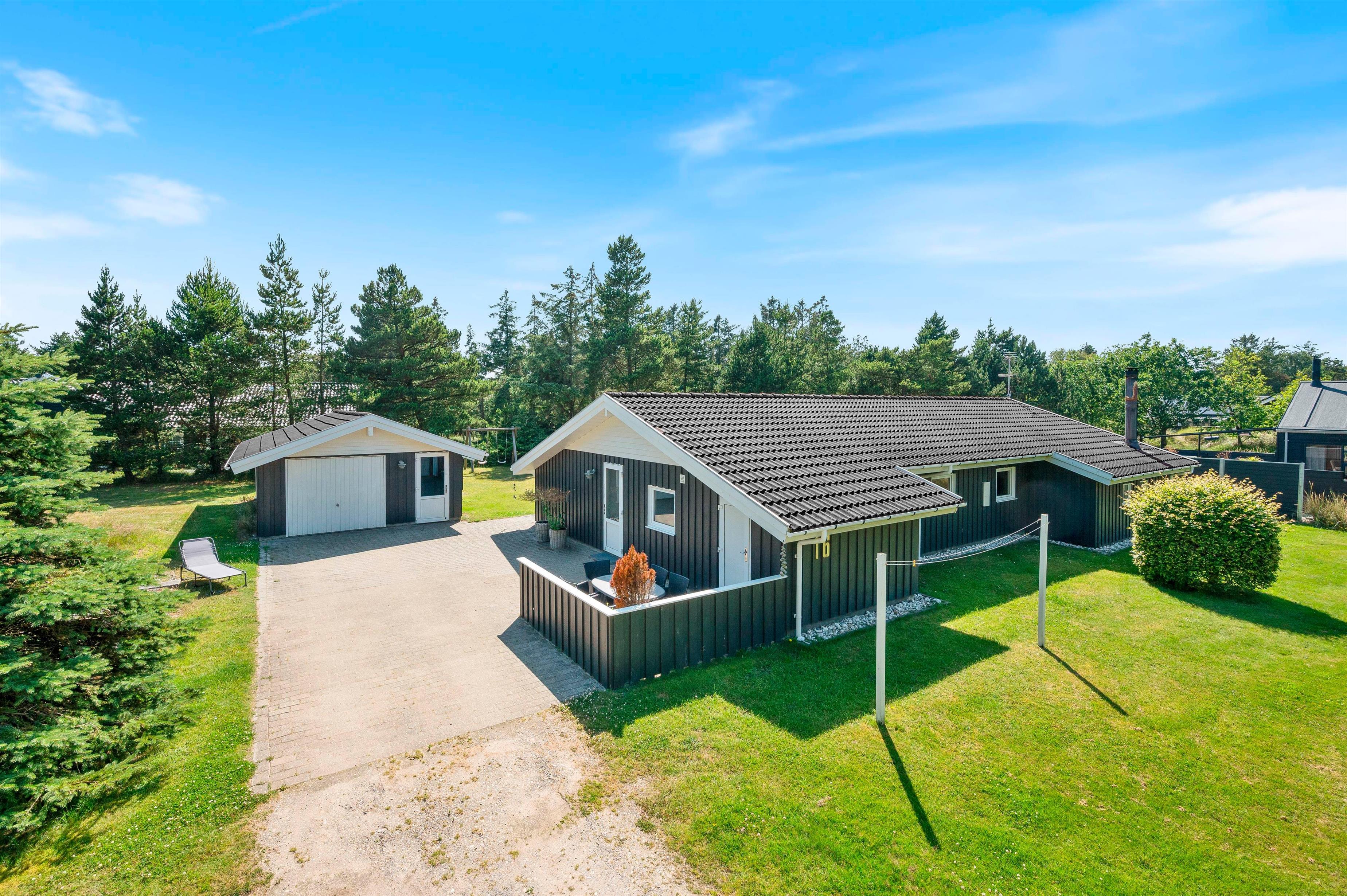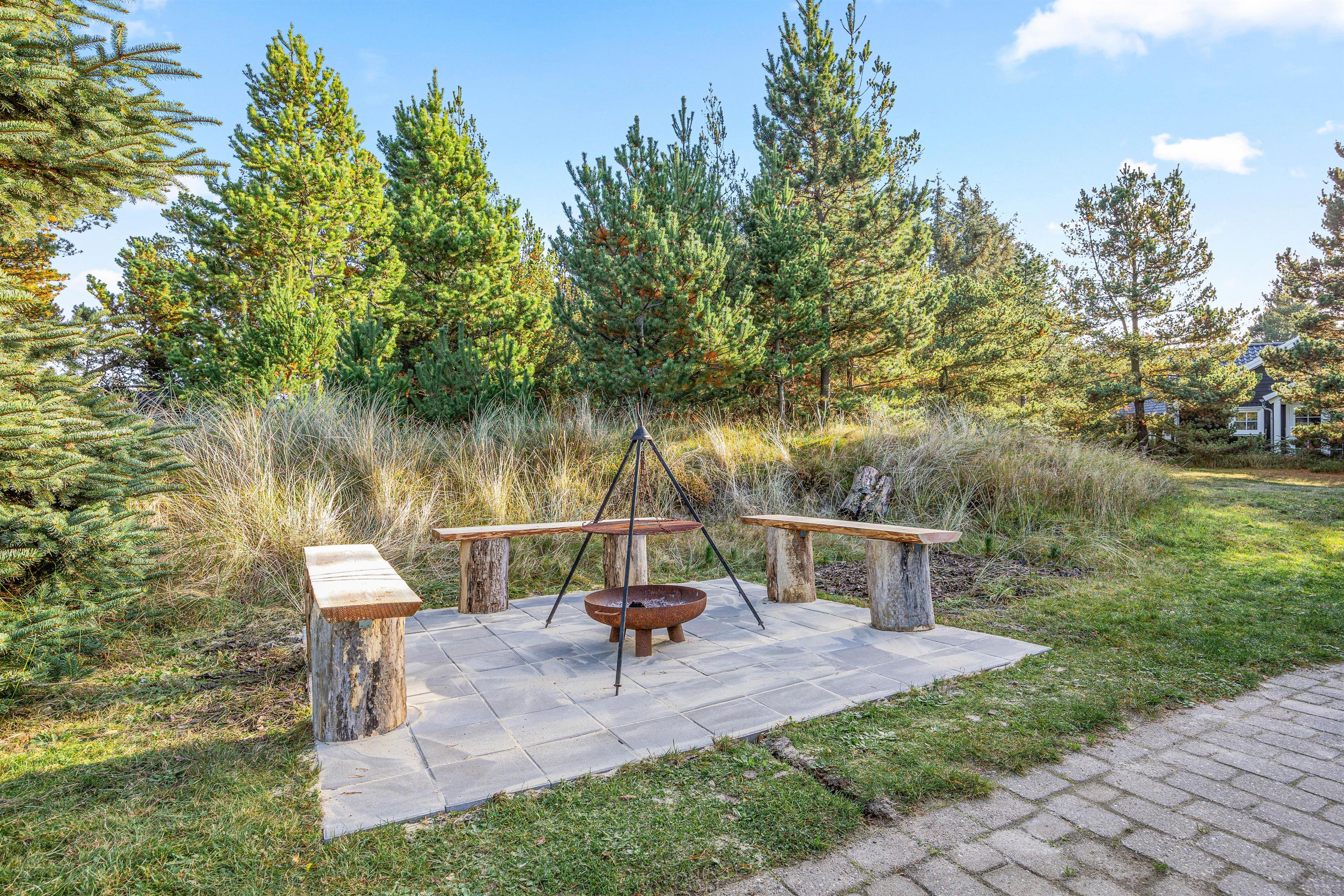 The holiday home enjoys a beautiful setting on a 2,469-square-metre natural plot surrounded by coniferous trees. There's a swing and sandpit for children. Part of the grounds features a lawn area, offering plenty of space for ball games. In the evening, you can enjoy barbecues on the covered terrace and watch the sunset as the day draws to a close.
