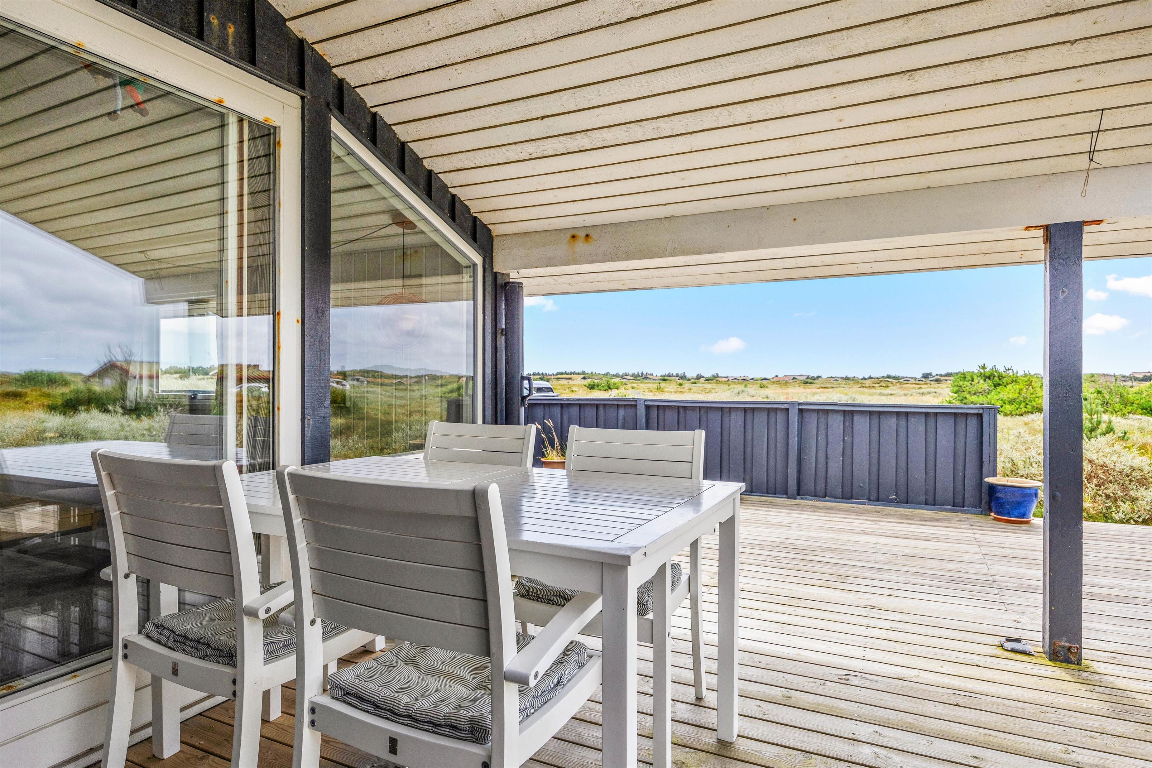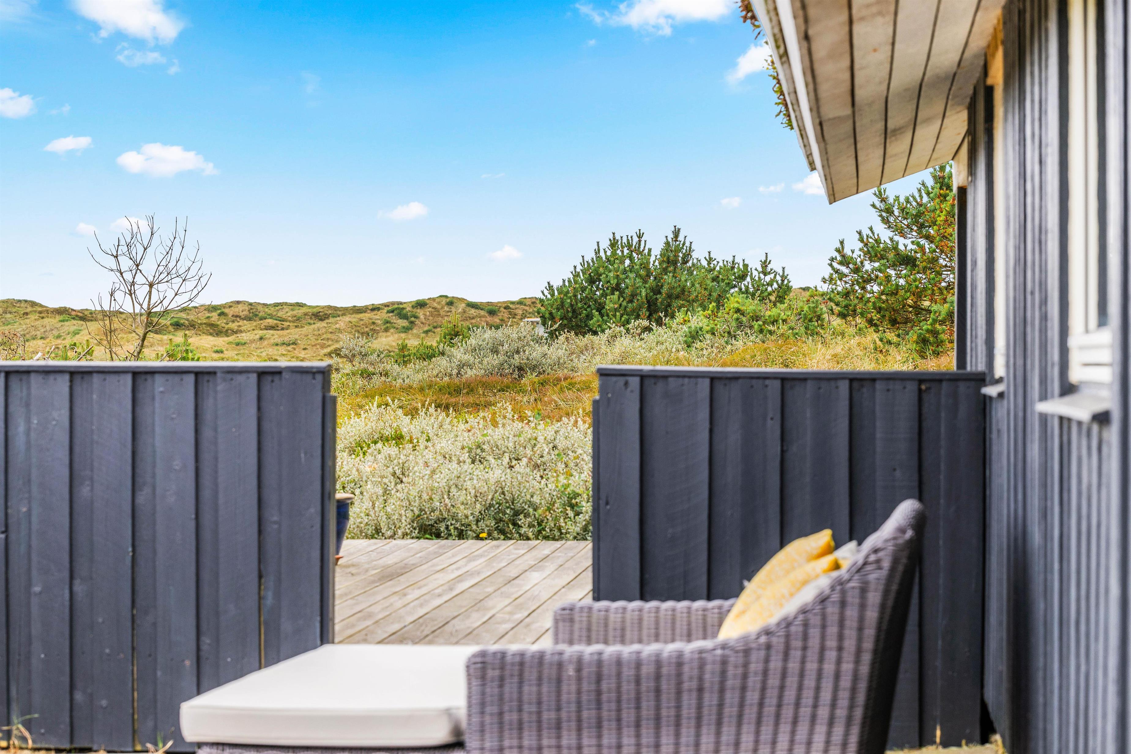 Im Außenbereich bieten die teilweise überdachten und geschützten Terrassen rund um das Haus auf dem Natur- und Dünengrundstück mehrere tolle Plätze, um auf den Gartenmöbeln zu entspannen und das Leben zu genießen und auf dem Gasgrill leckere Speisen zuzubereiten.