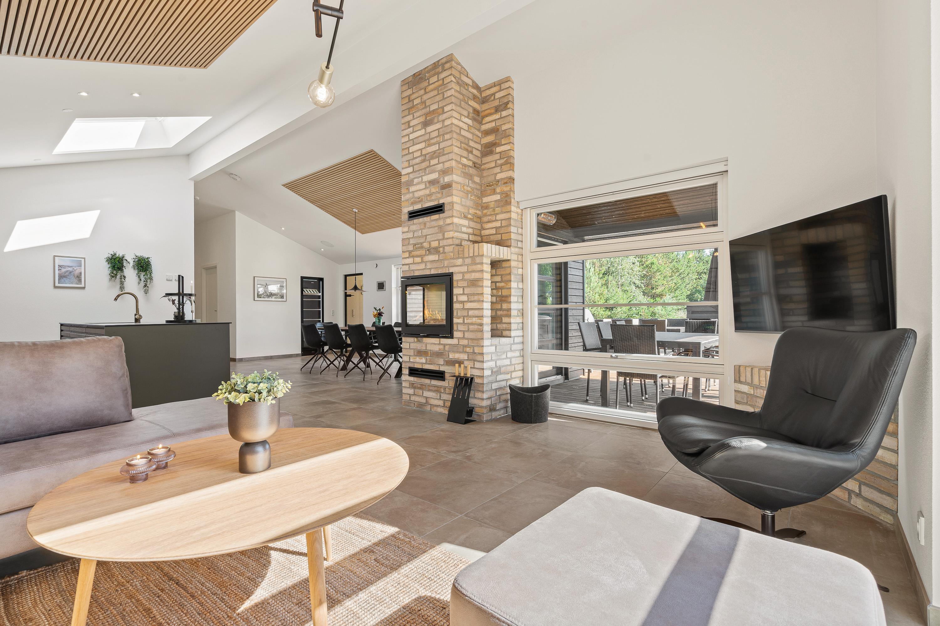 The built-in fireplace with its brick chimney serves as a striking focal point, providing not only warmth but authentic Nordic 'hygge' with its dancing flames. It's positioned in the living area to be visible from all angles.