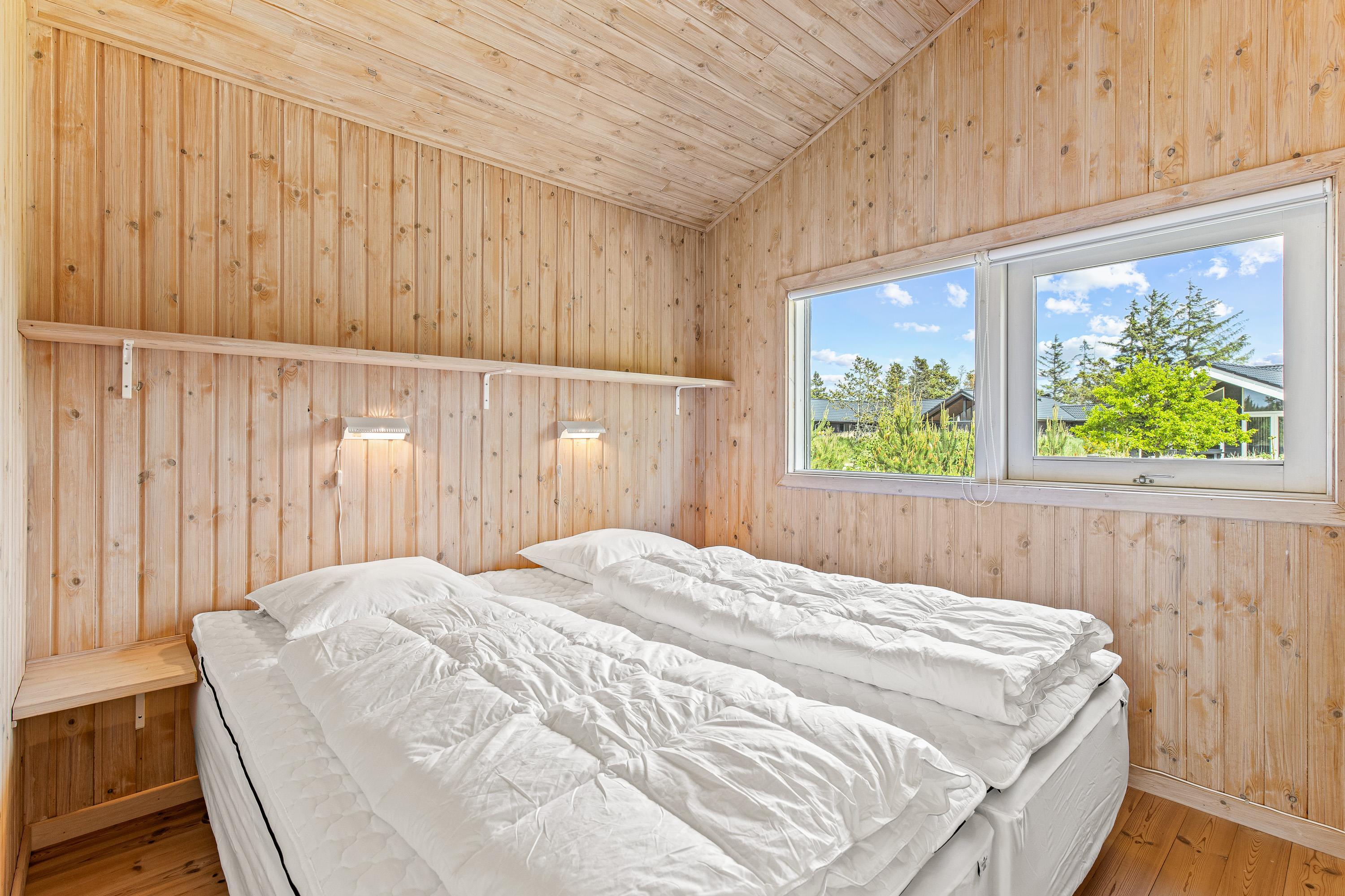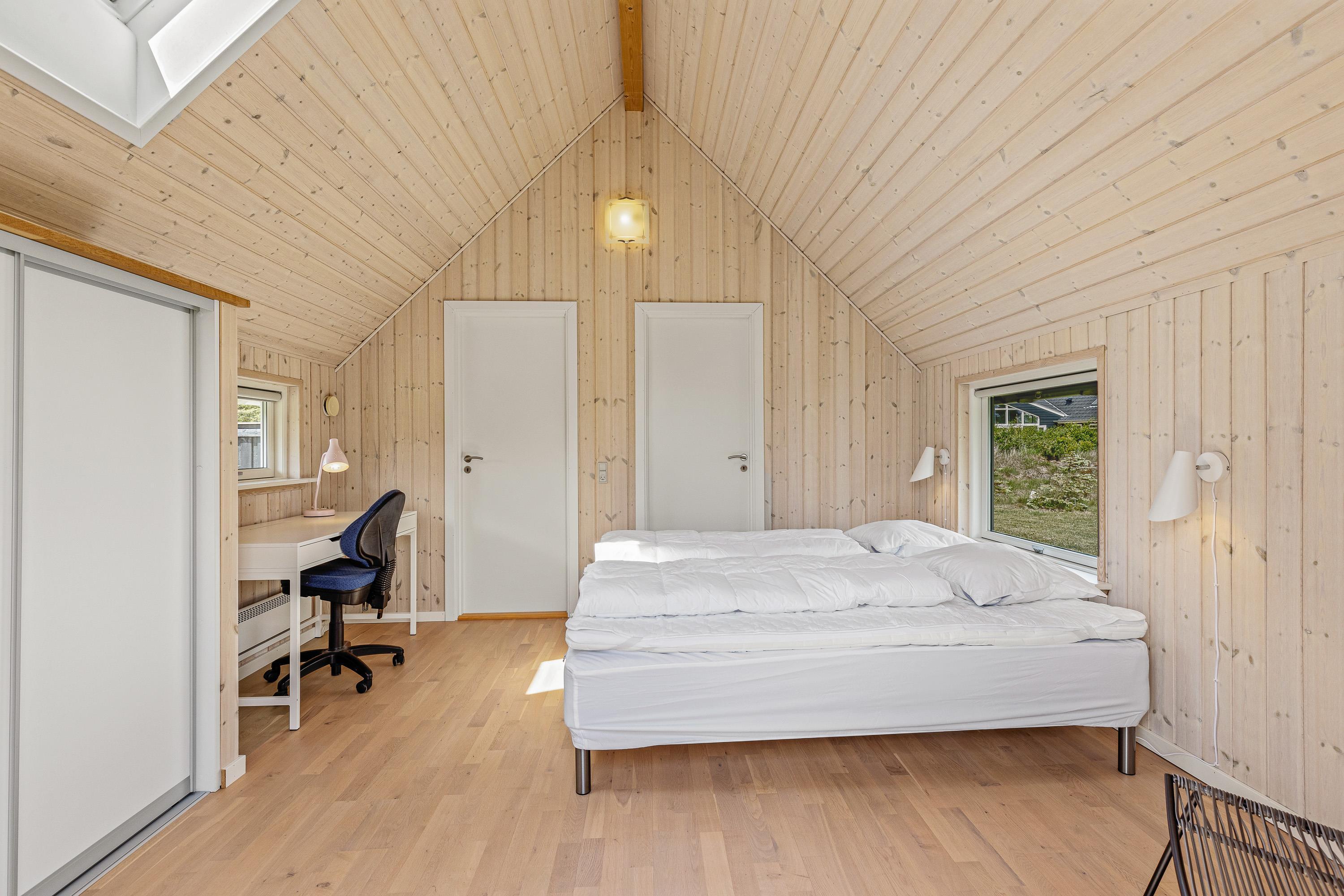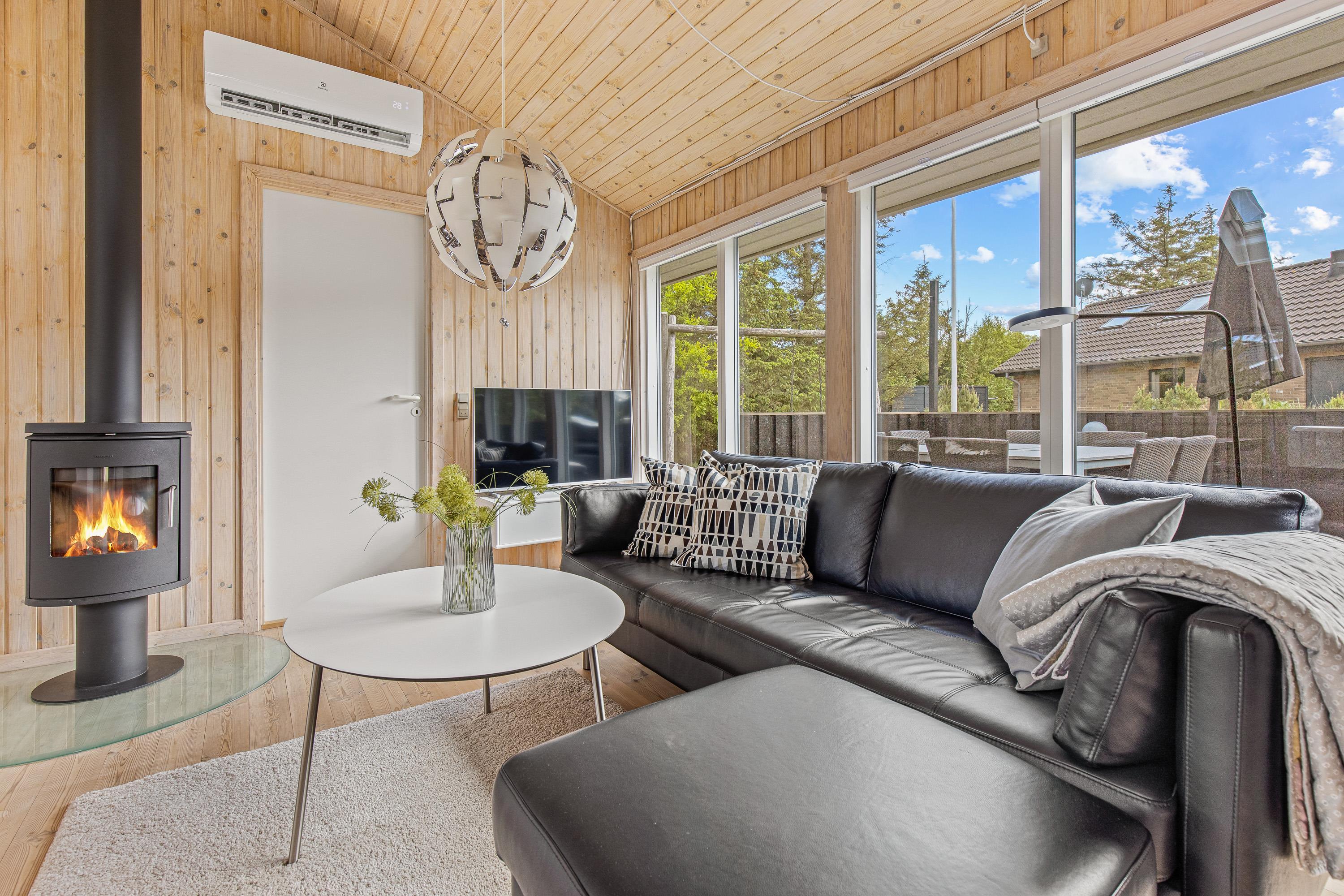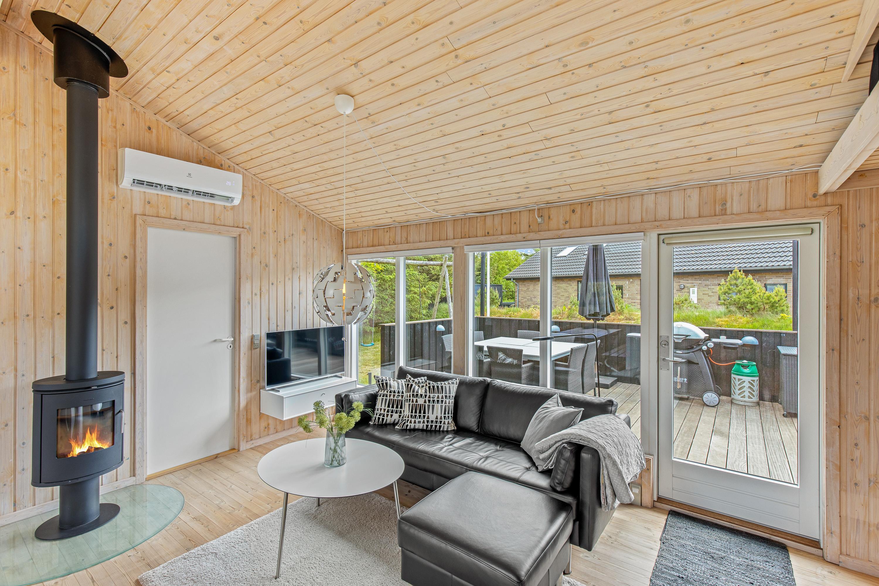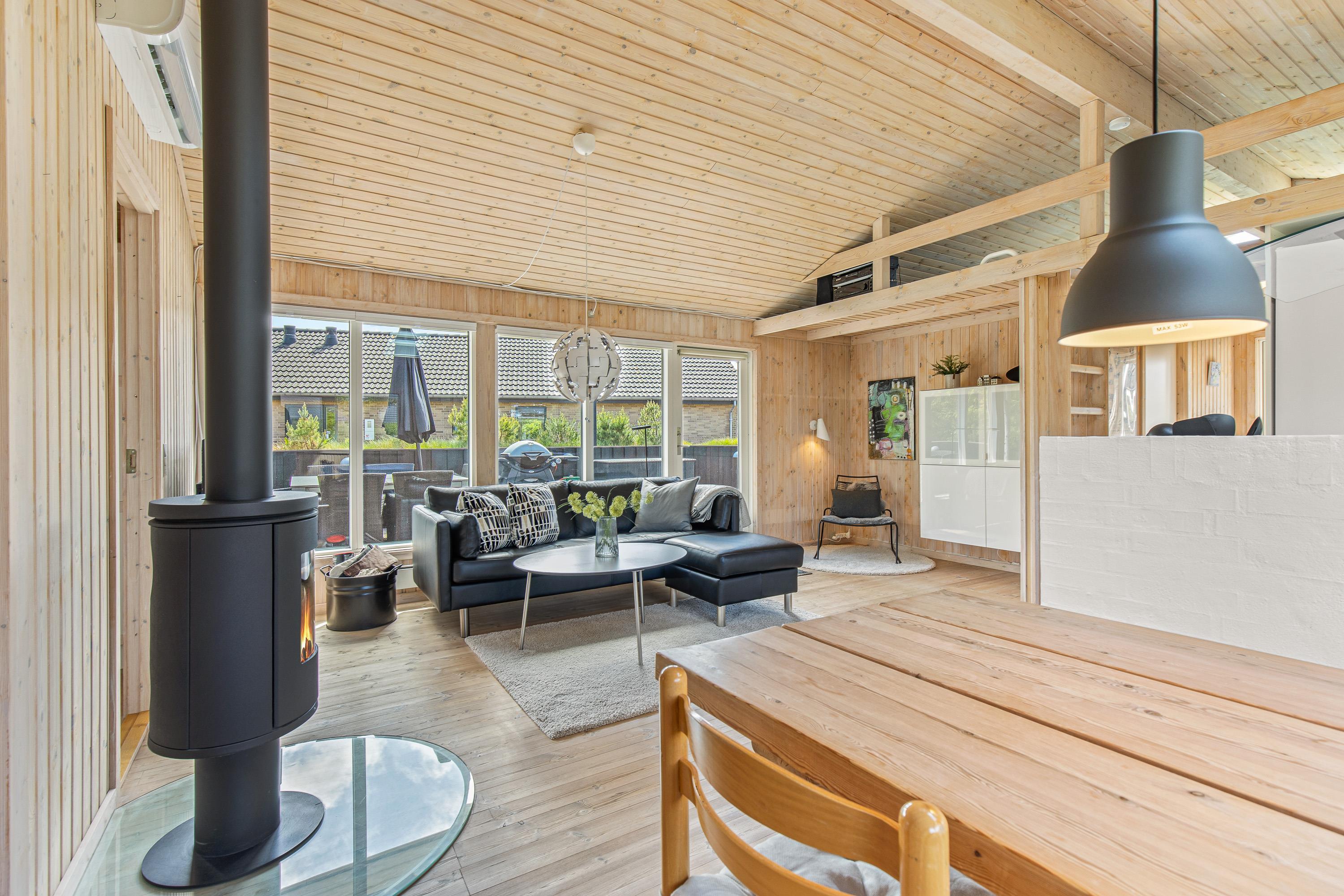 The holiday home features a high, open-plan living and dining area with kitchen space, made bright and welcoming by the skylight window. The 64-square-metre holiday home includes a bathroom with underfloor heating and 3 bedrooms. During cooler weather, you can light the wood-burning stove and enjoy watching television or reading a good book by the crackling fire. Free internet connection is also provided.