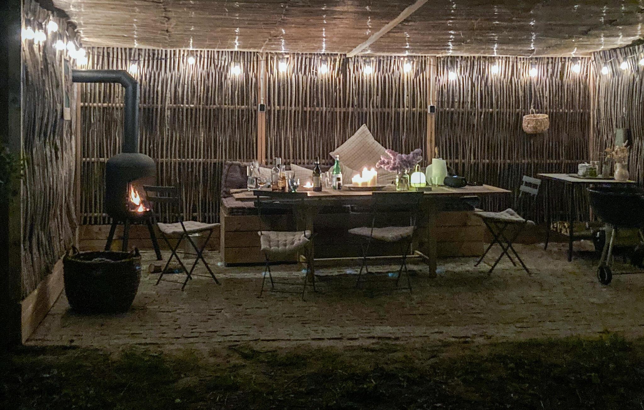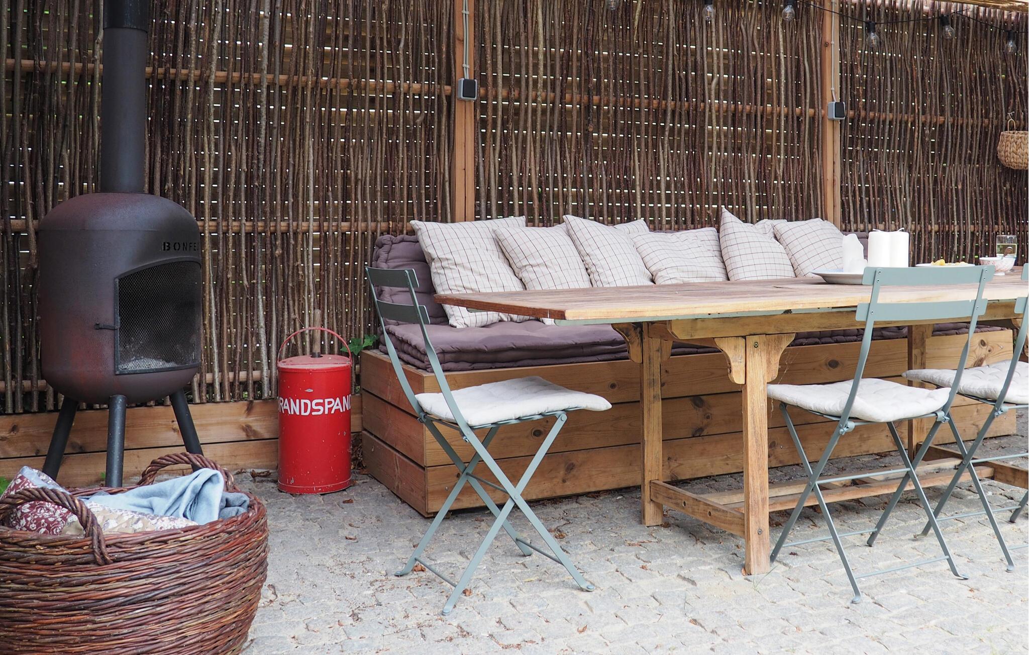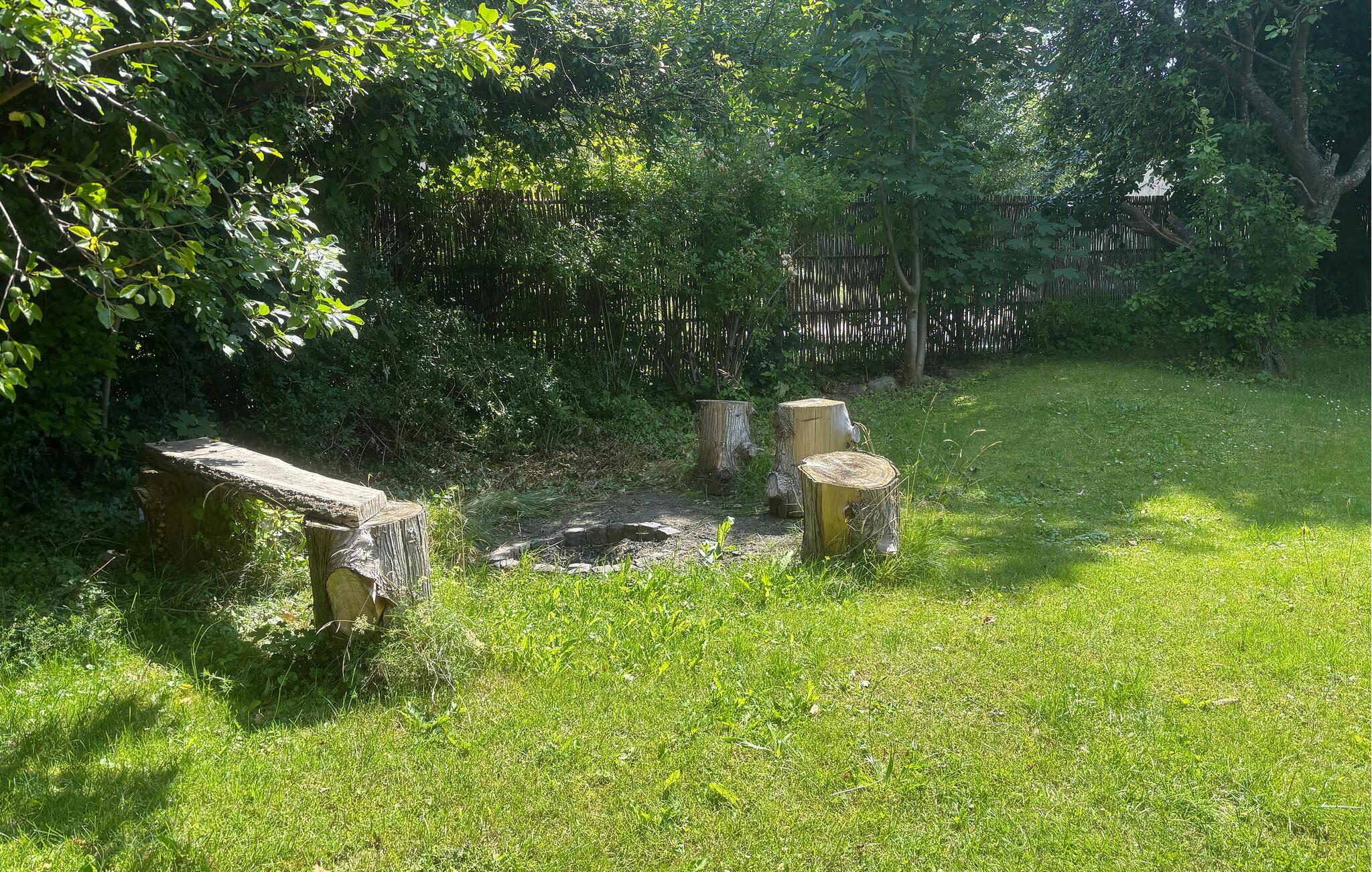 Tilbring mange timer i det lune uteområdet. Sitt i ly for vinden på den polstrede benken under den overbygde terrassen med tretak og sideskjerm i naturmateriale. På kjølige kvelder kan du fyre opp i ovnen. Den romslige hagen med plen gir plass til lek eller avslapning. Bruk bålplassen med enkle sitteplasser laget av vedkubber for en fredelig avslutning på dagen.