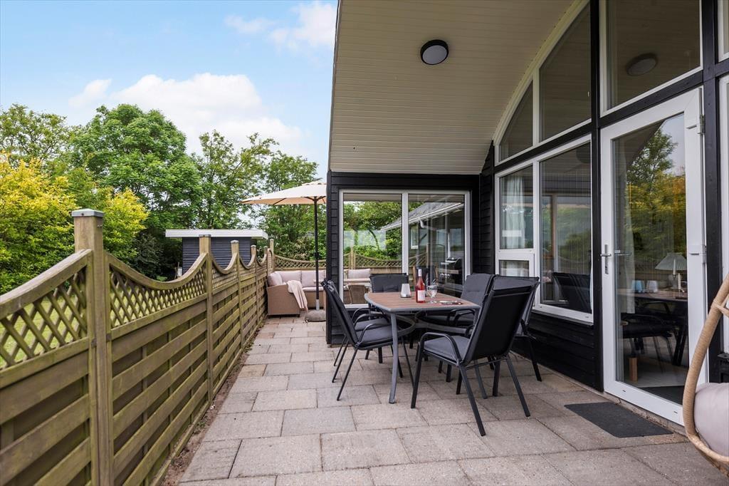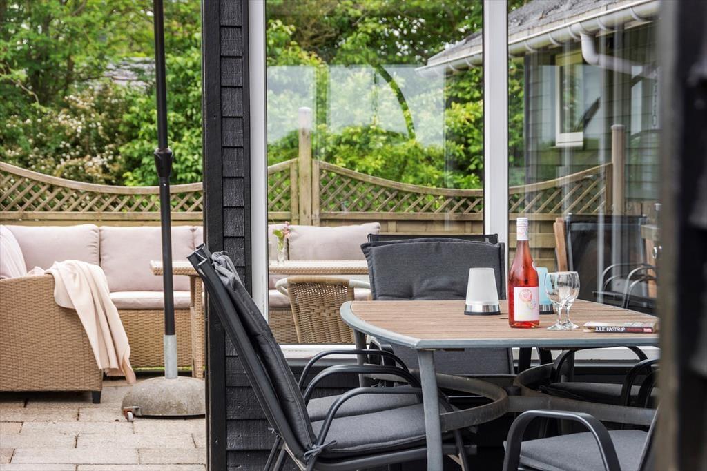 Vom Wohnzimmer aus trittst du direkt hinaus auf eine großzügig bemessene, nach Süden ausgerichtete Terrasse, auf der du das entspannte Urlaubsleben in vollen Zügen genießt. Nichts spricht auf dieser Terrasse gegen tägliche Mahlzeiten an der frischen Luft, gegen Entspannung mit einem Buch in der Sonne und gegen ruhige Momente, in denen du beim Anblick des Grüns ringsum die Seele baumeln lässt. Die Terrasse ist teilweise überdacht und von einem geschlossenen Zaun umgeben - ein Umstand, den insbesondere Eltern abenteuerlustiger Kleinkinder und Hundebesitzer sehr zu schätzen wissen. Morgens, wenn du dich beim Zwitschern der Vögel mit einem frischen Becher Kaffee im Freien niederlässt, spürst du, wie dich eine herrliche innere Ruhe erfüllt. Gleiches gilt dann, wenn du es dir am Abend mit einer warmen Decke unter dem funkelnden Sternenzelt gemütlich machst. Beste Urlaubsstimmung ist dir hier garantiert!