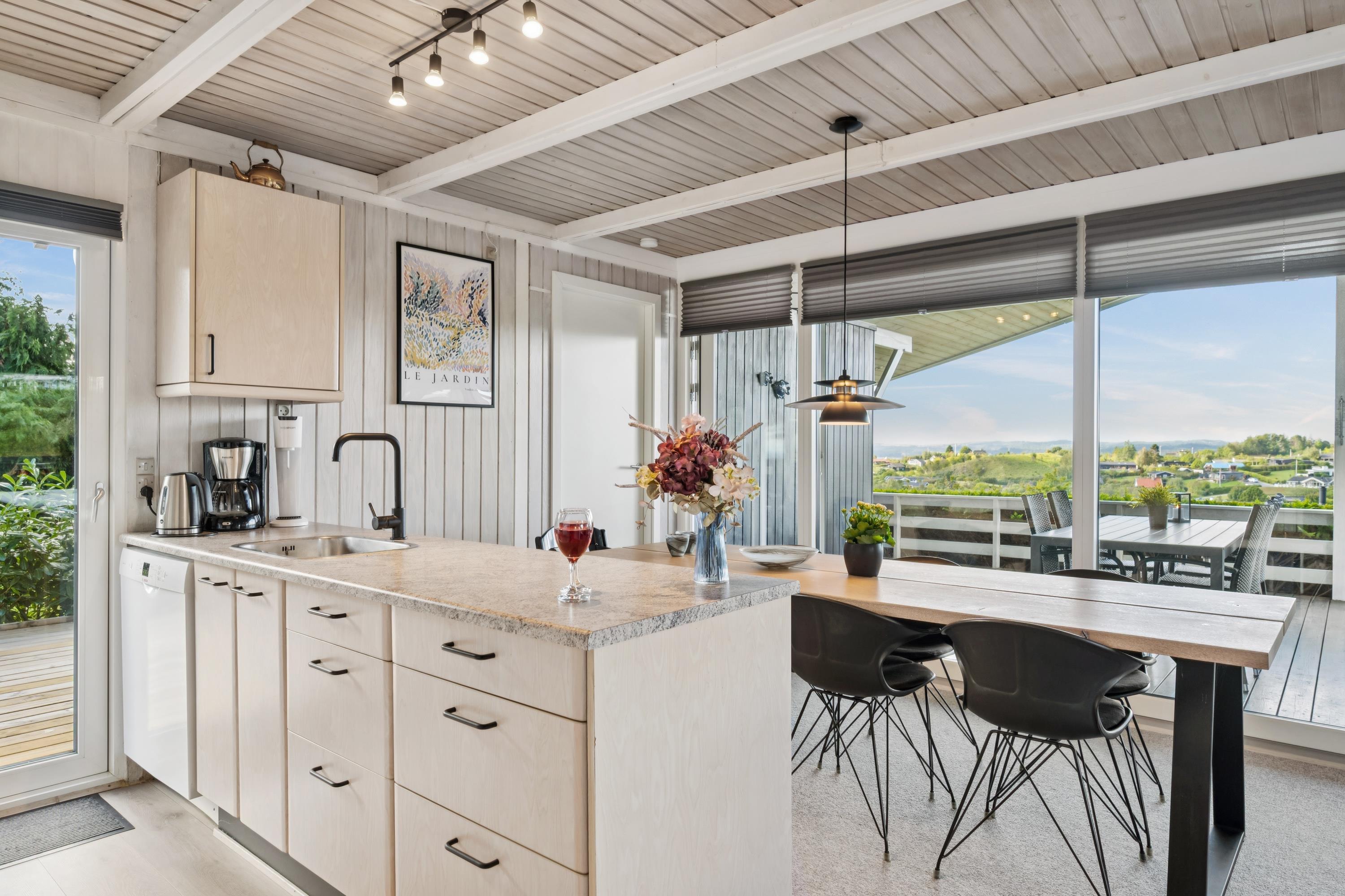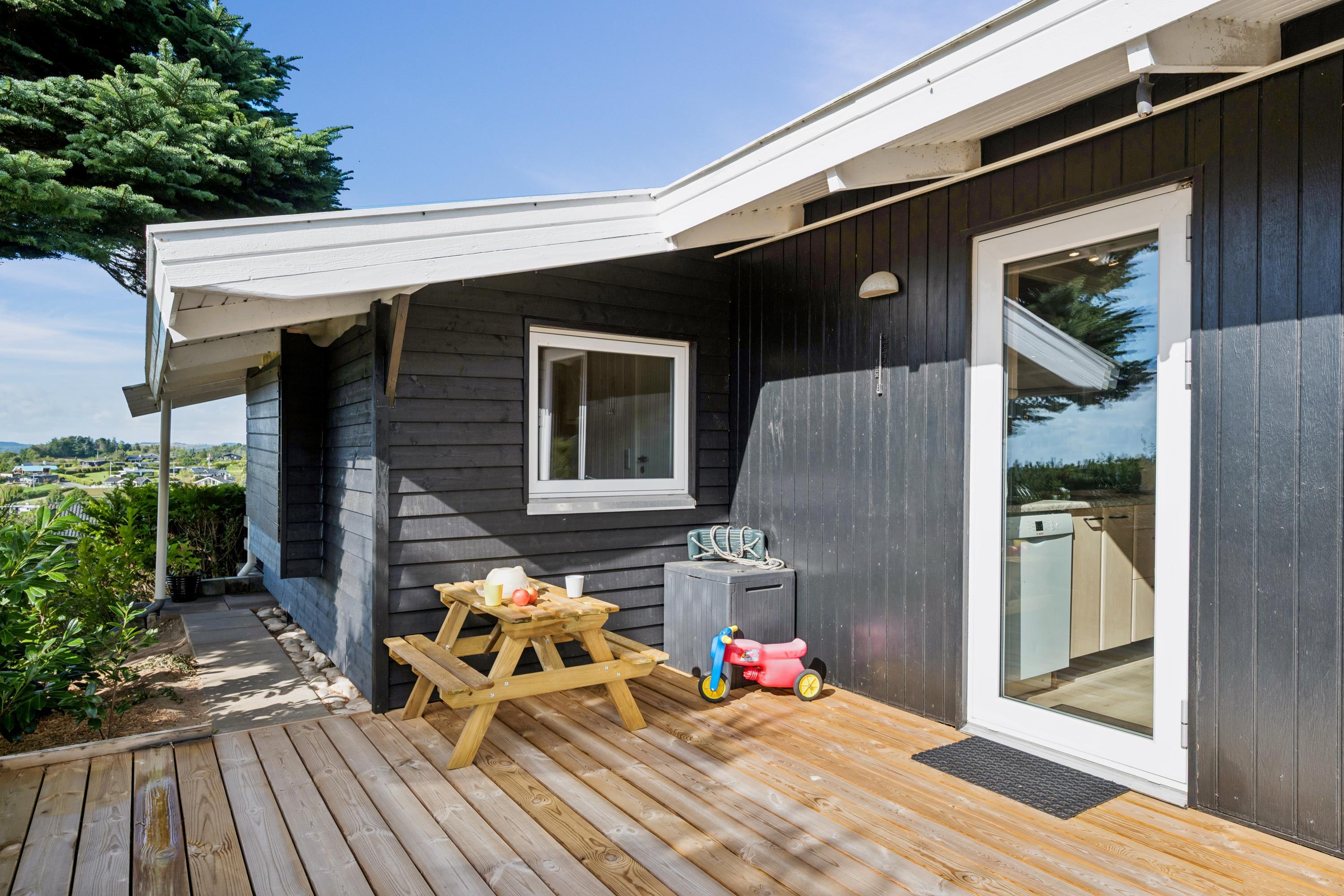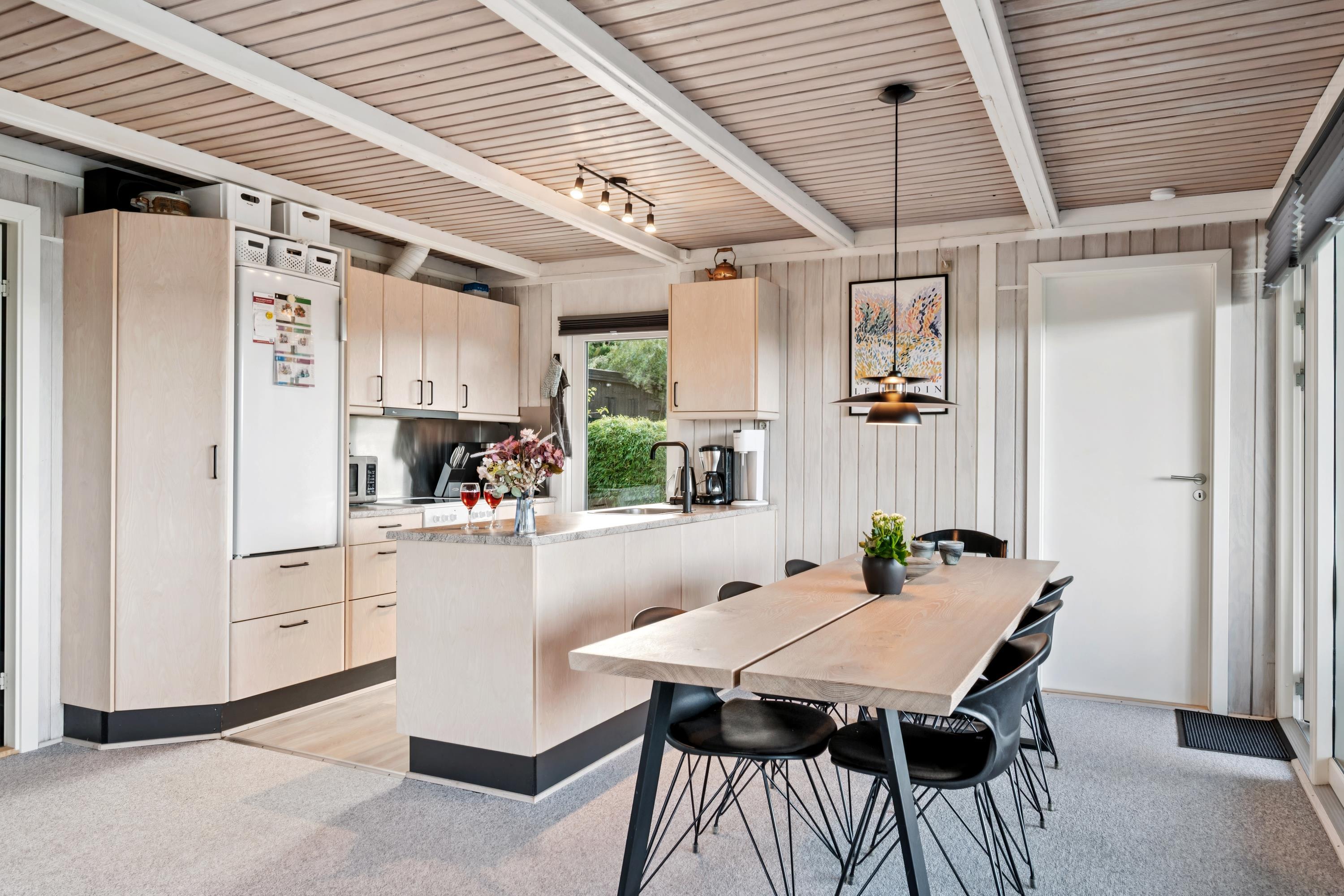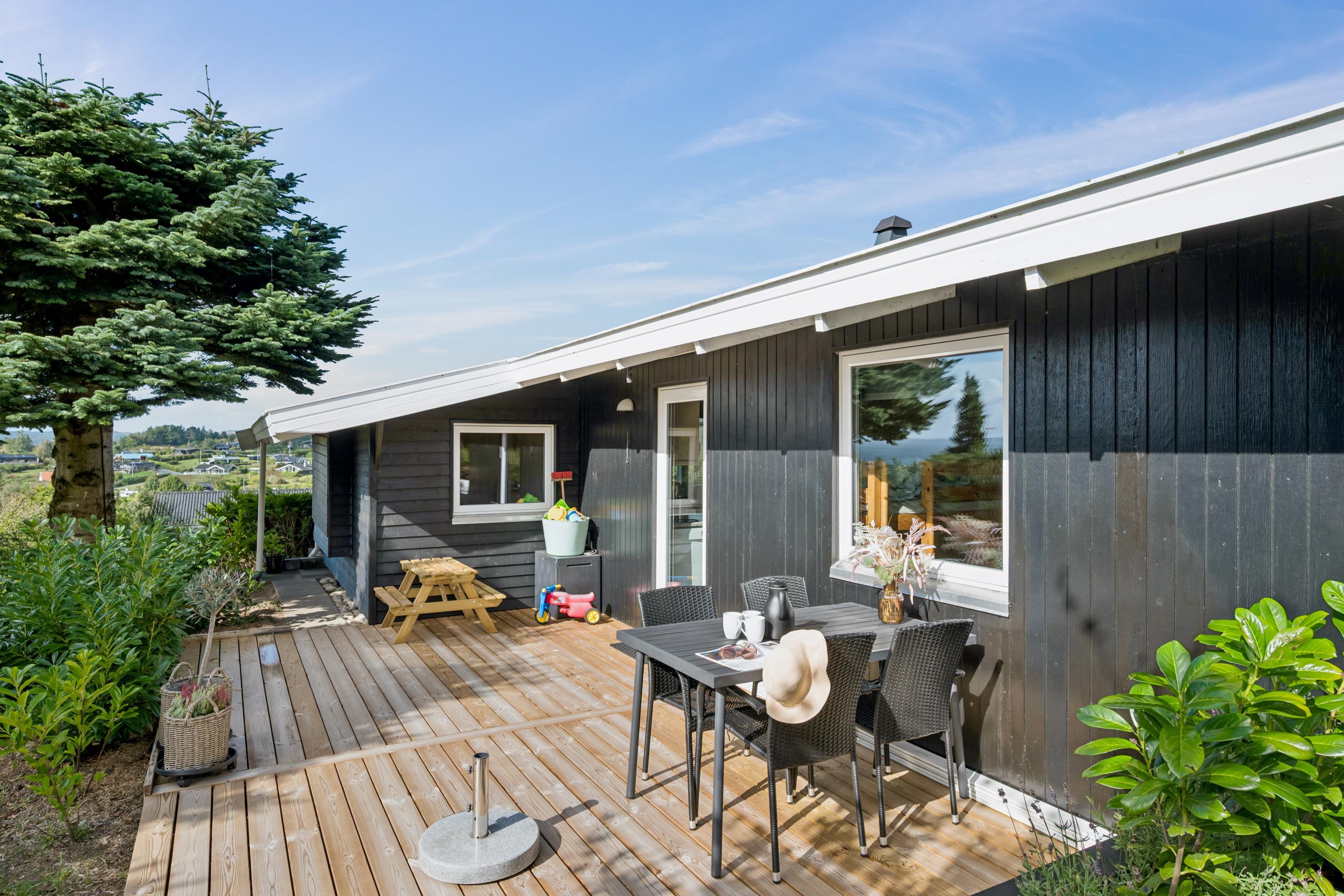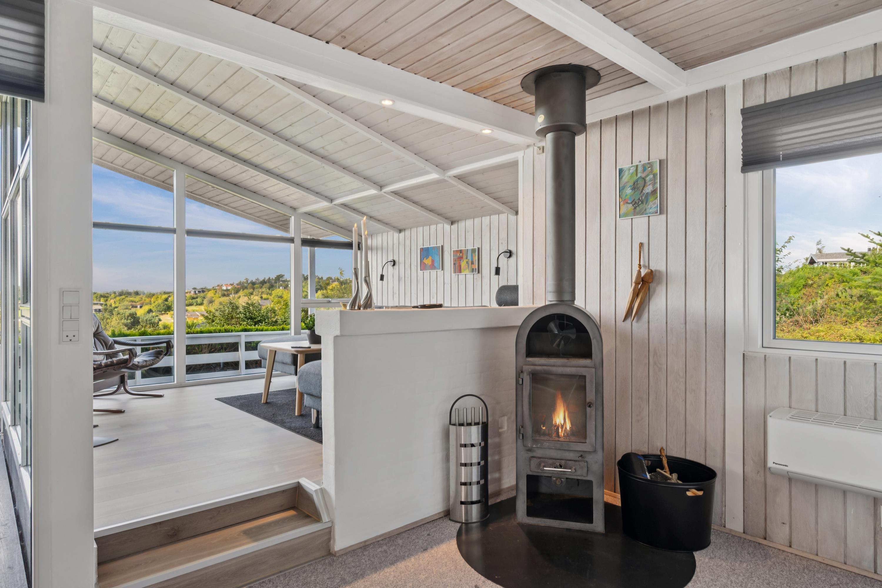 Welcome to this cozy and well-maintained holiday home. The tastefully furnished living room offers a stunning view of the water. The well-equipped kitchen includes a dishwasher and has direct access to a lovely terrace with garden furniture. Next to the kitchen, you will find a charming dining room with a wood-burning stove and a heat pump – from here, there is also access to a covered terrace with garden furniture. The bathroom is neat and modern with a shower and a washing machine.