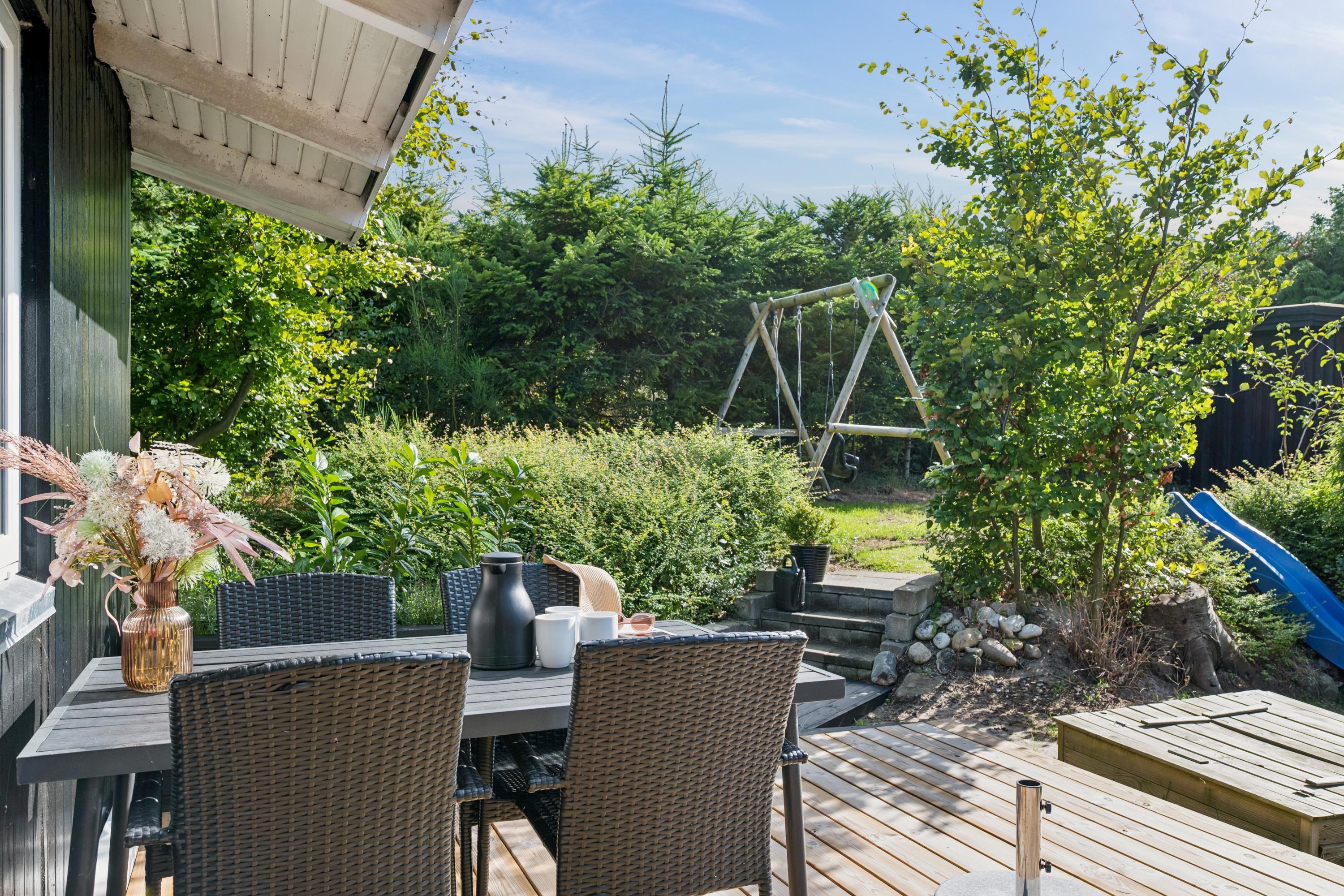 The house offers sleeping accommodation in three good bedrooms. For younger holiday guests, a highchair and cot are available. The property is elevated on a well-kept plot with a large lawn. Several sheltered terraces with garden furniture invite you to relax, while children will enjoy the swings, sandbox, and slide. If you are travelling with more families who wish to stay close to each other, five additional houses on the same street are available for rent.