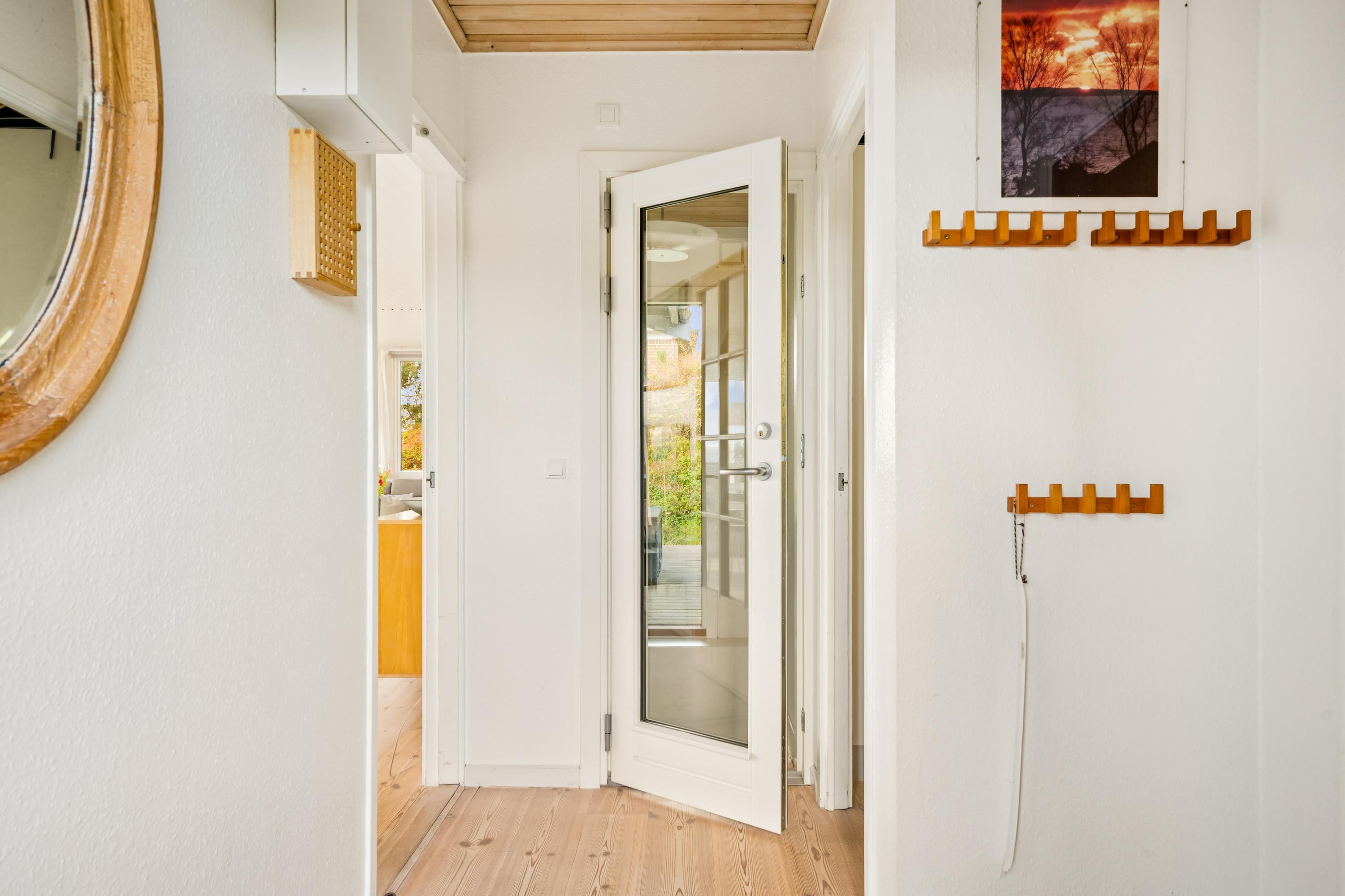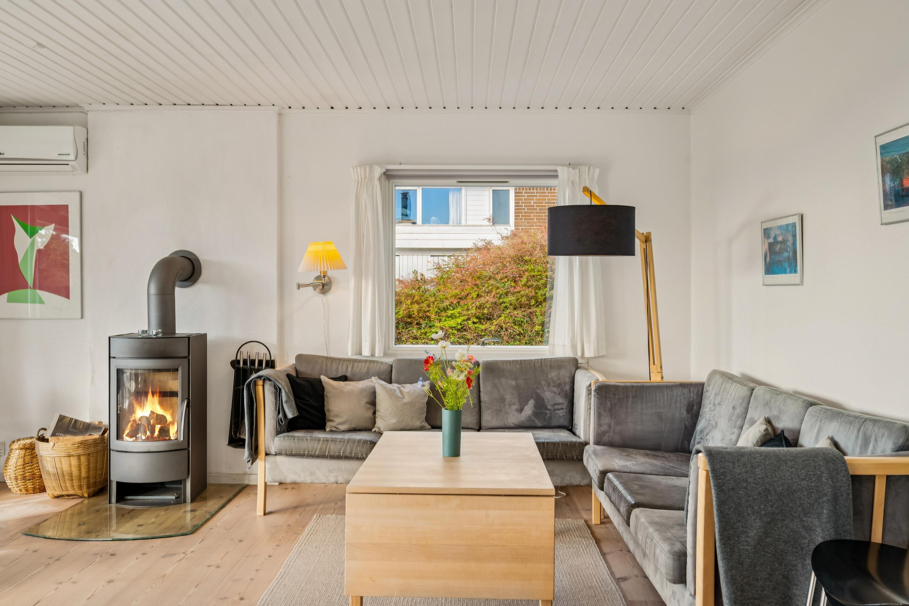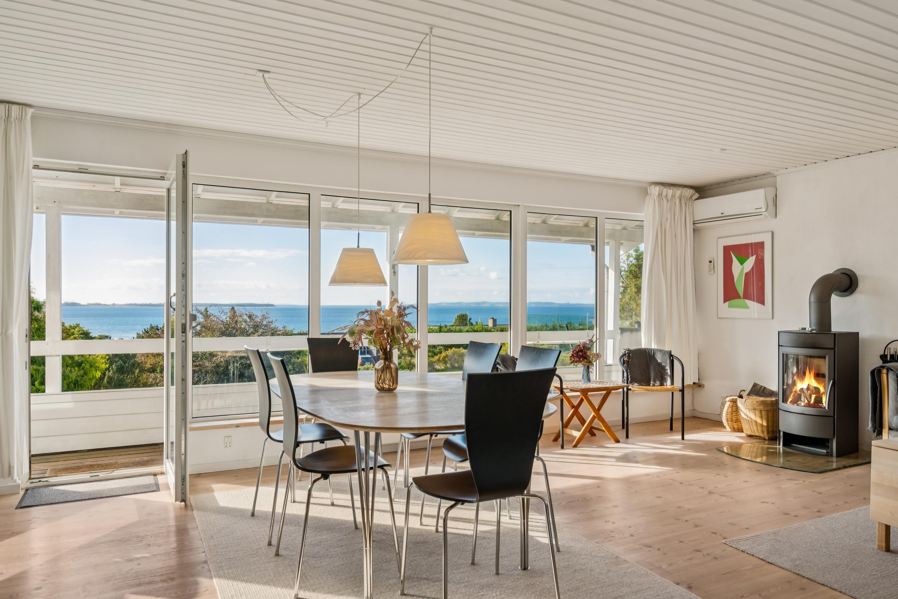 Situated in an elevated position with a stunning view over Ebeltoft Bay, this older yet charming holiday home with a swimming pool offers everything for a relaxing stay. The house is spread over two floors. On the upper floor, you’ll find a spacious living room with a wood-burning stove and heat pump. From the living room, there is access to a balcony leading out to a lovely terrace with garden furniture. Adjacent to the living room is a well-equipped kitchen, including a dishwasher. There are three bedrooms – two with single beds and one with a double bed. Nice bathroom with shower, underfloor heating, washing machine, and tumble dryer.